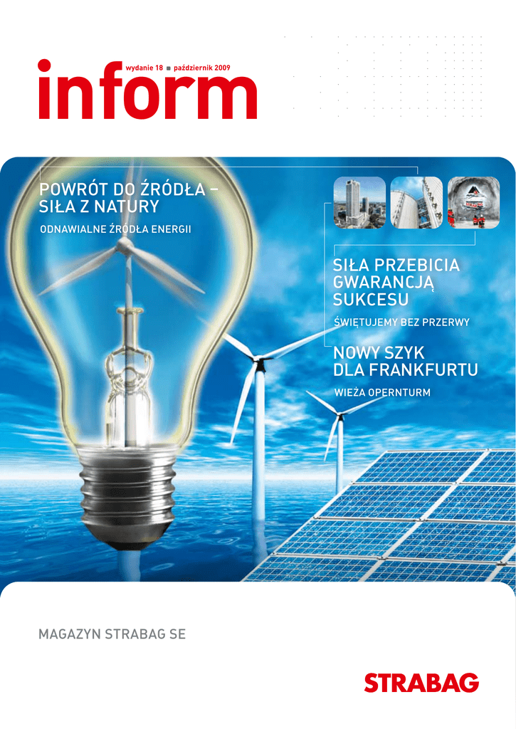 inform wydanie 18 październik 2009 POWRÓT DO ŹRÓDŁA – SIŁA Z NATURY ODNAWIALNE ŹRÓDŁA ENERGII SIŁA PRZEBICIA GWARANCJĄ SUKCESU ŚWIĘTUJEMY BEZ PRZERWY NOWY SZYK DLA FRANKFURTU WIEŻA OPERNTURM MAGAZYN STRABAG SE Słowo wstępne inform 18 Słowo wstępne Szanowni Państwo! dalszą egzystencję firmy, a co za tym idzie miejsca pracy dla większości z nas, jesteśmy zmuszeni do ich podejmowania, gdy zostają uznane one za konieczne. Hans Peter Haselsteiner Prezes Zarządu STRABAG SE Kryzys, w jakim od około roku tkwi gospodarka, jest nadal poważny i okropny. Niepokoi, rozbudza lęki egzystencjalne i miliony ludzi rzuca w objęcia bezrobocia i biedy (tylko w UE to dotychczas ponad 30 milionów!!). Gdy ustanie, każdy z nas będzie nim, jeśli nie bezpośrednio dotknięty, to w jakiś sposób naznaczony, i dla mało kogo będzie to miłe doznanie. Spowoduje konieczność ponownego zdefiniowania pojęcia sprawiedliwości dystrybutywnej oraz – nie chcąc ryzykować spoistości naszego społeczeństwa – zmusi nas do określenia nowego rodzaju solidarności z pokrzywdzonymi. Niestety nie mogę podzielić optymizmu niektórych mówiących już o koniunkturze, a liczę się z ogólnym depresyjnym nastrojem przynajmniej do końca 2010 roku. W sektorze gospodarki budowlanej kryzys osiągnie apogeum dopiero po zakończeniu programów koniunkturalnych w 2012. Będąc członkami rodziny STRABAG możemy czuć się szczęśliwi z powodu naszej kryzysowej odporności. Stworzona przez nas „zasada stonogi” pozwala na rozłożenie ryzyka na poszczególne regiony i branże. Dywersyfikacja obejmująca wszystkie płaszczyzny działalności przedsiębiorstwa wraz z dywersyfikacją geograficzną będą tematami poruszanymi również w niniejszym wydaniu informu. Temat z okładki „Powrót do źródła – Siła z natury” stanowi nasze portfolio w zakresie technologii ochrony środowiska naturalnego. Firma STRABAG rozpoznała w porę to znaczenie, wykonując pionierską robotę w dziedzinie biomasy, biogazu, energii wiatru (on-shore i off-shore), zabezpieczania wysypisk śmieci czy geotermii. Jednak mimo wszelkich starań o nowe pola działania i nowe rynki, także firma STRABAG była zmuszona do dostosowania poziomu zdolności wytwórczej. Dotknęło to zwłaszcza Węgier, Rumunii, Serbii i Rosji. W prawie wszystkich pozostałych krajach sytuacja pogarsza się, jednak nakłady inwestycyjne udaje się jeszcze utrzymać względnie dobrym poziomie. Ubolewamy nad każdym utraconym miejscem pracy, ponieważ wiąże się z tym los jednego z nas. Jako że kroki takie są nieodzowne, chcąc zapewnić 02 Oprócz niechcianego, lecz koniecznego dostosowywania poziomu zdolności wytwórczej, głównym i akurat w tych czasach wyjątkowo ważkim tematem jest „unikanie flopów”. Peter Fischer, kierownik Contract Managementu, wskazuje w swym artykule jednoznacznie, gdzie leży przyczyna tych niepowodzeń w naszym przedsiębiorstwie: 66% wszystkich „wpadek” spowodowanych jest błędami w zarządzaniu. Fałszywa duma w postaci niechęci do słuchania rad przyczynia się w dużej mierze do strat sięgających ponad 300 mln., jakie ponosimy na skutek takich wpadek. Zwracam się do Was z pilna prośbą do korzystania z doradztwa, jakie oferuje obszar sztabu koncernu „Contract Management” i proszę Was o stałe uczenie się sztuki wyciągania wniosków z popełnianych błędów. Każdy z nas musi być gotowy przyznać się do błędu, aby inni mogli wyciągnąć z tego lekcję dla siebie. Popełnianie błędów jest bolesne, ale wybaczalne, powtórzenie tego samego błędu jest już głupotą i nie ma na to miejsca w naszym koncernie! Szanowni Państwo! Nawet jeśli rok 2009 nie pozostawi w naszym bilansie żadnych śladów kryzysu, a portfel niezrealizowanych zamówień na rok 2010 dotyczy robót budowlanych przewidzianych na ten rok, musimy być przygotowani na ciężkie czasy. Będą one wymagały od nas przede wszystkim jeszcze większej dyscypliny, jeszcze więcej wysiłku i więcej elastyczności. Być może konieczna okaże się też większa skromność, w każdym razie pokonamy ten kryzys i z odrobiną szczęścia oraz wzmocnieni Waszym nieodzownym wkładem i zaangażowaniem wyjdziemy z niego obronną ręką! Wasz Hans Peter Haselsteiner www.strabag.com inform 18 Spis treści SPIS TREŚCI NOWOŚCI 04 STRABAG SIĘGA GWIAZD Sztuka i artyści 06 SĄ POWODY DO ŚWIĘTOWANIA Obchody 08 DO DZIEŁA! Walne zgromadzenie spółki STRABAG 09WROTA ZOSTAŁY OTWARTE Pawilon P 10 15 LAT MODELU PARTNERSKIEGO Koncepcja zespołowa 11 BYŁO NA CO POPATRZEĆ Targi Wasser Berlin 2009 11 DLA ŚRODOWISKA I/44 Północna Przełęcz w Jesenikach TEMAT Z OKŁADKI 12POWRÓT DO ŹRÓDŁA – SIŁA Z NATURY Odnawialne źródła energii LUDZIE W FIRMIE STRABAG 20WSZYSTKO JAKBY TROCHĘ INACZEJ Pracownicy STRABAG w świetle jupiterów Strabag units 24NOWE SPOSOBY UNIKANIA FLOPÓW Contract Management 26 STRABAG STAWIA NA NOWE NARZĘDZIA SCOT & STRAthek PROJEKTY 28NOWY SZYK DLA FRANKFURTU Wieża Opernturm 30 MIASTO W MIEŚCIE Siemens City 31 SYMBOL KOLONII Budynek „Kranhaus Süd” 32PIONIERZY W AKCJI Zbiorniki LNG 33NOWOCZESNY KLIMAT W STARYM STYLU Ulica Roberta Bluma 33 KOMPLEKS BIUROWCÓW Z LOTU PTAKA Hegau Tower 34 BEZPIECZNA PERŁA Scharbeutz 35PAS DŁUGOŚCI 83 KM Obwodnica w Pradze 36WIZJE MODERNIZACJI Lotnisko w Bratysławie 37WYCZYN NA MIARĘ BOHATERA DA315 38NOWOCZESNE TECHNOLOGIE NA OBRZEŻACH Ekrany akustyczne 39WIĘCEJ NIŻ BUDOWANIE Property and Facility Services 40 SIŁA PRZEBICIA GWARANCJĄ SUKCESU Świętujemy bez przerwy 42 550 POCIĄGÓW W PODZIEMIACH STOCKHOLUMU Tunel Söderstrom Events 44NADAJEMY TEMPO STRAtria & JP Morgan Run S PECIALS 46 RUNDA HONOROWA W UKŁADARCE ASFALTU Serdeczne gratulacje 46 MALI ARTYŚCI Konkurs rysunkowy 47POSZUKUJEMY MŁODYCH TALENTÓW STRABAG 47WASZA OPINIA JEST DLA NAS WAŻNA Listy czytelników 03 Nowości inform 18 News SZTUKA I ARTYŚCI GWIEZDNA KATEDRA I PODWODNY ŚW
