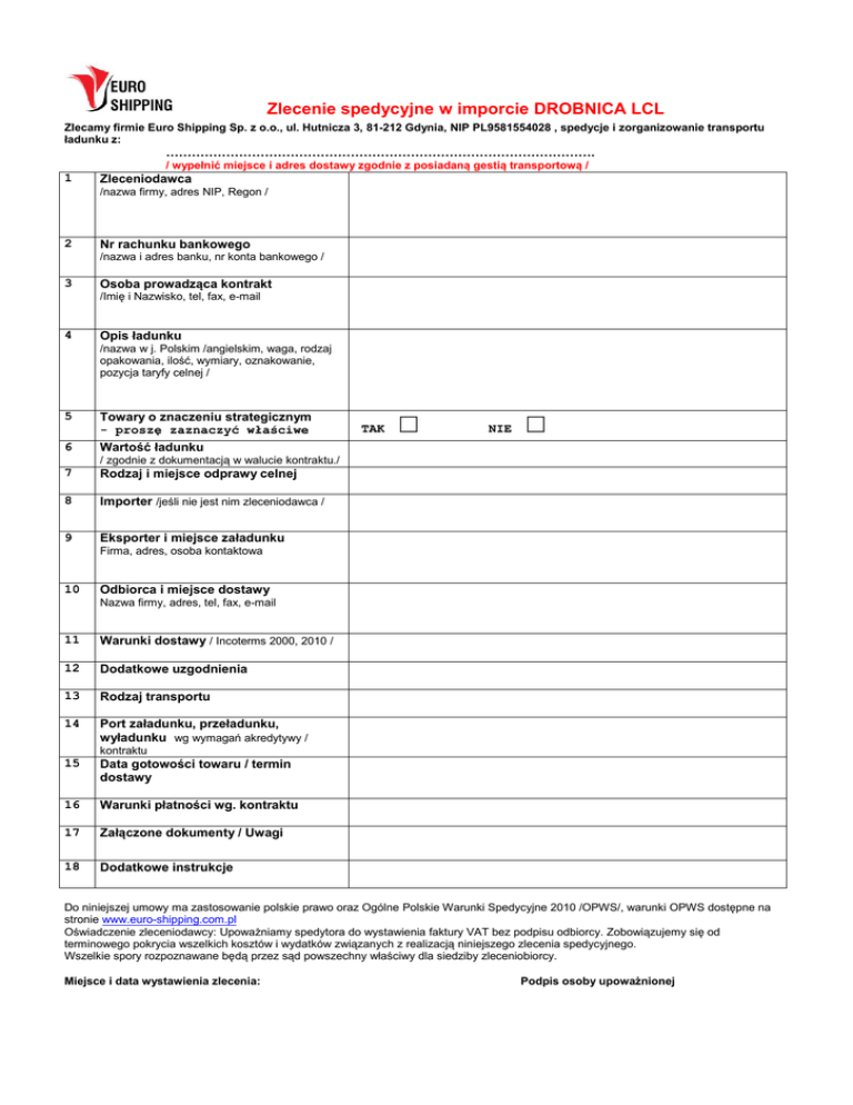 Zlecenie spedycyjne w imporcie DROBNICA LCL Zlecamy firmie Euro Shipping Sp. z o.o., ul. Hutnicza 3, 81-212 Gdynia, NIP PL9581554028 , spedycje i zorganizowanie transportu ładunku z: ………………………………………………………………………………………. / wypełnić miejsce i adres dostawy zgodnie z posiadaną gestią transportową / 1 Zleceniodawca /nazwa firmy, adres NIP, Regon / 2 Nr rachunku bankowego /nazwa i adres banku, nr konta bankowego / 3 Osoba prowadząca kontrakt /Imię i Nazwisko, tel, fax, e-mail 4 Opis ładunku /nazwa w j. Polskim /angielskim, waga, rodzaj opakowania, ilość, wymiary, oznakowanie, pozycja taryfy celnej / 5 Towary o znaczeniu strategicznym - proszę zaznaczyć właściwe 6 Wartość ładunku TAK □ NIE □ / zgodnie z dokumentacją w walucie kontraktu./ 7 Rodzaj i miejsce odprawy celnej 8 Importer /jeśli nie jest nim zleceniodawca / 9 Eksporter i miejsce załadunku Firma, adres, osoba kontaktowa 10 Odbiorca i miejsce dostawy Nazwa firmy, adres, tel, fax, e-mail 11 Warunki dostawy / Incoterms 2000, 2010 / 12 Dodatkowe uzgodnienia 13 Rodzaj transportu 14 Port załadunku, przeładunku, wyładunku wg wymagań akredytywy / kontraktu 15 Data gotowości towaru / termin dostawy 16 Warunki płatności wg. kontraktu 17 Załączone dokumenty / Uwagi 18 Dodatkowe instrukcje Do niniejszej umowy ma zastosowanie polskie prawo oraz Ogólne Polskie Warunki Spedycyjne 2010 /OPWS/, warunki OPWS dostępne na stronie www.euro-shipping.com.pl Oświadczenie zleceniodawcy: Upoważniamy spedytora do wystawienia faktury VAT bez podpisu odbiorcy. Zobowiązujemy się od terminowego pokrycia wszelkich kosztów i wydatków związanych z realizacją niniejszego zlecenia spedycyjnego. Wszelkie spory rozpoznawane będą przez sąd powszechny właściwy dla siedziby zleceniobiorcy. Miejsce i data wystawienia zlecenia: Podpis osoby upoważnionej