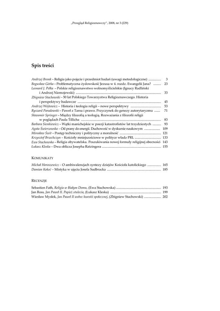 „Przegląd Religioznawczy”, 2008, nr 3 (229) Spis treści Andrzej Bronk – Religia jako pojęcie i przedmiot badań (uwagi metodologiczne) ............... Bogusław Górka – Problematyczna żydowskość Jezusa w 4. rozdz. Ewangelii Jana? ......... Leonard J. Pełka – Polskie religioznawstwo wolnomyślicielskie (Ignacy Radliński i Andrzej Niemojewski) ..................................................................................................... Zbigniew Stachowski – 50 lat Polskiego Towarzystwa Religioznawczego. Historia i perspektywy badawcze ................................................................................................... Andrzej Wójtowicz – Historia i teologia religii – nowe perspektywy .................................... Ryszard Paradowski – Paweł z Tarsu i prawo. Przyczynek do genezy autorytaryzmu ....... Sławomir Springer – Między filozofią a teologią. Rozważania z filozofii religii w poglądach Paula Tillicha ............................................................................................... Barbara Sienkiewicz – Wątki manichejskie w poezji katastrofistów lat trzydziestych .......... Agata Świerzowska – Od prany do energii. Duchowość w dyskursie naukowym ................... Mirosław Świt – Postęp techniczny i polityczny a moralność ................................................. Krzysztof Brzechczyn – Kościoły mniejszościowe w polityce władz PRL ............................... Ewa Stachowska – Religia obywatelska. Poszukiwania nowej formuły religijnej obecności Łukasz Kleska – Dwa oblicza Josepha Ratzingera ...................................................................... 3 23 33 45 53 71 83 93 109 121 133 143 155 KOMUNIKATY Michał Horoszewicz – O ambiwalencjach syntezy dziejów Kościoła katolickiego ................ 165 Damian Kokoć – Mistyka w ujęciu Josefa Sudbracka ................................................................ 185 RECENZJE Sebastien Fath, Religia w Białym Domu, (Ewa Stachowska) ..................................................... 193 Jan Ross, Jan Paweł II. Papież stulecia, (Łukasz Kleska) ............................................................ 199 Wiesław Mysłek, Jan Paweł II wobec kwestii społecznej, (Zbigniew Stachowski) .................... 202