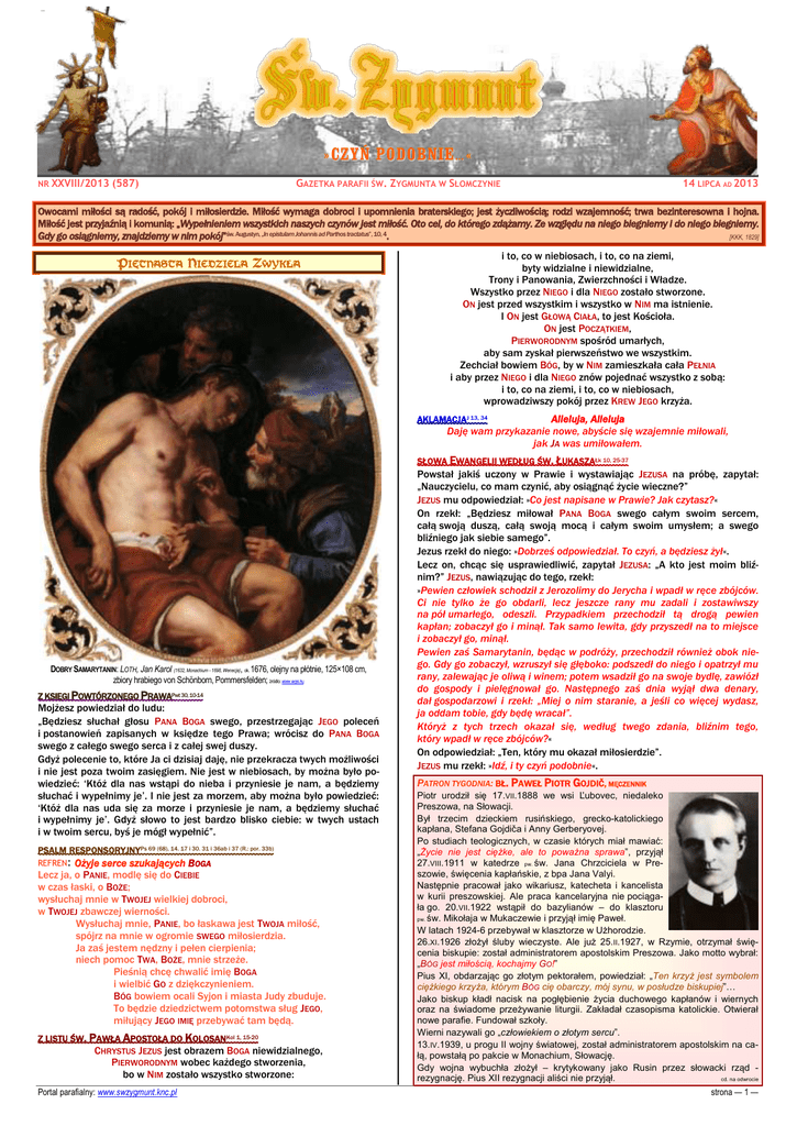»CZYŃ NR XXVIII/2013 (587) PODOBNIE…« GAZETKA PARAFII ŚW. ZYGMUNTA W SŁOMCZYNIE 14 LIPCA AD 2013 Owocami miłości są radość, pokój i miłosierdzie. Miłość wymaga dobroci i upomnienia braterskiego; jest życzliwością; rodzi wzajemność; trwa bezinteresowna i hojna. Miłość jest przyjaźnią i komunią: „Wypełnieniem wszystkich naszych czynów jest miłość. Oto cel, do którego zdążamy. Ze względu na niego biegniemy i do niego biegniemy. Gdy go osiągniemy, znajdziemy w nim pokój”św. Augustyn, „In epistulam Johannis ad Parthos tractatus”, 10, 4. [KKK, 1829] PIĘTNASTA NIEDZIELA ZWYKŁA i to, co w niebiosach, i to, co na ziemi, byty widzialne i niewidzialne, Trony i Panowania, Zwierzchności i Władze. Wszystko przez NIEGO i dla NIEGO zostało stworzone. ON jest przed wszystkim i wszystko w NIM ma istnienie. I ON jest GŁOWĄ CIAŁA, to jest Kościoła. ON jest POCZĄTKIEM, PIERWORODNYM spośród umarłych, aby sam zyskał pierwszeństwo we wszystkim. Zechciał bowiem BÓG, by w NIM zamieszkała cała PEŁNIA i aby przez NIEGO i dla NIEGO znów pojednać wszystko z sobą: i to, co na ziemi, i to, co w niebiosach, wprowadziwszy pokój przez KREW JEGO krzyża. Alleluja, Alleluja Daję wam przykazanie nowe, abyście się wzajemnie miłowali, jak JA was umiłowałem. AKLAMACJAJ 13, 34 SŁOWA EWANGELII WEDŁUG ŚW. ŁUKASZAŁk 10, 25-37 DOBRY SAMARYTANIN: LOTH, Jan Karol (1632, Monachium - 1698, Wenecja), ok. 1676, olejny na płótnie, 125×108 cm, zbiory hrabiego von Schönborn, Pommersfelden; źródło: www.wga.hu Z KSIĘGI POWTÓRZONEGO PRAWAPwt 30, 10-14 Mojżesz powiedział do ludu: „Będziesz słuchał głosu PANA BOGA swego, przestrzegając JEGO poleceń i postanowień zapisanych w księdze tego Prawa; wrócisz do PANA BOGA swego z całego swego serca i z całej swej duszy. Gdyż polecenie to, które Ja ci dzisiaj daję, nie przekracza twych możliwości i nie jest poza twoim zasięgiem. Nie jest w niebiosach, by można było powiedzieć: ‘Któż dla nas wstąpi do nieba i przyniesie je nam, a będziemy słuchać i wypełnimy je’. I nie jest za morzem, aby można było powiedzieć: ‘Któż dla nas uda się za morze i przyniesie je nam, a będziemy słuchać i wypełnimy je’. Gdyż słowo to jest bardzo blisko ciebie: w twych ustach i w twoim sercu, byś je mógł wypełnić”. PSALM RESPONSORYJNYPs 69 (68), 14. 17 i 30. 31 i 36ab i 37 (R.: por. 33b) REFREN: Ożyje serce szukających BOGA Lecz ja, o PANIE, modlę się do CIEBIE w czas łaski, o BOŻE; wysłuchaj mnie w TWOJEJ wielkiej dobroci, w TWOJEJ zbawczej wierności. Wysłuchaj mnie, PANIE, bo łaskawa jest TWOJA miłość, spójrz na mnie w ogromie SWEGO miłosierdzia. Ja zaś jestem nędzny i pełen cierpienia; niech pomoc TWA, BOŻE, mnie strzeże. Pieśnią chcę chwalić imię BOGA i wielbić GO z dziękczynieniem. BÓG bowiem ocali Syjon i miasta Judy zbuduje. To będzie dziedzictwem potomstwa sług JEGO, miłujący JEGO IMIĘ przebywać tam będą. Z LISTU ŚW. PAWŁA APOSTOŁA DO KOLOSANKol 1, 15-20 CHRYSTUS JEZUS jest obrazem BOGA niewidzialnego, PIERWORODNYM wobec każdego stworzenia, bo w NIM zostało wszystko stworzone: Portal parafialny: www.swzygmunt.knc.pl Powstał jakiś uczony w Prawie i wystawiając JEZUSA na próbę, zapytał: „Nauczycielu, co mam czynić, aby osiągnąć życie wieczne?” JEZUS mu odpowiedział: »Co jest napisane w Prawie? Jak czytasz?« On rzekł: „Będziesz miłował PANA BOGA swego całym swoim sercem, całą swoją duszą, całą swoją mocą i całym swoim umysłem; a swego bliźniego jak siebie samego”. Jezus rzekł do niego: »Dobrześ odpowiedział. To czyń, a będziesz żył«. Lecz on, chcąc się usprawiedliwić, zapytał JEZUSA: „A kto jest moim bliźnim?” JEZUS, nawiązując do tego, rzekł: »Pewien człowiek schodził z Jerozolimy do Jerycha i wpadł w ręce zbójców. Ci nie tylko że go obdarli, lecz jeszcze rany mu zadali i zostawiwszy na pół umarłego, odeszli. Przypadkiem przechodził tą drogą pewien kapłan; zobaczył go i minął. Tak samo lewita, gdy przyszedł na to miejsce i zobaczył go, minął. Pewien zaś Samarytanin, będąc w podróży, przechodził również obok niego. Gdy go zobaczył, wzruszył się głęboko: podszedł do niego i opatrzył mu rany, zalewając je oliwą i winem; potem wsadził go na swoje bydlę, zawiózł do gospody i pielęgnował go. Następnego zaś dnia wyjął dwa denary, dał gospodarzowi i rzekł: „Miej o nim staranie, a jeśli co więcej wydasz, ja oddam tobie, gdy będę wracał”. Któryż z tych trzech okazał się, według twego zdania, bliźnim tego, który wpadł w ręce zbójców?« On odpowiedział: „Ten, który mu okazał miłosierdzie”. JEZUS mu rzekł: »Idź, i ty czyń podobnie«. PATRON TYGODNIA: BŁ. PAWEŁ PIOTR GOJDIČ, MĘCZENNIK Piotr urodził się 17.VII.1888 we wsi Ľubovec, niedaleko Preszowa, na Słowacji. Był trzecim dzieckiem rusińskiego, grecko-katolickiego kapłana, Stefana Gojdiča i Anny Gerberyovej. Po studiach teologicznych, w czasie których miał mawiać: „Życie nie jest ciężke, ale to poważna sprawa”, przyjął 27.VIII.1911 w katedrze pw. św. Jana Chrzciciela w Preszowie, święcenia kapłańskie, z bpa Jana Valyi. Następnie pracował jako wikariusz, katecheta i kancelista w kurii preszowskiej. Ale praca kancelaryjna nie pociągała go. 20.VII.1922 wstąpił do bazylianów – do klasztoru pw. św. Mikołaja w Mukaczewie i przyjął imię Paweł. W latach 1924-6 przebywał w klasztorze w Użhorodzie. 26.XI.1926 złożył śluby wieczyste. Ale już 25.II.1927, w Rzymie, otrzymał święcenia biskupie: został administratorem apostolskim Preszowa. Jako motto wybrał: „BÓG jest miłością, kochajmy GO!” Pius XI, obdarzając go złotym pektorałem, powiedział: „Ten krzyż jest symbolem ciężkiego krzyża, którym BÓG cię obarczy, mój synu, w posłudze biskupiej”… Jako biskup kładł nacisk na pogłębienie ży