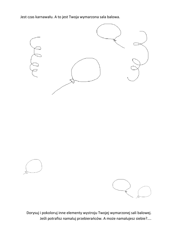 Jest czas karnawału. A to jest Twoja wymarzona sala balowa. Dorysuj i pokoloruj inne elementy wystroju Twojej wymarzonej sali balowej. Jeśli potrafisz namaluj przebierańców. A może namalujesz siebie?.... Jest czas karnawału. A to jest Twoja wymarzona sala balowa. Dorysuj i pokoloruj inne elementy wystroju Twojej wymarzonej sali balowej. Jeśli potrafisz namaluj przebierańców. A może namalujesz siebie?....