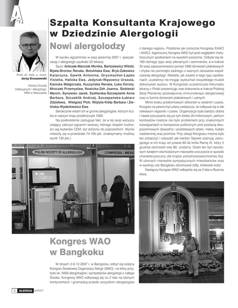 Szpalta Konsultanta Krajowego w Dziedzinie Alergologii Nowi alergolodzy Prof. dr hab. n. med. Jerzy Kruszewski Klinika Chorób Infekcyjnych i Alergologii, WIM w Warszawie W wyniku egzaminów w sesji jesiennej 2007 r. specjalizację z alergologii uzyskało 22 lekarzy. Są to: Antczak-Marczak Monika, Bartosiewicz Witold, Bijata-Bronisz Renata, Botulińska Ewa, Bryk-Żakowicz Katarzyna, Gawlik Antonina, Grycmacher- Łapko Violetta, Halicka Ewa, Jedynak-Wąsowicz Urszula, Kaniuka Małgorzata, Kuczyńska Renata, Łuka Dorota, Mroczek Przemysław, Nowicka-Zeh Joanna, Stobiecki Marcin, Synowiec Jacek, Szaflarska-Szczepianik Anna Barbara, Szczeklik Andrzej, Szczepańska-Łubiarz Zdzisława, Wielgosz Piotr, Wojtyła-Kiełp Barbara i Zielińska-Wyderkiewicz Ewa. Serdecznie witam ich w gronie alergologów, których liczba w naszym kraju przekroczyła 1000. Na podkreślenie zasługuje fakt, że w tej sesji wszyscy zdający zaliczyli egzamin testowy, którego stopień trudności wg kryteriów CEM, był zbliżony do poprzednich. Wyniki mieściły się w przedziale 74-105 pkt. (maksymalny możliwy wynik 120 pkt.). Kongres WAO w Bangkoku W dniach 2-6.12.2007 r. w Bangkoku odbył się kolejny Kongres Światowej Organizacji Alergii (WAO), na który przybyło ok. 5000 alergologów i sympatyków alergologii z całego Świata. Kongresy WAO odbywają się co 2 lata na różnych kontynentach i gromadzą przede wszystkim alergologów 4 ALERGIA 4/2007 z danego regionu. Podobnie jak coroczne Kongresy EAACI i AAACI, tegoroczny Kongres WAO był pod względem merytorycznym spotkaniem na wysokim poziomie. Odbyło się ok. 100 różnego typu sesji plenarnych i seminariów, a w trakcie 25 sesji zaprezentowano ponad 1000 doniesień plakatowych i chyba nie pominięto żadnego z ważnych obszarów współczesnej alergologii. Niestety, jak zwykle w tego typu spotkaniach, uczestnicy nie mogąc wysłuchać wszystkiego musieli dokonywać wyboru. W Kongresie uczestniczyło kilkunastu lekarzy z Polski prezentując swe dokonania w trakcie Polskiej Sesji Plenarnej (poświęconej immunoterapii alergenowej) oraz w formie doniesień plakatowych i ustnych. Mimo braku przełomowych dokonań w ostatnim czasie, Kongres na pewno był udany zwłaszcza, że odbywał się w tak ciekawym regionie i czasie. Organizacja była bardzo dobra i nawet poruszanie się po tym blisko 20 milionowym, pełnym kontrastów mieście nie było problemem przy znakomitych rozwiązaniach w transporcie publicznym pod postacią dwupoziomowych obwodnic i przelotowych arterii, metra, kolejki nadziemnej oraz promów. Przy okazji Kongresu można było też zobaczyć i usłyszeć jak bardzo Tajowie szanują, panującego w ich kraju od prawie 60 lat króla Ramę IX, który 5 grudnia obchodził swe 80. urodziny. Dzień ten był narodowym świętem obchodzonym niezwykle uroczyście w sposób charakterystyczny dla krajów południowowschodniej Azji. W ubiorach niezwykle sympatycznych mieszkańców oraz w wystroju ulic Bangkoku dominował żółty, królewski kolor. Następny Kongres WAO odbędzie się za 2 lata w Buenos Aires.