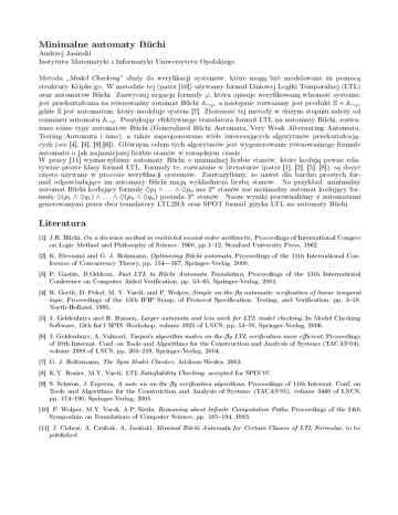 Minimalne automaty Büchi Andrzej Jasi«ski Instytutu Matematyki i Informatyki Uniwersytetu Opolskiego Metoda Model Checking sªu»y do werykacji systemów, które mog¡ by¢ modelowane za pomoc¡ struktury Kripke'go. W metodzie tej (patrz [10]) u»ywamy formuª Liniowej Logiki Temporalnej (LTL) ϕ, która opisuje werykowan¡ wªasno±¢ systemu, A¬ϕ , a nast¦pnie rozwa»any jest produkt S × A¬ϕ , oraz automatów Büchi. Zazwyczaj negacja formuªy jest przeksztaªcana na równowa»ny automat Büchi gdzie S jest automatem, który modeluje system [7]. Zªo»ono±¢ tej metody w du»ym stopniu zale»y od rozmiaru automatu A¬ϕ . Poszukuj¡c efektywnego translatora formuª LTL na automaty Büchi, rozwa- »ano ró»ne typy automatów Büchi (Generalized Büchi Automata, Very Weak Alternating Automata, Testing Automata i inne), a tak»e zaproponowano wiele interesuj¡cych algorytmów przeksztaªcaj¡cych (see [4], [3], [9],[6]). Gªównym celem tych algorytmów jest wygenerowanie równowa»nego formule automatu o jak najmniejszej liczbie stanów w rozs¡dnym czasie. W pracy [11] wyznaczyli±my automaty Büchi o mnimalnej liczbie stanów, które koduj¡ pewne relatywnie proste klasy formuª LTL. Formuªy te, rozwa»ane w literaturze (patrz [1], [2], [5], [8]), s¡ dosy¢ cz¦sto u»ywane w procesie werykacji systemów. Zauwa»yli±my, »e nawet dla bardzo prostych for- muª odpowiadaj¡ce im automaty Büchi maj¡ wykªadnicza liczb¦ stanów. Na przykªad, minimalny ♦p1 ∧ . . . ∧ ♦pn ma 2n stanów za± minimalny automat koduj¡cy for♦(p1 ∧ ♦q1 ) ∧ . . . ∧ ♦(pn ∧ ♦qn ) posiada 3n stanów. Nasze wyniki porównali±my z automatami automat Büchi koduj¡cy formul¦ mul¦ generowanymi przez dwa translatory LTL2BA oraz SPOT formuª j¦zyka LTL na automaty Büchi. Literatura [1] J.R. Büchi, On a decision method in restricted second-order arithmetic, Proccedings of International Congres on Logic Method and Philosophy of Science, 1960, pp.112, Stanford University Press, 1962. [2] K. Etessami and G. J. Holzmann, Optimizing Büchi automata, Proceedings of the 11th International Conference of Concurrency Theory, pp. 154167, Springer-Verlag, 2000. [3] P. Gastin, D.Oddoux, Fast LTL to Büchi Automata Translation, Proceedings of the 13th International Conference on Computer Aided Verication, pp. 5365, Springer-Verlag, 2001. [4] R. Gerth, D. Peled, M. Y. Vardi, and P. Wolper, Simple on-the-y automatic verication of linear temporal logic, Proceedings of the 15th IFIP Symp. of Protocol Specication, Testing, and Verication, pp. 318, North-Holland, 1995. [5] J. Geldenhuys and H. Hansen, Larger automata and less work for LTL model checking, In Model Checking Software, 13th Int'l SPIN Workshop, volume 3925 of LNCS, pp. 5370, Springer-Verlag, 2006. [6] J. Geldenhuys, A. Valmari, Tarjan's algorithm makes on-the-y LTL verication more ecient, Proceedings of 10th Internat. Conf. on Tools and Algorithms for the Construction and Analysis of Systems (TACAS'04), volume 2988 of LNCS, pp. 205219, Springer-Verlag, 2004. . [7] G. J. Holtzmann, The Spin Model Checker, Addison-Wesley, 2003. [8] K.Y. Rozier, M.Y. Vardi, LTL Satisability Checking, accepted for SPIN'07. [9] S. Schwon, J. Esperza, A note on on-the-y verication algorithms, Proceedings of 11th Internat. Conf. on Tools and Algorithms for the Construction and Analysis of Systems (TACAS'05), volume 3440 of LNCS, pp. 174190, Springer-Verlag, 2005. [10] P. Wolper, M.Y. Vardi, A.P. Sistla, Reasoning about Innite Computation Paths, Proceedings of the 24th Symposium on Foundations of Computer Science, pp. 185194, 1983. [11] J. Cicho«, A. Czubak, A. Jasi«ski, Minimal Büchi Automata for Certain Classes of LTL Formulas, to be published