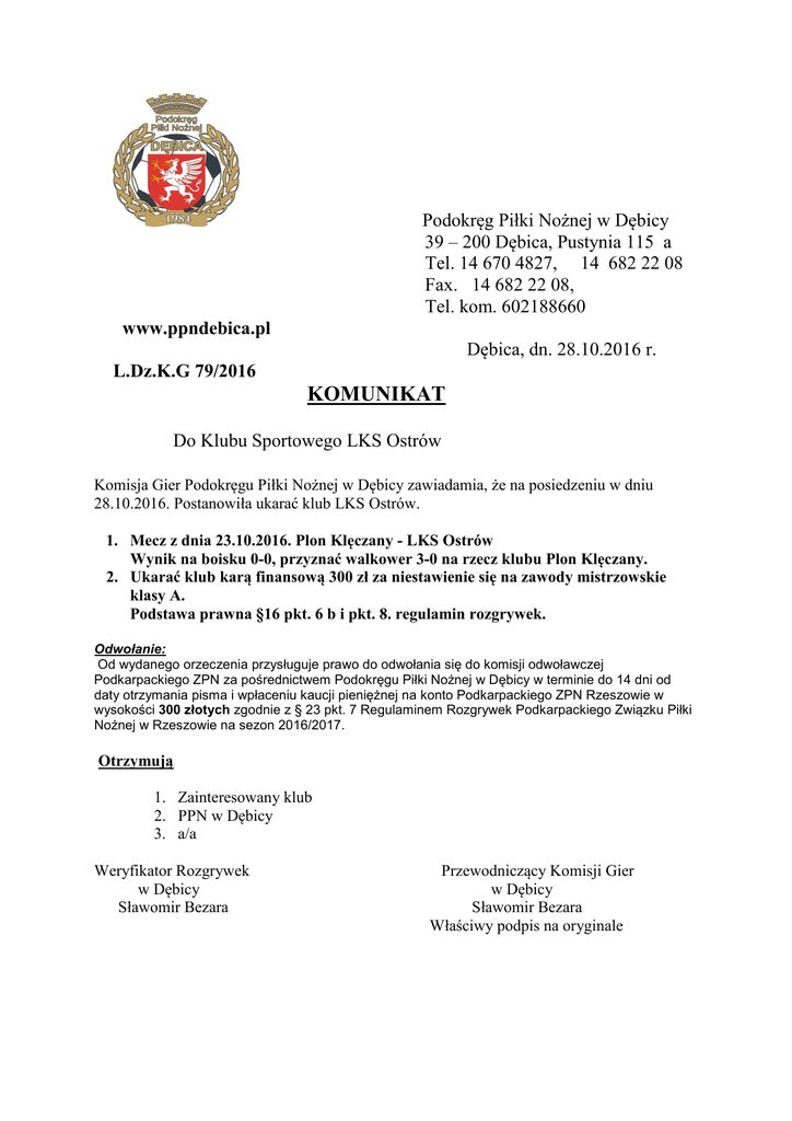 Podokręg Piłki Nożnej w Dębicy 39 – 200 Dębica, Pustynia 115 a Tel. 14 670 4827, 14 682 22 08 Fax. 14 682 22 08, Tel. kom. 602188660 www.ppndebica.pl Dębica, dn. 28.10.2016 r. L.Dz.K.G 79/2016 KOMUNIKAT Do Klubu Sportowego LKS Ostrów Komisja Gier Podokręgu Piłki Nożnej w Dębicy zawiadamia, że na posiedzeniu w dniu 28.10.2016. Postanowiła ukarać klub LKS Ostrów. 1. Mecz z dnia 23.10.2016. Plon Klęczany - LKS Ostrów Wynik na boisku 0-0, przyznać walkower 3-0 na rzecz klubu Plon Klęczany. 2. Ukarać klub karą finansową 300 zł za niestawienie się na zawody mistrzowskie klasy A. Podstawa prawna §16 pkt. 6 b i pkt. 8. regulamin rozgrywek. Odwołanie: Od wydanego orzeczenia przysługuje prawo do odwołania się do komisji odwoławczej Podkarpackiego ZPN za pośrednictwem Podokręgu Piłki Nożnej w Dębicy w terminie do 14 dni od daty otrzymania pisma i wpłaceniu kaucji pieniężnej na konto Podkarpackiego ZPN Rzeszowie w wysokości 300 złotych zgodnie z § 23 pkt. 7 Regulaminem Rozgrywek Podkarpackiego Związku Piłki Nożnej w Rzeszowie na sezon 2016/2017. Otrzymują 1. Zainteresowany klub 2. PPN w Dębicy 3. a/a Weryfikator Rozgrywek w Dębicy Sławomir Bezara Przewodniczący Komisji Gier w Dębicy Sławomir Bezara Właściwy podpis na oryginale