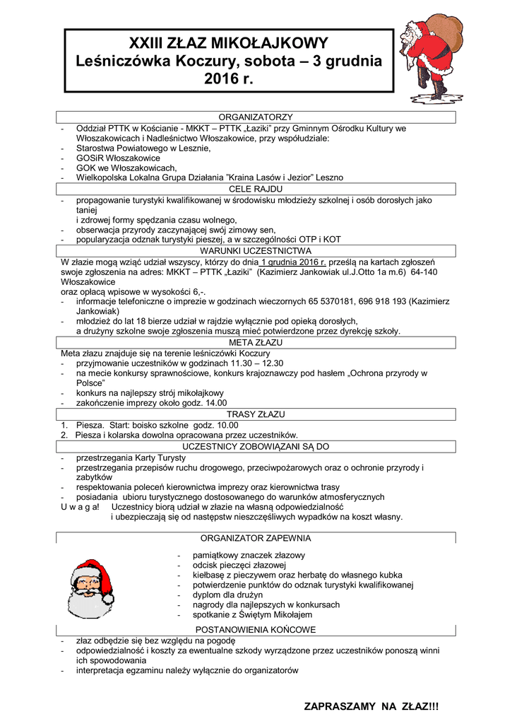 XXIII ZŁAZ MIKOŁAJKOWY Leśniczówka Koczury, sobota – 3 grudnia 2016 r. ORGANIZATORZY - Oddział PTTK w Kościanie - MKKT – PTTK „Łaziki” przy Gminnym Ośrodku Kultury we Włoszakowicach i Nadleśnictwo Włoszakowice, przy współudziale: - Starostwa Powiatowego w Lesznie, - GOSiR Włoszakowice - GOK we Włoszakowicach, - Wielkopolska Lokalna Grupa Działania ”Kraina Lasów i Jezior” Leszno CELE RAJDU - propagowanie turystyki kwalifikowanej w środowisku młodzieży szkolnej i osób dorosłych jako taniej i zdrowej formy spędzania czasu wolnego, - obserwacja przyrody zaczynającej swój zimowy sen, - popularyzacja odznak turystyki pieszej, a w szczególności OTP i KOT WARUNKI UCZESTNICTWA W złazie mogą wziąć udział wszyscy, którzy do dnia 1 grudnia 2016 r. prześlą na kartach zgłoszeń swoje zgłoszenia na adres: MKKT – PTTK „Łaziki” (Kazimierz Jankowiak ul.J.Otto 1a m.6) 64-140 Włoszakowice oraz opłacą wpisowe w wysokości 6,-. - informacje telefoniczne o imprezie w godzinach wieczornych 65 5370181, 696 918 193 (Kazimierz Jankowiak) - młodzież do lat 18 bierze udział w rajdzie wyłącznie pod opieką dorosłych, a drużyny szkolne swoje zgłoszenia muszą mieć potwierdzone przez dyrekcję szkoły. META ZŁAZU Meta złazu znajduje się na terenie leśniczówki Koczury - przyjmowanie uczestników w godzinach 11.30 – 12.30 - na mecie konkursy sprawnościowe, konkurs krajoznawczy pod hasłem „Ochrona przyrody w Polsce” - konkurs na najlepszy strój mikołajkowy - zakończenie imprezy około godz. 14.00 TRASY ZŁAZU 1. Piesza. Start: boisko szkolne godz. 10.00 2. Piesza i kolarska dowolna opracowana przez uczestników. UCZESTNICY ZOBOWIĄZANI SĄ DO - przestrzegania Karty Turysty - przestrzegania przepisów ruchu drogowego, przeciwpożarowych oraz o ochronie przyrody i zabytków - respektowania poleceń kierownictwa imprezy oraz kierownictwa trasy - posiadania ubioru turystycznego dostosowanego do warunków atmosferycznych U w a g a! Uczestnicy biorą udział w złazie na własną odpowiedzialność i ubezpieczają się od następstw nieszczęśliwych wypadków na koszt własny. ORGANIZATOR ZAPEWNIA - pamiątkowy znaczek złazowy odcisk pieczęci złazowej kiełbasę z pieczywem oraz herbatę do własnego kubka potwierdzenie punktów do odznak turystyki kwalifikowanej dyplom dla drużyn nagrody dla najlepszych w konkursach spotkanie z Świętym Mikołajem POSTANOWIENIA KOŃCOWE złaz odbędzie się bez względu na pogodę odpowiedzialność i koszty za ewentualne szkody wyrządzone przez uczestników ponoszą winni ich spowodowania interpretacja egzaminu należy wyłącznie do organizatorów ZAPRASZAMY NA ZŁAZ!!!