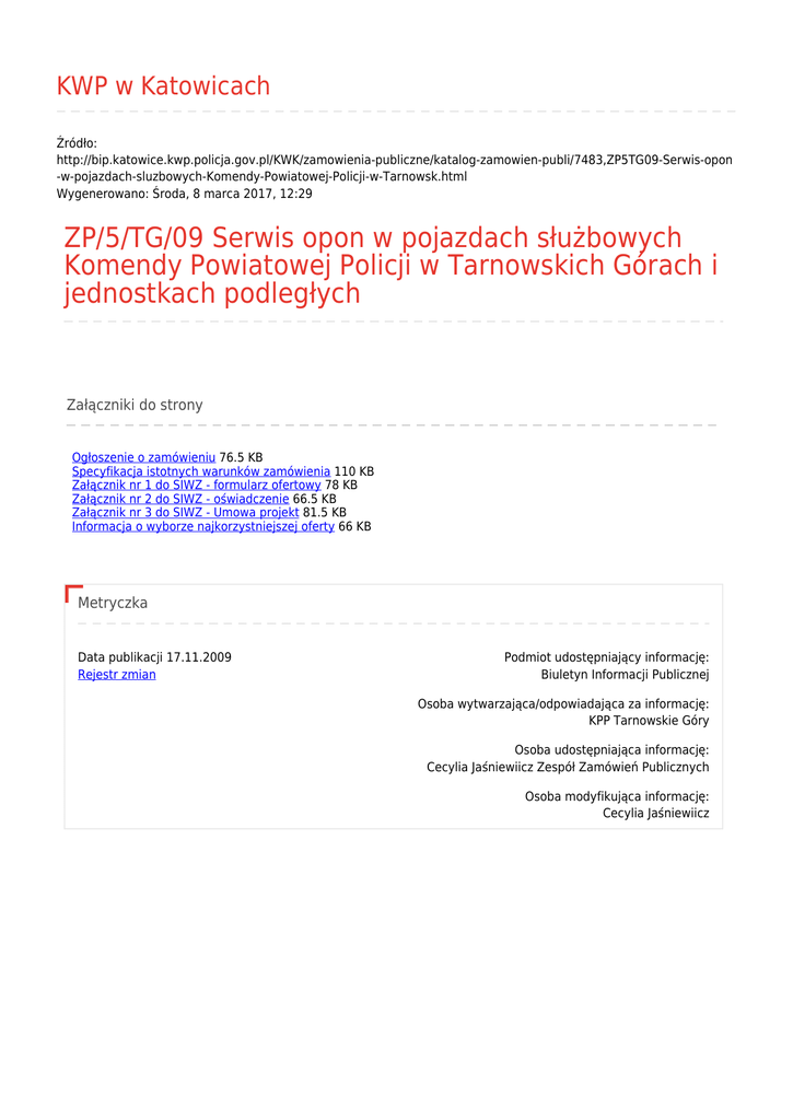 KWP w Katowicach Źródło: http://bip.katowice.kwp.policja.gov.pl/KWK/zamowienia-publiczne/katalog-zamowien-publi/7483,ZP5TG09-Serwis-opon -w-pojazdach-sluzbowych-Komendy-Powiatowej-Policji-w-Tarnowsk.html Wygenerowano: Środa, 8 marca 2017, 12:29 ZP/5/TG/09 Serwis opon w pojazdach służbowych Komendy Powiatowej Policji w Tarnowskich Górach i jednostkach podległych Załączniki do strony Ogłoszenie o zamówieniu 76.5 KB Specyfikacja istotnych warunków zamówienia 110 KB Załącznik nr 1 do SIWZ - formularz ofertowy 78 KB Załącznik nr 2 do SIWZ - oświadczenie 66.5 KB Załącznik nr 3 do SIWZ - Umowa projekt 81.5 KB Informacja o wyborze najkorzystniejszej oferty 66 KB Metryczka Data publikacji 17.11.2009 Rejestr zmian Podmiot udostępniający informację: Biuletyn Informacji Publicznej Osoba wytwarzająca/odpowiadająca za informację: KPP Tarnowskie Góry Osoba udostępniająca informację: Cecylia Jaśniewiicz Zespół Zamówień Publicznych Osoba modyfikująca informację: Cecylia Jaśniewiicz
