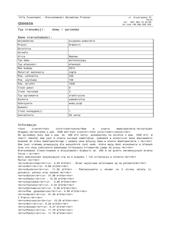 'Alfa Investment - Nieruchomości Doradztwo Finanse' SD00658 Typ transakcji: ul. Grudziądzka 79 Toruń tel. (56) 664 10 25/26 tel.kom +48 888 658 303 domy / sprzedaż Dane nieruchomości: Województwo kujawsko-pomorskie Miasto Grębocin Dzielnica Osiedle Ulica Makowa Typ domu wolnostojący Typ własności własność Rok budowy 2014 Materiał wykonania cegła Pow. całkowita 230 Pow. użytkowa 150 Pow. działki 1838 Ilość pokoi 6 Ilość łazienek 3 Typ ogrzewania elektryczne Kuchnia samodzielna Uzbrojenie woda,prąd Dodatki Ilość kondygnacji 1 Zasiedlenie Od zaraz Informacje: <font size=4><font color=red><center>Dom w stanie deweloperskim,<br>projekt Oregano,<br>działka o pow. 1838 m2</font size=4></font color=red></center><br> Do sprzedaży duży dom o pow. ok. 200 m^2 netto, posadowiony na działce o pow. 1838 m^2. W chwili obecnej dom jest w stanie surowym zamkniętym, jednakże w właściciel może doprowadzić budynek do stanu deweloperskiego ( podana cena dotyczy domu w stanie deweloperskim ).<br><br> Dom jest ciekawą propozycją dla wszystkich tych osób, które mają dość mieszkania w blokach oraz nie chcą codziennie pokonywać kilkunastu kilometrów jadąc do pracy.<br><br> Nieruchomość zlokalizowana w miejscowości Grębocin ok. 250 m od granic ewidencyjnych miasta Toruń.< br><br> Spis pomieszczeń znajdujących się na w budynku i ich orientacja w terenie:<br><br> Parter:<br><br> <b><u>Wiatrołap</b></u>- 4,94 m^2<br> - Drzwi wejściowe skierowane są na południe<br><br> <b><u>Hol</b></u>- 8,88 m^2<br><br> <b><u>Kuchnia</b></u>- 11,38 m^2<br> - Pomieszczenie z oknami na 3 strony świata tj. południe, północ oraz zachód.<br><br> <b><u>Salon</b></u>- 31,96 m^2<br><br> <b><u>Pokój</b></u> - 13,30 m^2<br><br> <b><u>Łazienka</b></u> - 4,66 m^2<br><br> <b><u>Toaleta</b></u>- 2,32 m^2<br><br> <b><u>Kotłownia</b></u>- 5,56 m^2<br><br> <b><u>Pom. gospodarcze</b></u>- 4,96 m^2<br><br> <b><u>Garaż</b></u>- 41,30 m^2<br><br> I Piętro:<br><br> <b><u>Antresola</b></u>- 15,29 m^2<br><br> <b><u>Hol</b></u>- 6,20 m^2<br><br> <b><u>Schody</b></u>- 6,27 m^2<br><br> <b><u>Pokój</b></u>- 11,79 m^2<br><br> <b><u>Pokój</b></u>- 11,79 m^2<br><br> <b><u>Łazienka</b></u> - 3,36 m^2<br><br> <b><u>Łazienka</b></u> - 9,23 m^2<br><br> <b><u>Pokój</b></u> -13,62 m^2<br><br> <b><u>Pokój</b></u>- 14,82 m^2<br><br> Idealny dom dla 6 osobowej rodziny, dzięki ilości pokoi i powierzchni, każda z osób go zamieszkujących może liczyć na własne niezależne pomieszczenie.<br><br> <i> … i właśnie znalazłeś to miejsce, w którym z przyjemnością będziesz mógł usiąść cieszyć się ciepłem domowego ogniska … </i><br><br> Serdecznie zapraszam na prezentację domu, z przyjemnością odpowiem Państwu na wszelkie pytania oraz udzielę dodatkowych informacji. <br><br> <b>Paweł Dawidowicz </b><br> Tel. <b>602 214 117 </b> <br> e-mail: <b> [email protected] </b><br><br> Pośrednik odpowiedzialny zawodowo: <br> Paweł Dawidowicz licencja pośrednika w obrocie nieruchomościami 7432 <br> Andrzej Pamin licencja pośrednika w obrocie nieruchomościami 1145 <br><br> <b>UWAGA!!! BEZPŁATNIE POMAGAMY W UZYSKANIU KREDYTU NA ZAKUP NIERUCHOMOŚCI. WSPÓŁPRACUJEMY Z WIELOMA BANKAMI. </b><br><br> Treść niniejszego ogłoszenia nie stanowi oferty handlowej w rozumieniu przepisów Kodeksu Cywilnego. <br><br> Więcej ofert na www.alfa-investment.pl <br><br> <b>ZAPRASZAMY</b> </font><br><a href="http://www.qr-online.pl/" title="Kody QR"><img src="http://qr-online.pl/bin/codes/d8d83063514c84eb1a1fb8d888d15ebb.png" alt="" /></a></center> <br>* Rzeczywiste powierzchnie pokoi mogą nieznacznie różnić się od podanych na projekcie. Cena: 822 500 PLN Dokument wygenerowany ze strony www.alfa-investment.pl Strona 2