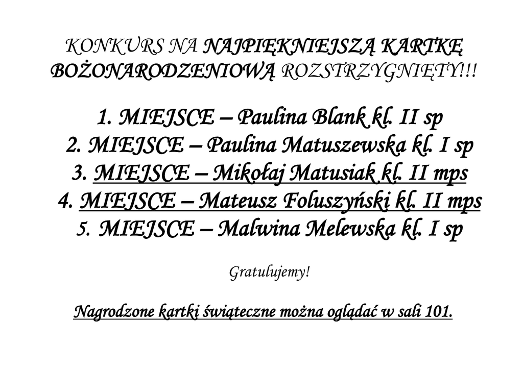 KONKURS NA NAJPIĘKNIEJSZĄ KARTKĘ BOŻONARODZENIOWĄ ROZSTRZYGNIĘTY!!! 1. MIEJSCE – Paulina Blank kl. II sp 2. MIEJSCE – Paulina Matuszewska kl. I sp 3. MIEJSCE – Mikołaj Matusiak kl. II mps 4. MIEJSCE – Mateusz Foluszyński kl. II mps 5. MIEJSCE – Malwina Melewska kl. I sp Gratulujemy! Nagrodzone kartki świąteczne można oglądać w sali 101.