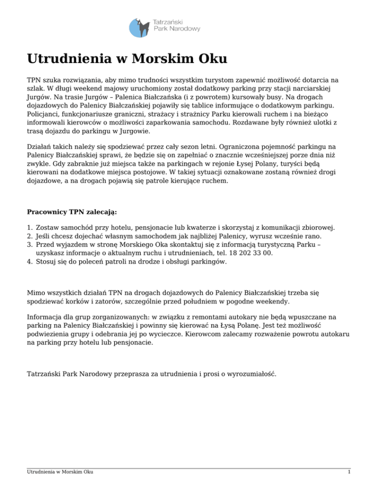 Utrudnienia w Morskim Oku TPN szuka rozwiązania, aby mimo trudności wszystkim turystom zapewnić możliwość dotarcia na szlak. W długi weekend majowy uruchomiony został dodatkowy parking przy stacji narciarskiej Jurgów. Na trasie Jurgów – Palenica Białczańska (i z powrotem) kursowały busy. Na drogach dojazdowych do Palenicy Białczańskiej pojawiły się tablice informujące o dodatkowym parkingu. Policjanci, funkcjonariusze graniczni, strażacy i strażnicy Parku kierowali ruchem i na bieżąco informowali kierowców o możliwości zaparkowania samochodu. Rozdawane były również ulotki z trasą dojazdu do parkingu w Jurgowie. Działań takich należy się spodziewać przez cały sezon letni. Ograniczona pojemność parkingu na Palenicy Białczańskiej sprawi, że będzie się on zapełniać o znacznie wcześniejszej porze dnia niż zwykle. Gdy zabraknie już miejsca także na parkingach w rejonie Łysej Polany, turyści będą kierowani na dodatkowe miejsca postojowe. W takiej sytuacji oznakowane zostaną również drogi dojazdowe, a na drogach pojawią się patrole kierujące ruchem. Pracownicy TPN zalecają: 1. Zostaw samochód przy hotelu, pensjonacie lub kwaterze i skorzystaj z komunikacji zbiorowej. 2. Jeśli chcesz dojechać własnym samochodem jak najbliżej Palenicy, wyrusz wcześnie rano. 3. Przed wyjazdem w stronę Morskiego Oka skontaktuj się z informacją turystyczną Parku – uzyskasz informacje o aktualnym ruchu i utrudnieniach, tel. 18 202 33 00. 4. Stosuj się do poleceń patroli na drodze i obsługi parkingów. Mimo wszystkich działań TPN na drogach dojazdowych do Palenicy Białczańskiej trzeba się spodziewać korków i zatorów, szczególnie przed południem w pogodne weekendy. Informacja dla grup zorganizowanych: w związku z remontami autokary nie będą wpuszczane na parking na Palenicy Białczańskiej i powinny się kierować na Łysą Polanę. Jest też możliwość podwiezienia grupy i odebrania jej po wycieczce. Kierowcom zalecamy rozważenie powrotu autokaru na parking przy hotelu lub pensjonacie. Tatrzański Park Narodowy przeprasza za utrudnienia i prosi o wyrozumiałość. Utrudnienia w Morskim Oku 1