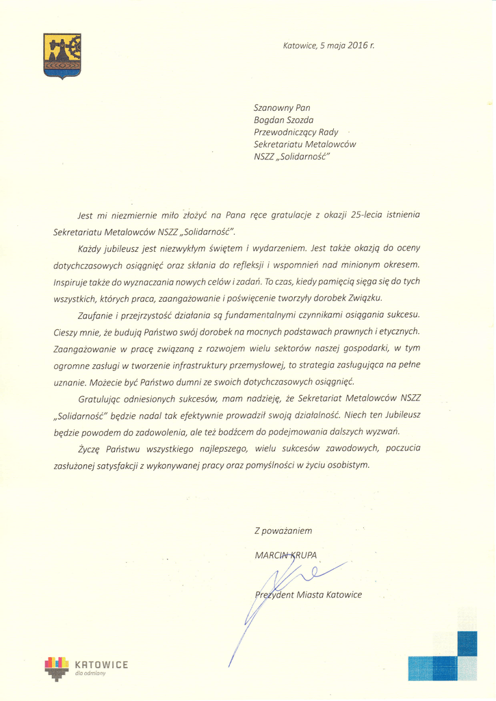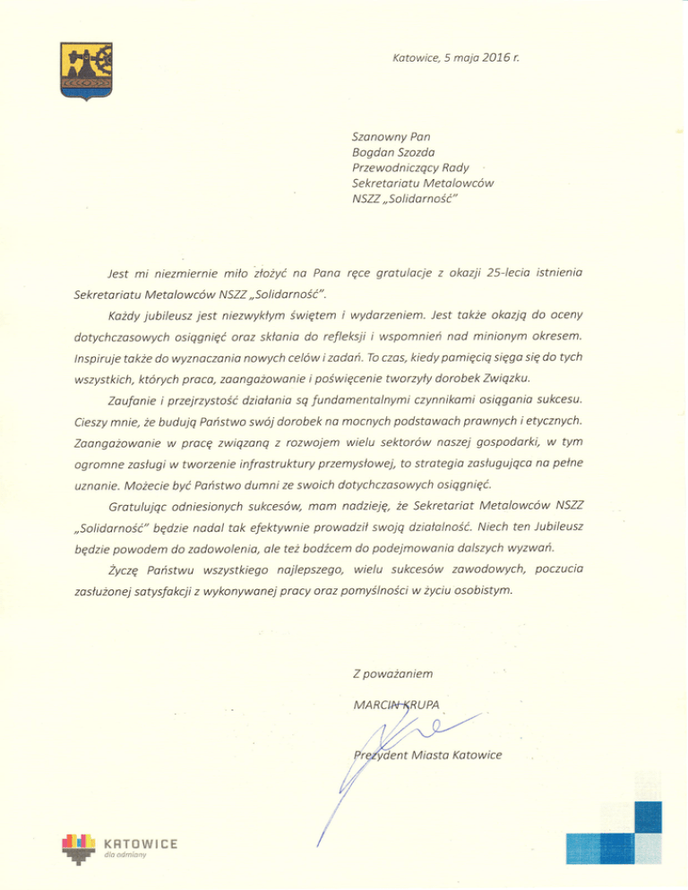 Katowice, 5 maja 2016 r. Szanowny Pan Bogdon Szozda Przewodniczqcy Rady se kreta ri atu M eta lowcow NSZZ ,,Solidarnośc" Jest mi niezmiernie miło złożyćna Pana ręce gratulacje z okazji 25-1ecia istnienio Sekretoriatu Metalowcow NSZZ,,Solidarność". Każdy jubileusz jest niezwykłym świętemi wydorzeniem. Jest także okazjq do oceny dotychczasowych osiqgnięć oraz skłania do refleksji i wspomnień nad minionym okresem. tnspiruje także do wyznaczania nowych celow i zadań, To czas, kiedy pamięciq sięga się do tych wszystkich, ktorych prac0, zoangażowanie i poświęcenie tworzyty dorobek Zwiqzku. Zaufanie i przejrzystośc działania sq fundamentolnymi czynnikami osiqganio sukcesu. Cieszy mnie, że budujq Państwo swoj dorobek na mocnych podstawach prawnych i etycznych. Zaongożowanie w procę zwiqzanq z rozwojem wielu sektorow naszej gospodarki, w tym ogromne zasługi w tworzenie infrastruktury przemysłowej, to strategia zasługujqca na pełne uznanie. Możecie być Państwo dumni ze swoich dotychczasowych osiqgnięć. Gratulujqc odniesionych sukcesow, mam nadzieję, że Sekretariot Metalowcow NSZZ ,,Solidarnośc" będzie nadal tak efektywnie prowadził swojq działalność.Niech ten Jubileusz będzie powodem do zadowolenia, ale też bodźcem do podejmowania dolszych wyzwań. Zyczę państwu wszystkiego najlepszego, wielu sukcesów zowodowych, poczucia zasłużonejsatysfakcji z wykonywanej pracy oraz pomyślnościw życiu osobistym. Z poważaniem nt Miosta katowice