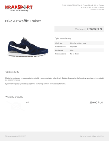 P.H.U. KRAKSPORT Sp.J. Zenon Piętak, Alicja Piętak Al.Pokoju 32, 31-564 Kraków +48 12 4140108 Nike Air Waffle Trainer Cena od: 239,00 PLN Opis słownikowy Cholewka Materiał włókienniczy Czas dostawy 48 godzin Producent Nike Przeznaczenie Na co dzień Opis produktu Cholewka: wykonana z wysokogatunkowej skóry oraz materiałów tekstylnych. Solidne obszycia i wykończenia gwarantują wytrzymałość a z zarazem wygodę. System amortyzacji (poduszka) zapewnia znakomity komfort podczas użytkowania. Warianty produktu 40 Plik wygenerowano: 08-03-2017 239,00 PLN Oprogramowanie sklepu: AptusShop P.H.U. KRAKSPORT Sp.J. Zenon Piętak, Alicja Piętak Al.Pokoju 32, 31-564 Kraków +48 12 4140108 Galeria Plik wygenerowano: 08-03-2017 Powered by TCPDF (www.tcpdf.org) Oprogramowanie sklepu: AptusShop