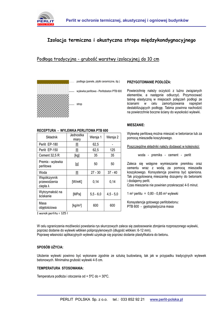 Perlit w ochronie termicznej, akustycznej i ogniowej budynków Izolacja termiczna i akustyczna stropu międzykondygnacyjnego Podłoga tradycyjna - grubość warstwy izolacyjnej do 10 cm podłoga (panele, płytki ceramiczne, itp.) PRZYGOTOWANIE PODŁOśA: wylewka perlitowa - Perlitobeton PTB 600 Powierzchnię naleŜy oczyścić z luźno związanych elementów, a następnie odkurzyć. Przymocować taśmę elastyczną w miejscach połączeń podłogi ze ścianami w celu zamortyzowania napręŜeń destabilizujących podłogę. Taśma powinna nachodzić na powierzchnie boczne ściany do wysokości wylewki. strop MIESZANIE: RECEPTURA - WYLEWKA PERLITOWA PTB 600 Jednostka Składnik Wersja 1 Wersja 2 miary Perlit EP-180 [l] 62,5 Perlit EP-150 [l] 62,5 125 Cement 32,5 R [kg] 35 35 Premix - wylewka perlitowa Wylewkę perlitową moŜna mieszać w betoniarce lub za pomocą mieszadła koszykowego. Poszczególne składniki naleŜy dodawać w kolejności: woda - premiks - cement - perlit Zaleca się wstępne wymieszanie premiksu oraz cementu wraz z wodą za pomocą mieszadła koszykowego. Konsystencja powinna być spieniona. Tak przygotowaną mieszankę dozujemy do betoniarki i dodajemy perlit. Czas mieszania nie powinien przekraczać 4-5 minut. [g] 50 50 [l] 27 - 30 37 - 40 [W/mK] 0,14 0,14 Wytrzymałość na ściskanie [MPa] 5,5 - 6,0 4,5 - 5,0 1 m3 perlitu = 0,80 - 0,85 m3 wylewki Masa objętościowa [kg/m3] 600 600 Konsystencja gotowego perlitobetonu: PTB 600 - gęstoplastyczna masa Woda Współczynnik przewodzenia ciepła λ 1 worek perlitu = 125 l W celu ograniczenia moŜliwości powstania rys skurczowych zaleca się zastosowanie zbrojenia rozproszonego wylewki, poprzez dodanie do wylewki włókien polipropylenowych (długość włókien: 6-12 mm). Poprawę własności aplikacyjnych wylewki uzyskuje się poprzez dodanie plastyfikatora do betonu. SPOSÓB UśYCIA: UłoŜenie wylewki powinno być wykonane zgodnie ze sztuką budowlaną, tak jak w przypadku tradycyjnych wylewek betonowych. Minimalna grubość wylewki 4-5 cm. TEMPERATURA STOSOWANIA: Temperatura podłoŜa i otoczenia od + 5ºC do + 30ºC. PERLIT POLSKA Sp. z o.o. tel.: 033 852 92 21 www.perlit-polska.pl Perlit w ochronie termicznej, akustycznej i ogniowej budynków Podłoga tradycyjna - grubość warstwy izolacyjnej powyŜej 10 cm JeŜeli grubość warstwy izolacyjnej przekracza 10 cm wtedy izolację wykonujemy w 2 etapach: - podkład perlitowy - Perlitobeton PTB 300 - wylewka perlitowa - Perlitobeton PTB 600 Podłoga (panele, płytki ceramiczne, itp.) PRZYGOTOWANIE PODŁOśA: Wylewka perlitowa - Perlitobeton PTB 600 Powierzchnię naleŜy oczyścić z luźno związanych elementów, a następnie odkurzyć. Przymocować taśmę elastyczną w miejscach połączeń podłogi ze ścianami w celu zamortyzowania napręŜeń destabilizujących podłogę. Taśma powinna nachodzić na powierzchnie boczne ściany do wysokości podkładu wraz z wylewką. Podkład perlitowy - Perlitobeton PTB 300 Strop MIESZANIE: RECEPTURY [l] [l] [kg] Podkład perlitowy PTB 300 125 19 Wylewka perlitowa PTB 600 62,5 62,5 35 [g] 50 - [g] - 50 [l] 20-23 27-30 [W/mK] 0,07 0,14 Wytrzymałość na ściskanie [MPa] 1,3 - 1,5 5,5 - 6,0 Masa objętościowa [kg/m3] 300 600 Jednostka miary Składnik Perlit EP-180 Perlit EP-150 Cement 32,5 R Premix - podkład perlitowy Premix - wylewka perlitowa Woda Współczynnik przewodzenia ciepła λ 1 worek perlitu = 125 l Zarówno podkład, jak i wylewkę perlitową moŜna mieszać w betoniarce lub za pomocą mieszadła koszykowego. Poszczególne składniki naleŜy dodawać w kolejności: woda - premiks - cement - perlit Zaleca się wstępne wymieszanie premiksu oraz cementu wraz z wodą za pomocą mieszadła koszykowego. Konsystencja powinna być spieniona. Tak przygotowaną mieszankę dozujemy do betoniarki i dodajemy perlit. Czas mieszania nie powinien przekraczać 4-5 minut. Wylewka moŜe być połoŜona bezpośrednio po związaniu podkładu. 1 m3 perlitu = 0,95 - 1,00 m3 podkładu 1 m3 perlitu = 0,80 - 0,85 m3 wylewki Konsystencja gotowego perlitobetonu: PTB 300 - półmokra (sypka wilgotna masa) PTB 600 - gęstoplastyczna masa W celu ograniczenia moŜliwości powstania rys skurczowych zaleca się zastosowanie zbrojenia rozproszonego wylewki, poprzez dodanie do wylewki włókien polipropylenowych (długość włókien: 6-12 mm). Poprawę własności aplikacyjnych wylewki uzyskuje się poprzez dodanie plastyfikatora do betonu. Włókien ani plastyfikatora nie stosuje się do podkładu pod wylewkę. SPOSÓB UśYCIA: UłoŜenie wylewki powinno być wykonane zgodnie ze sztuką budowlaną, tak jak w przypadku tradycyjnych wylewek betonowych. Minimalna grubość wylewki 4-5 cm. TEMPERATURA STOSOWANIA: Temperatura podłoŜa i otoczenia od + 5ºC do + 30ºC. PERLIT POLSKA Sp. z o.o. tel.: 033 852 92 21 www.perlit-polska.pl