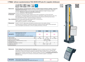 Cyfrowe wysokościomierze TESA MICRO-HITE plus M z napędem silnikowym mm Norma E2 Cal Inch RS232C IP 40 Wykonanie: Wysokiej jakości wysokościomierz cyfrowy o bardzo dużym komforcie obsługi, z licznymi funkcjami pomiarowymi. Możliwość programowania pomiarów powtarzalnych. Intuicyjna obsługa za pomocą uchwytu sterowniczego. Wysoka dokładność dzięki Computer Aided Accuracy. Możliwość włączenia poduszki powietrznej. Zastosowanie: Pomiary warsztatowe i izby pomiarowe. W dostawie: Przyrząd pomiarowy bez pulpitu obsługi Power Panel, standardowy uchwyt końcówek pomiarowych, standardowa końcówka pomiarowa z wałeczkiem i kulką pomiarową o ⌀ 5 mm, blok kalibracyjny, pompa elektryczna (zamontowana) do poduszki pneumatycznej, zestaw akumulatorków PB, zasilacz i przewód zasilający, pokrowiec. Wyp. dodatkowe: Różne wyposażenie specjalne dostarczane na zamówienie, zestaw trzpieni nr 44 5266 i nr 44 5267, rolka papieru do drukarki nr 44 5268, wielk. 57 Wskazówka: Artykuł nr 44 5275 odpowiada przyrządowi podstawowemu bez pulpitu obsługi. Dla zapewnienia możliwości używania cyfrowego wysokościomierza należy zawsze zamawiać wraz z przyrządem pomiarowym nr 44 5275 pulpit pomiarowy nr 44 5276. M350 M600 M900 XXX XXX XXX mm mm 365 0 − 520 920 0 − 1075 µm µm µm mm N 5 615 0 − 770 napęd silnikowy 1,9 + 1,5 L / 1000 ≤1 7 0,0001 / 0,001 / 0,01 1 45B typ 44 5275 Wysokościomierze cyfrowe TESA MICRO-HITE plus M z napędem silnikowym (przyrząd podstawowy bez pulpitu obsługi) zakres pomiaru zakres pomiaru do przesuw sań pomiarowych błąd graniczny (L = odcinek pomiaru w mm) powtarzalność (2 σ) odchyłka prostopadłości (czołowa) przełączany odczyt co nacisk pomiarowy 45B Wykonanie: 44 5276 9 Pulpit obsługi Power Panel plus M z drukarką. Obszerne programy pomiarowe. Możliwość zaprogramowania automatycznych procesów pomiarowych metodą Teach-in. Pamięć 9999 parametrów. Pojemność pamięci pozwala na zapisanie 25000 wyników pomiarów. Statystyczne przetwarzanie wyników pomiarów SPC. Wydruk wyników pomiarów na wbudowanej drukarce igłowej albo w formacie A4 na drukarce zewnętrznej. Zasilanie prądem z przyrządu podstawowego. Pulpit obsługi Power Panel plus M dla przyrządu podstawowego TESA MICRO-HITE plus M XXX