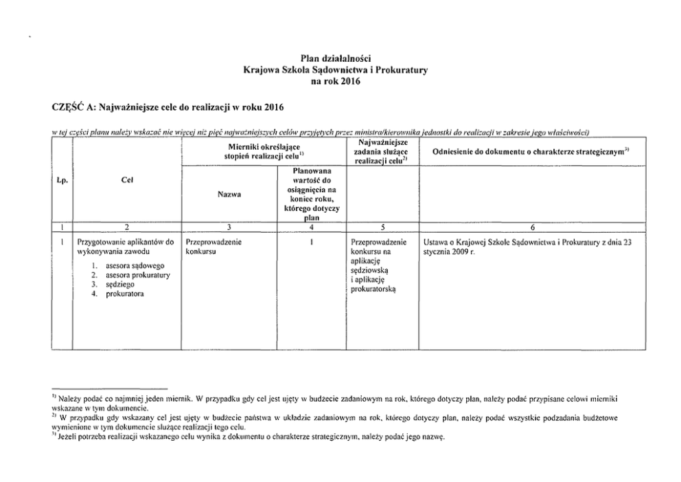 Plan działalności Krajowa Szkoła Sądo>vnict>va i Prokuratury na rok 2016 CZĘŚĆ A: Najważniejsze cele do realizacji w roku 2016 w tej części planu należy wskazać nie więcej niż pięć najważniejszych celów przyjętych przez ministra/kierownika jednostki do realizacji ir zakresie jego właściwości) Mierniki określające stopień realizacji celu 11 Lp. Cel Nazwa 1 2 1 Przygotowanie aplikantów do wykonywania zawodu 1. 2. 3. 4. asesora sądowego asesora prokuratury sędziego prokuratora 3 Przeprowadzenie konkursu Planowana wartość do osiągnięcia na koniec roku, którego dotyczy plan 4 1 Najważniejsze zadania służące realizacji celu 2) Odniesienie do dokumentu o charakterze strategicznym *' 5 6 Przeprowadzenie konkursu na aplikację sędziowską i aplikację prokuratorską Ustawa o Krajowej Szkole Sądownictwa i Prokuratury z dnia 23 stycznia 2009 r. '' Należy podać co najmniej jeden miernik. W przypadku gdy cel jest ujęty w budżecie zadaniowym na rok, którego dotyczy plan, należy podać przypisane celowi mierniki wskazane w tym dokumencie. 2ł W przypadku gdy wskazany cel jest ujęty w budżecie państwa w układzie zadaniowym na rok, którego dotyczy plan, należy podać wszystkie podzadania budżetowe wymienione w tym dokumencie służące realizacji tego celu. Jeżeli potrzeba realizacji wskazanego celu wynika z dokumentu o charakterze strategicznym, należy podać jego nazwę. Liczba przeszkolonych aplikantów 181 aplikantów VI rocznika A O Przeprowadzenie aplikacji ogólnej w okresie od 1.01.2016 r. do 25.01.2016 r. Ustawa o Krajowej Szkole Sądownictwa i Prokuratury z dnia 23 stycznia 2009 r. Uchwała Nr 18/2010 Rady Programowej Krajowej Szkoły Sądownictwa i Prokuratury z dnia 22 lutego 2010r. Zarządzenie Ministra Sprawiedliwości z dnia 29.11.2013 r. (Dz. Urz. MS. z 2013 r. poz. 296) Liczba przeszkolonych aplikantów 156 aplikantów VII rocznika A O Przeprowadzenie aplikacji ogólnej w okresie od 1.02.2016 r. do 31.12.2016 r. Ustawa o Krajowej Szkole Sądownictwa i Prokuratury z dnia 23 stycznia 2009 r. Uchwała Nr 18/2010 Rady Programowej Krajowej Szkoły Sądownictwa i Prokuratury z dnia 22 lutego 2010r. Zarządzenie Ministra Sprawiedliwości z dnia 27.02.2015 r. (Dz. Urz. MS. z 2015 r. poz. 81) Liczba przeszkolonych aplikantów 99 aplikantów II rocznika AS Przeprowadzenie aplikacji sędziowskiej Ustawa o Krajowej Szkole Sądownictwa i Prokuratury z dnia 23 stycznia 2009 r. Uchwała Nr 18/2010 Rady Programowej Krajowej Szkoły Sądownictwa i Prokuratury z dnia 22 lutego 2010r. Zarządzenie nr 223/1 l/DK Ministra Sprawiedliwości z dnia 05.10.201 Ir. Liczba przeszkolonych aplikantów 103 aplikantów III rocznika AS Przeprowadzenie aplikacji sędziowskiej Ustawa o Krajowej Szkole Sądownictwa i Prokuratury z dnia 23 stycznia 2009 r. Uchwała Nr 18/2010 Rady Programowej Krajowej Szkoły Sądownictwa i Prokuratury z dnia 22 lutego 2010r. Zarządzenie nr 196/12/DK Ministra Sprawiedliwości z dnia 05.10.2012 r. Liczba przeszkolonych aplikantów 93 aplikantów IV rocznika AS Przeprowadzenie aplikacji sędziowskiej Ustawa o Krajowej Szkole Sądownictwa i Prokuratury z dnia 23 stycznia 2009 r. Uchwała Nr 18/2010 Rady Programowej Krajowej Szkoły Sądownictwa i Prokuratury z dnia 22 lutego 201 Or. Zarządzenie Ministra Sprawiedliwości z dnia 05.11.2013 r. (Dz. Urz. MS z 2013 r. poz. 289) Liczba przeszkolonych aplikantów 58 aplikantów IV rocznika AP Przeprowadzenie aplikacji prokuratorskiej w okresie od 1.01.2016 r. do 30.09.2016 r. Ustawa o Krajowej Szkole Sądownictwa i Prokuratury z dnia 23 stycznia 2009 r. Uchwała Nr 18/2010 Rady Programowej Krajowej Szkoły Sądownictwa i Prokuratury z dnia 22 lutego 2010r. Zarządzenie Ministra Sprawiedliwości z dnia 05.11.2013 r. (Dz. Urz. MS z 2013 r. poz. 290) Liczba przeszkolonych aplikantów 87 aplikantów V rocznika AS Przeprowadzenie aplikacji sędziowskiej w okresie od 1.01.2016 r. do 31.12.2016 r. Ustawa o Krajowej Szkole Sądownictwa i Prokuratury z dnia 23 stycznia 2009 r. Uchwała Nr 18/2010 Rady Programowej Krajowej Szkoły Sądownictwa i Prokuratury z dnia 22 lutego 2010r. Zarządzenie Ministra Sprawiedliwości z dnia 5.12.2014 r. (Dz. Urz. MS. z 2014 r. poz. 174, Dz. Urz. MS z 2015 r. poz. 92) Liczba przeszkolonych aplikantów 84 aplikantów V rocznika AP Przeprowadzenie aplikacji prokuratorskiej w okresie od 1.01.2016 r. do 31.12.2016 r. Ustawa o Krajowej Szkole Sądownictwa i Prokuratury z dnia 23 stycznia 2009 r. Uchwała Nr 18/2010 Rady Programowej Krajowej Szkoły Sądownictwa i Prokuratury z dnia 22 lutego 2 0 l 0 r . Zarządzenie Ministra Sprawiedliwości z dnia 5.12.2014 r. (Dz. Urz. MS. z 2014 r. poz. 175, Dz. Urz. MS z 2015 r. poz. 93) Liczba przeszkolonych aplikantów 86 aplikantów VI rocznika AS Przeprowadzenie aplikacji sędziowskiej w okresie od 4.04.2016 r. do 31.12.2016 r. Ustawa o Krajowej Szkole Sądownictwa i Prokuratury z dnia 23 stycznia 2009 r. Uchwała Nr 18/2010 Rady Programowej Krajowej Szkoły Sądownictwa i Prokuratury z dnia 22 lutego 2010r. Liczba przeszkolonych aplikantów 85 aplikantów VI rocznika AP Przeprowadzenie aplikacji prokuratorskiej w okresie od 4.04.2016 r. do 31.12.2016 r. Ustawa o Krajowej Szkole Sądownictwa i Prokuratury z dnia 23 stycznia 2009 r. Uchwała Nr 18/2010 Rady Programowej Krajowej Szkoły Sądownictwa i Prokuratury z dnia 22 lutego 201 Or. 2 Podnoszenie kwalifikacji zawodowych sędziów, asesorów sadowych, referendarzy sądowych oraz asystentów sędziów, prokuratorów, asesorów prokuratury oraz asystentów prokuratorów, kuratorów sądowych oraz urzędników sądów i prokuratury. Egzamin sędziowski 1 Przeprowadzenie egzaminu sędziowskiego dla aplikantów IV rocznika aplikacji sędziowskiej oraz dla referendarzy sądowych i asystentów sędziów Ustawa o Krajowej Szkole Sądownictwa i Prokuratury z dnia 23 stycznia 2009 r. Egzamin prokuratorski I Przeprowadzenie egzaminu prokuratorskiego dla aplikantów IV rocznika aplikacji prokur
