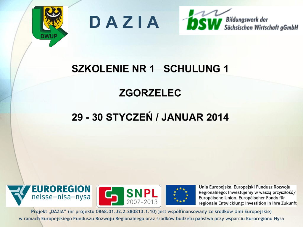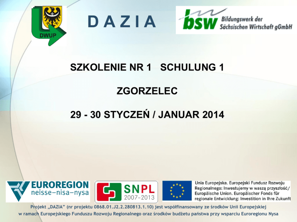 DAZIA SZKOLENIE NR 1 SCHULUNG 1 ZGORZELEC 29 - 30 STYCZEŃ / JANUAR 2014 Projekt „DAZIA” (nr projektu 0868.01.J2.2.280813.1.10) jest współfinansowany ze środków Unii Europejskiej w ramach Europejskiego Funduszu Rozwoju Regionalnego oraz środków budżetu państwa przy wsparciu Euroregionu Nysa DAZIA Beata Hadaś, Piotr Lazar Dolnośląski Wojewódzki Urząd Pracy SYTUACJA EKONOMICZNA I DEMOGRAFICZNA W OBSZARZE PRZYGRANICZNYM – STAN OBECNY I PROGNOZY DLA POLSKI Projekt „DAZIA” (nr projektu 0868.01.J2.2.280813.1.10) jest współfinansowany ze środków Unii Europejskiej w ramach Europejskiego Funduszu Rozwoju Regionalnego oraz środków budżetu państwa przy wsparciu Euroregionu Nysa DAZIA Część I: prezentuje Beata Hadaś Projekt „DAZIA” (nr projektu 0868.01.J2.2.280813.1.10) jest współfinansowany ze środków Unii Europejskiej w ramach Europejskiego Funduszu Rozwoju Regionalnego oraz środków budżetu państwa przy wsparciu Euroregionu Nysa DAZIA Milton Friedman, laureat nagrody Nobla w dziedzinie ekonomii: „Jeśli lokalne społeczeństwo nie jest w stanie generować nowych pomysłów, lokalna gospodarka zmierza ku upadkowi, a wraz z nią – społeczeństwo” Projekt „DAZIA” (nr projektu 0868.01.J2.2.280813.1.10) jest współfinansowany ze środków Unii Europejskiej w ramach Europejskiego Funduszu Rozwoju Regionalnego oraz środków budżetu państwa przy wsparciu Euroregionu Nysa DAZIA Spotkanie plenarne Zarządu Województwa Dolnośląskiego i Rządu Krajowego Wolnego Kraju Związkowego Saksonia w Dreźnie - październik 1999 r. Zagrożenia dla regionów przygranicznych: - wyludnienie obszarów przygranicznych, - niekorzystne zmiany w strukturze demograficznej, - odpływ kapitału gospodarczego. Projekt „DAZIA” (nr projektu 0868.01.J2.2.280813.1.10) jest współfinansowany ze środków Unii Europejskiej w ramach Europejskiego Funduszu Rozwoju Regionalnego oraz środków budżetu państwa przy wsparciu Euroregionu Nysa DAZIA Zmiany struktury demograficznej ludności powiatów przygranicznych w latach 1995 - 2012 400 350 Niekorzystne zmiany w okresie od 1995 do 2012: 300 250 200 150 <18 18/59-64 >60/65 SUMAR: 100 50 0 1995 2002 2010 2011 •Spadek ogólnej liczby mieszkańców o ok.20 tys. •Spadek liczby osób młodych o prawie 10 tys. •Wzrost liczby osób w wieku poprodukcyjnym o 11 tys. 2012 Opracowano na podstawie Bazy Danych Lokalnych GUS - www.stat.gov.pl/bdl Projekt „DAZIA” (nr projektu 0868.01.J2.2.280813.1.10) jest współfinansowany ze środków Unii Europejskiej w ramach Europejskiego Funduszu Rozwoju Regionalnego oraz środków budżetu państwa przy wsparciu Euroregionu Nysa DAZIA Zmiany demograficzne w obrębie grup w wieku nieprodukcyjnym w latach 1995 - 2012 80 70 60 50 <18 40 >60/65 30 20 10 0 1995 2002 2010 2011 2012 Opracowano na podstawie Bazy Danych Lokalnych GUS - www.stat.gov.pl/bdl W okresie kwiecień – październik 2013 r. liczba urodzin dzieci była niższa od liczby zgonów o 962 osoby. Projekt „DAZIA” (nr projektu 0868.01.J2.2.280813.1.10) jest współfinansowany ze środków Unii Europejskiej w ramach Europejskiego Funduszu Rozwoju Regionalnego oraz środków budżetu państwa przy wsparciu Euroregionu Nysa DAZIA Prognoza struktury demograficznej ludności powiatów przygranicznych do roku 2030 – metoda meldunkowa 400 Niekorzystne zmiany w okresie od 1995 do 2030: 350 >60 '55-59 '50-54 '24-49 '20-24 <19 300 250 200 150 100 50 0 1995 2002 2010 2012 2020 2030 •Spadek liczby ludności o blisko 40.000 •Liczba osób do 18 roku życia zmniejszy się o prawie 50% (z ponad 84 tys. do 43 tys.). •Liczba osób powyżej 60 roku życia będzie większa o prawie 40% (wzrośnie z 56 tys. do ponad 78 tys.). Projekt „DAZIA” (nr projektu 0868.01.J2.2.280813.1.10) jest współfinansowany ze środków Unii Europejskiej w ramach Europejskiego Funduszu Rozwoju Regionalnego oraz środków budżetu państwa przy wsparciu Euroregionu Nysa DAZIA Część II: prezentuje Piotr Lazar Projekt „DAZIA” (nr projektu 0868.01.J2.2.280813.1.10) jest współfinansowany ze środków Unii Europejskiej w ramach Europejskiego Funduszu Rozwoju Regionalnego oraz środków budżetu państwa przy wsparciu Euroregionu Nysa DAZIA Zmiany w strukturze demograficznej. 1. 2. 3. Odpływ młodych oraz części pokolenia w tzw. średnim wieku (ponad 80% osób w wieku 19-24 lata znajduje zatrudnienie w miastach – ośrodkach akademickich, gdzie lokuje się znacząca większość nowych inwestycji). Emigracja do innych krajów Unii Europejskiej (Polki są drugą co do liczebności grupą narodowościową „cudzoziemskich matek” w Anglii i Szkocji. Polacy stanowią coraz liczniejszą grupę mieszkańców Belgii, Holandii czy krajów skandynawskich.) Pojawi się problem z opieką nad pozostającymi osobami starszymi (wzrośnie zapotrzebowanie na opiekę instytucjonalną – zakłady opiekuńczo-lecznicze oraz domy „spokojnej starości”). Projekt „DAZIA” (nr projektu 0868.01.J2.2.280813.1.10) jest współfinansowany ze środków Unii Europejskiej w ramach Europejskiego Funduszu Rozwoju Regionalnego oraz środków budżetu państwa przy wsparciu Euroregionu Nysa DAZIA Projekt „DAZIA” (nr projektu 0868.01.J2.2.280813.1.10) jest współfinansowany ze środków Unii Europejskiej w ramach Europejskiego Funduszu Rozwoju Regionalnego oraz środków budżetu państwa przy wsparciu Euroregionu Nysa DAZIA Od 2010 r. następują niewielkie zmiany w poziomie bezrobocia, jednakże po stronie niemieckiej poziom bezrobocia spada, po stronie polskiej wzrasta. Projekt „DAZIA” (nr projektu 0868.01.J2.2.280813.1.10) jest współfinansowany ze środków Unii Europejskiej w ramach Europejskiego Funduszu Rozwoju Regionalnego oraz środków budżetu państwa przy wsparciu Euroregionu Nysa DAZIA Projekt „DAZIA” (nr projektu 0868.01.J2.2.280813.1.10) jest współfinansowany ze środków Unii Europejskiej w ramach Europejskiego Funduszu Rozwoju Regional