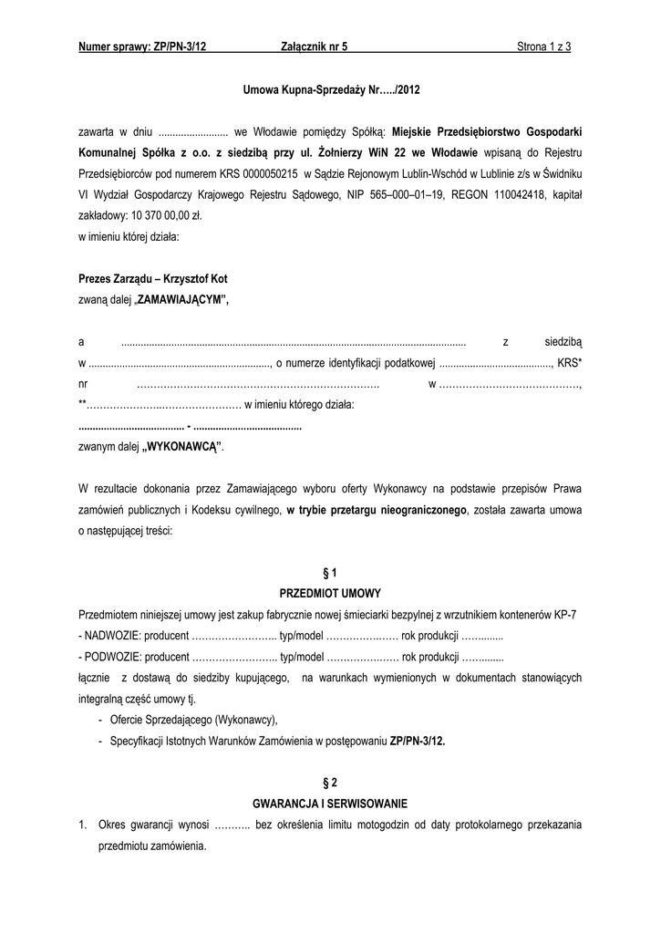 Numer sprawy: ZP/PN-3/12 Załącznik nr 5 Strona 1 z 3 Umowa Kupna-Sprzedaży Nr…../2012 zawarta w dniu ......................... we Włodawie pomiędzy Spółką: Miejskie Przedsiębiorstwo Gospodarki Komunalnej Spółka z o.o. z siedzibą przy ul. Żołnierzy WiN 22 we Włodawie wpisaną do Rejestru Przedsiębiorców pod numerem KRS 0000050215 w Sądzie Rejonowym Lublin-Wschód w Lublinie z/s w Świdniku VI Wydział Gospodarczy Krajowego Rejestru Sądowego, NIP 565–000–01–19, REGON 110042418, kapitał zakładowy: 10 370 00,00 zł. w imieniu której działa: Prezes Zarządu – Krzysztof Kot zwaną dalej „ZAMAWIAJĄCYM”, a ............................................................................................................................ z siedzibą w ................................................................., o numerze identyfikacji podatkowej ........................................, KRS* nr ………………………………………………………………. w ……………………………………, **…………………..…………………… w imieniu którego działa: ...................................... - ....................................... zwanym dalej „WYKONAWCĄ”. W rezultacie dokonania przez Zamawiającego wyboru oferty Wykonawcy na podstawie przepisów Prawa zamówień publicznych i Kodeksu cywilnego, w trybie przetargu nieograniczonego, została zawarta umowa o następującej treści: §1 PRZEDMIOT UMOWY Przedmiotem niniejszej umowy jest zakup fabrycznie nowej śmieciarki bezpylnej z wrzutnikiem kontenerów KP-7 - NADWOZIE: producent …………………….. typ/model …………….…… rok produkcji ……........ - PODWOZIE: producent …………………….. typ/model …………….…… rok produkcji ……........ łącznie z dostawą do siedziby kupującego, na warunkach wymienionych w dokumentach stanowiących integralną część umowy tj. - Ofercie Sprzedającego (Wykonawcy), - Specyfikacji Istotnych Warunków Zamówienia w postępowaniu ZP/PN-3/12. §2 GWARANCJA I SERWISOWANIE 1. Okres gwarancji wynosi ……….. bez określenia limitu motogodzin od daty protokolarnego przekazania przedmiotu zamówienia. Numer sprawy: ZP/PN-3/12 Załącznik nr 5 Strona 2 z 3 2. W okresie gwarancyjnym wszelkie koszty naprawy, w szczególności związane z dojazdem serwisanta jak również koszty wszelkich materiałów i części zamiennych za wyjątkiem materiałów i części eksploatacyjnych podlegających naturalnemu zużyciu ponosi Sprzedający. 3. Sprzedający zapewnia podjęcie naprawy gwarancyjnej śmieciarki maksymalnie w ciągu 24 godzin (dni robocze) od chwili zgłoszenia w miejscu postoju pojazdu, a długotrwałe techniczne naprawy winny być dokonane w terminie uzgodnionym przez obie strony. §3 OBOWIĄZKI KUPUJĄCEGO I SPRZEDAJĄCEGO 1. Sprzedający zobowiązuje się zrealizować dostawę własnym transportem na swój koszt do miejsca wskazanego przez Kupującego: 22-200 Włodawa, ul. Żołnierzy WiN 22. 2. Sprzedający zobowiązany jest w ramach zaoferowanej ceny przeprowadzić szkolenie w siedzibie zamawiającego w zakresie eksploatacji i obsługi śmieciarki dla pracowników wytypowanych przez Kupującego. 3. Przekazanie przedmiotu umowy nastąpi na podstawie protokołu zdawczo-odbiorczego. 4. Kupujący ma prawo odmówić odbioru śmieciarki, jeżeli pojazd, który został przedstawiony do wydania nie posiada parametrów i cech zgodnie ze złożoną ofertą, jest uszkodzony, niekompletny, mimo próby uruchomienia nie działa lub po uruchomieniu nieprawidłowo działa, nie przedstawiono dokumentów w języku polskim dotyczących korzystania z pojazdu lub niezbędnych do jego zarejestrowania. §4 WYNAGRODZENIE ZA PRZEDMIOT UMOWY 1. Strony ustalają, że wynagrodzenie brutto za wykonanie całości przedmiotu umowy wynosi: ……………zł (słownie:……………………………………………..), w tym wynagrodzenie netto: ………….. zł (słownie:………………………) plus podatek VAT w wysokości: …………zł (słownie: …………………………...) 2. Powyższa kwota obejmuje wszelkie koszty związane z dostarczeniem i przekazaniem Kupującemu przedmiotu umowy oraz obowiązujący podatek VAT. 3. Strony ustalają, że cena ta nie ulegnie zmianie bez względu na zaistniałą w międzyczasie sytuację. §5 ROZLICZENIA I TERMINY PŁATNOŚCI 1. Podstawą do wystawienia faktury będzie podpisany przez obie strony protokół zdawczo odbiorczy. 2. Płatność nastąpi w czterech równych ratach: pierwsza rata płatna w terminie 5 dni od daty otrzymania prawidłowo wystawionej przez Wykonawcę faktury, kolejne raty płatne w okresach miesięcznych liczonych od daty wystawienia faktury. 3. Płatności nastąpią przelewem na rachunek bankowy Sprzedającego w banku…………….nr rachunku …………………… ………………………………………………………………………………………………………… Numer sprawy: ZP/PN-3/12 Załącznik nr 5 Strona 3 z 3 §6 TERMIN REALIZACJI DOSTAWY 1. Sprzedający zobowiązuje się do dostarczenia do siedziby Kupującego przedmiotu dostawy do 31 stycznia 2013 roku. §7 ODSZKODOWANIA 1. W przypadku zwłoki w dostawie przedmiotu zamówienia Sprzedający zapłaci Kupującemu karę umowną w wysokości 0,5% wartości przedmiotu zamówienia za każdy dzień zwłoki. 2. Za odstąpienie od umowy z przyczyn zależnych od Sprzedającego, zapłaci on Kupującemu karę umowną wysokości 5% wartości przedmiotu umowy. 3. Sprzedający wyraża zgodę na potrącenie kar umownych z przysługującego mu od Kupującego wynagrodzenia. PRZEPISY KOŃCOWE §8 We wszystkich sprawach nieuregulowanych w niniejszej umowie zastosowanie mają przepisy Kodeksu cywilnego, jeżeli przepisy Prawa zamówień publicznych nie stanowią inaczej. §9 Zakres świadczenia Sprzedającego wynikający z umowy jest tożsamy z jego zobowiązaniem zawartym w o
