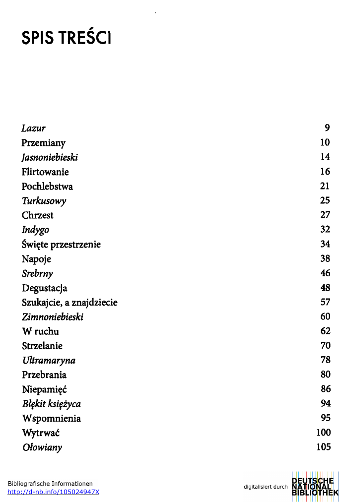 SPIS TREŚCI Lazur Przemiany Jasnoniebieski Flirtowanie Pochlebstwa Turkusowy Chrzest Indygo Święte przestrzenie Napoje Srebrny Degustacja Szukajcie, a znajdziecie Zimnoniebieski W ruchu Strzelanie Ultramaryna Przebrania Niepamięć Błękit księżyca Wspomnienia Wytrwać Ołowiany http://d-nb.info/105024947X 9 10 14 16 21 25 27 32 34 38 46 48 57 60 62 70 78 80 86 94 95 100 105 Ucieczka Przekora Nefrytowy Oddychanie Powrót do domu Tęsknota Błękit nieba Krwiopijcy Szlochanie Grillowanie Purpurowy Trzęsienie Lazuryt Strzyżenie & fryzowanie Dzieci Granatowy Szczekanie & gryzienie Wsłuchiwanie się Czytanie Czarne & białe 107 114 119 120 125 134 138 140 143 152 155 157 161 162 170 175 176 180 186 188