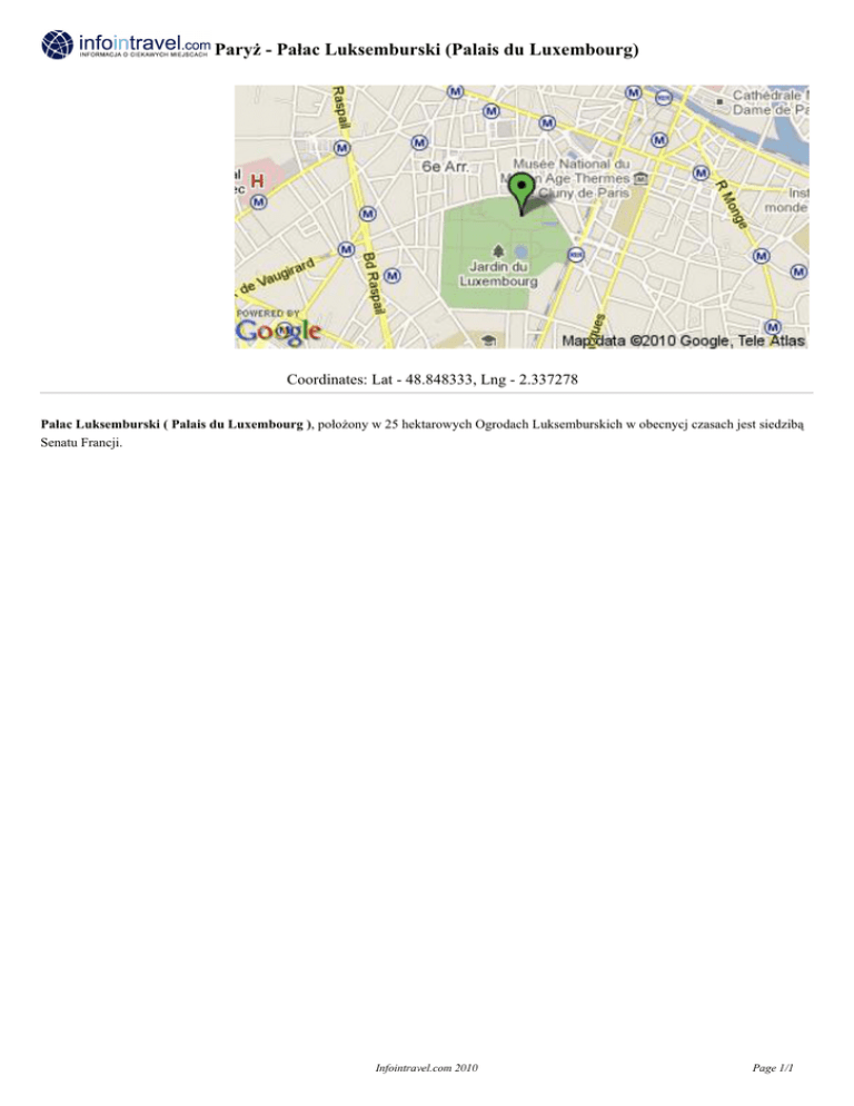 Paryż - Pałac Luksemburski (Palais du Luxembourg) Coordinates: Lat - 48.848333, Lng - 2.337278 Pałac Luksemburski ( Palais du Luxembourg ), położony w 25 hektarowych Ogrodach Luksemburskich w obecnycj czasach jest siedzibą Senatu Francji. Infointravel.com 2010 Page 1/1