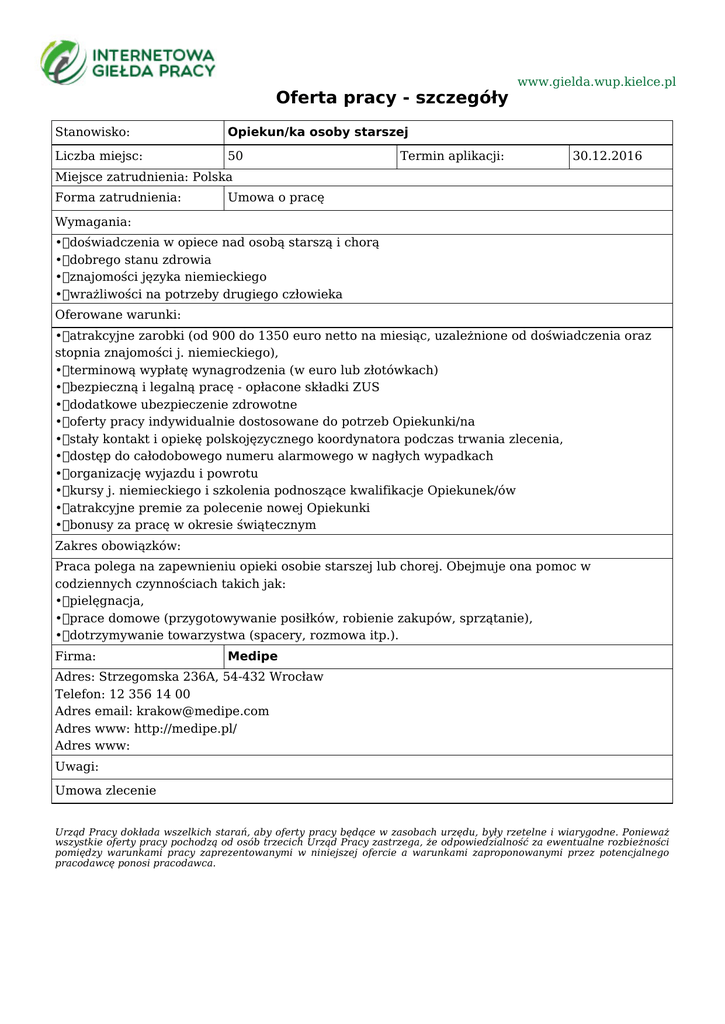 Oferta pracy - szczegóły Stanowisko: Opiekun/ka osoby starszej Liczba miejsc: 50 Termin aplikacji: www.gielda.wup.kielce.pl 30.12.2016 Miejsce zatrudnienia: Polska Forma zatrudnienia: Umowa o pracę Wymagania: •doświadczenia w opiece nad osobą starszą i chorą •dobrego stanu zdrowia •znajomości języka niemieckiego •wrażliwości na potrzeby drugiego człowieka Oferowane warunki: •atrakcyjne zarobki (od 900 do 1350 euro netto na miesiąc, uzależnione od doświadczenia oraz stopnia znajomości j. niemieckiego), •terminową wypłatę wynagrodzenia (w euro lub złotówkach) •bezpieczną i legalną pracę - opłacone składki ZUS •dodatkowe ubezpieczenie zdrowotne •oferty pracy indywidualnie dostosowane do potrzeb Opiekunki/na •stały kontakt i opiekę polskojęzycznego koordynatora podczas trwania zlecenia, •dostęp do całodobowego numeru alarmowego w nagłych wypadkach •organizację wyjazdu i powrotu •kursy j. niemieckiego i szkolenia podnoszące kwalifikacje Opiekunek/ów •atrakcyjne premie za polecenie nowej Opiekunki •bonusy za pracę w okresie świątecznym Zakres obowiązków: Praca polega na zapewnieniu opieki osobie starszej lub chorej. Obejmuje ona pomoc w codziennych czynnościach takich jak: •pielęgnacja, •prace domowe (przygotowywanie posiłków, robienie zakupów, sprzątanie), •dotrzymywanie towarzystwa (spacery, rozmowa itp.). Firma: Medipe Adres: Strzegomska 236A, 54-432 Wrocław Telefon: 12 356 14 00 Adres email: [email protected] Adres www: http://medipe.pl/ Adres www: Uwagi: Umowa zlecenie Urząd Pracy dokłada wszelkich starań, aby oferty pracy będące w zasobach urzędu, były rzetelne i wiarygodne. Ponieważ wszystkie oferty pracy pochodzą od osób trzecich Urząd Pracy zastrzega, że odpowiedzialność za ewentualne rozbieżności pomiędzy warunkami pracy zaprezentowanymi w niniejszej ofercie a warunkami zaproponowanymi przez potencjalnego pracodawcę ponosi pracodawca.
