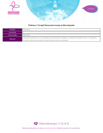Podstawy Terapii Skoncentrowanej na Rozwiązaniu Terminy Liczba dni Czas trwania Adresaci 12.04.2013 1 9:00-16:00 Adresatami szkolenia są m.in. psycholodzy, psychoterapeuci, pedagodzy, opiekunowie socjalni, którzy w swojej pracy chcieliby wykorzystywać metody terapii skoncetrowanej na rozwiązaniu. 1. Założenia i źródła TSR a) Definicja podstawowa TSR, b) Powstanie TSR, c) Związki TSR z innymi modelami/ teoriami. 2. Czym jest Solution Focused Brief Therapy SFBT wg Steve de Shazera? 3. Charakterystyka SFBT a) Krótkoterminowość, b) Realizowanie celów klienta, c) Pozytywne ujęcie 4. Terapia krótkoterminowa a terapia długoterminowa. 5. Ogólne zagadnienia psychologii a TSR a) Spojrzenie na człowieka w TSR, b) Rozumienie psychopatologii, diagnozy i rozpoznania, c) Język klienta, d) Wyjaśnianie a rozwiązywanie. 6. Tworzenie kontekstu spotkania z klientem. 7. Przebieg spotkania z klientem. 8. Typologia klientów wg S. de Shazera i sposoby nawiązywania relacji z pomagaczem a) klient – klient, b) klient - uskarżający się, c) klient – gość. 9. Rodzaje interwencji pomagacza, w kierunku różnych typów klienta. a) Typy relacji terapeutycznych i ich znaczenie w rozpoznawaniu i omijaniu oporu klienta przed zmianą 10. Koncentracja na zasobach. 11. Przebieg pierwszej sesji z klientem - charakterystyka, cele: Tematyka a) analiza potrzeb klienta (a nie problemów), b) analiza zasobów i mocnych stron (a nie deficytów i zaburzeń), c) analiza dotychczasowych osiągnięć (a nie porażek i potknięć), d) analiza wyjątków od sytuacji problemowej (a nie częstotliwości występowania i rozmiarów problemu), e) umiejętność wyraźnego nakreślenia i budowania pożądanej przyszłości. 12. Wywiad z klientem z zastosowaniem genogramu - tworzenie genogramu, zastosowanie, analiza genogramu na potrzeby TSR a) Konstruowanie genogramu i jego interpretacja, b) Struktura pierwszego wywiadu/pierwszej sesji z KLIENTEM/rodziną – zakresy tematyczne kolejnych sesji. 13. Praca Metodą TSR - Metody i techniki TSR: a) Rozmowa poza problemem, b) Komplementowanie - wydobywanie zasobów klienta i zasobów „pomagacza”, c) Cele, d) Pytania cyrkularne, pytania o cud, pytania normatywno-porównawcze, pytania o skalowanie, pytania o wyjątki, Pytania ukierunkowujące na preferowaną przyszłość, e) Wyjątki, f) Skalowanie, g) Pierwszy krok, h) Zadania domowe. 14. Praca Metodą TSR- Metodologia TSR a) skuteczne formowanie celu pracy terapeutycznej, b) Tworzenie obrazu rzeczywistości po osiągnięciu celu, c) Poszukiwanie w przeszłości i teraźniejszości klienta elementów "świata bez problemu", d) Określanie najbliższych kroków w kierunku osiągnięcia celu, e) Monitorowanie wprowadzanych zmian, f) Pomocne techniki TSR, g) Ćwiczenia praktyczne z wykorzystaniem metody TS. Osoba prowadząca Koszt szkolenia Termin zgłoszenia Aleksandra Patyk 300 PLN 2013-04-11