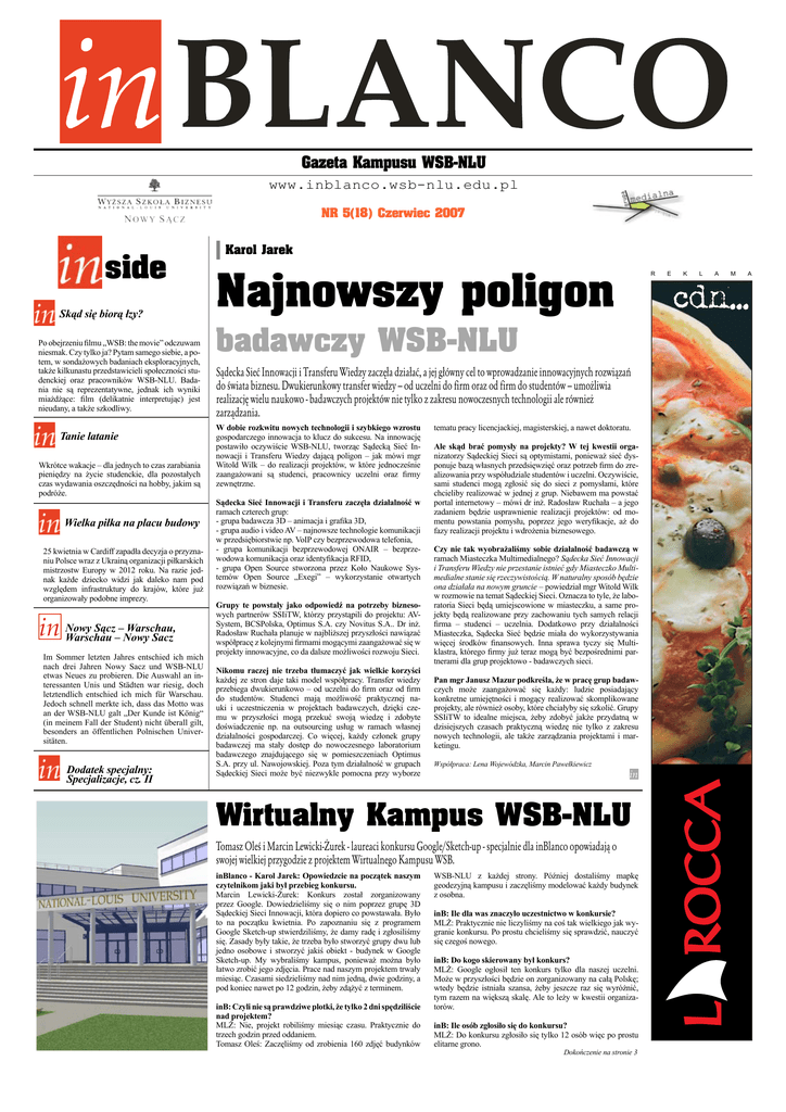 Gazeta Kampusu WSB-NLU www.inblanco.wsb-nlu.edu.pl NR 5(18) Czerwiec 2007 side Skąd się biorą łzy? Po obejrzeniu filmu „WSB: the movie” odczuwam niesmak. Czy tylko ja? Pytam samego siebie, a potem, w sondażowych badaniach eksploracyjnych, także kilkunastu przedstawicieli społeczności studenckiej oraz pracowników WSB-NLU. Badania nie są reprezentatywne, jednak ich wyniki miażdżące: film (delikatnie interpretując) jest nieudany, a także szkodliwy. Tanie latanie Wkrótce wakacje – dla jednych to czas zarabiania pieniędzy na życie studenckie, dla pozostałych czas wydawania oszczędności na hobby, jakim są podróże. Wielka piłka na placu budowy 25 kwietnia w Cardiff zapadła decyzja o przyznaniu Polsce wraz z Ukrainą organizacji piłkarskich mistrzostw Europy w 2012 roku. Na razie jednak każde dziecko widzi jak daleko nam pod względem infrastruktury do krajów, które już organizowały podobne imprezy. Sącz – Warschau, in Nowy Warschau – Nowy Sacz Im Sommer letzten Jahres entschied ich mich nach drei Jahren Nowy Sacz und WSB-NLU etwas Neues zu probieren. Die Auswahl an interessanten Unis und Städten war riesig, doch letztendlich entschied ich mich für Warschau. Jedoch schnell merkte ich, dass das Motto was an der WSB-NLU galt „Der Kunde ist König“ (in meinem Fall der Student) nicht überall gilt, besonders an öffentlichen Polnischen Universitäten. Dodatek specjalny: Specjalizacje, cz. II Karol Jarek Najnowszy poligon R badawczy WSB-NLU Sądecka Sieć Innowacji i Transferu Wiedzy zaczęła działać, a jej główny cel to wprowadzanie innowacyjnych rozwiązań do świata biznesu. Dwukierunkowy transfer wiedzy – od uczelni do firm oraz od firm do studentów – umożliwia realizację wielu naukowo - badawczych projektów nie tylko z zakresu nowoczesnych technologii ale również zarządzania. W dobie rozkwitu nowych technologii i szybkiego wzrostu gospodarczego innowacja to klucz do sukcesu. Na innowację postawiło oczywiście WSB-NLU, tworząc Sądecką Sieć Innowacji i Transferu Wiedzy dającą poligon – jak mówi mgr Witold Wilk – do realizacji projektów, w które jednocześnie zaangażowani są studenci, pracownicy uczelni oraz firmy zewnętrzne. Sądecka Sieć Innowacji i Transferu zaczęła działalność w ramach czterech grup: - grupa badawcza 3D – animacja i grafika 3D, - grupa audio i video AV – najnowsze technologie komunikacji w przedsiębiorstwie np. VoIP czy bezprzewodowa telefonia, - grupa komunikacji bezprzewodowej ONAIR – bezprzewodowa komunikacja oraz identyfikacja RFID, - grupa Open Source stworzona przez Koło Naukowe Systemów Open Source „Exegi” – wykorzystanie otwartych rozwiązań w biznesie. Grupy te powstały jako odpowiedź na potrzeby biznesowych partnerów SSIiTW, którzy przystąpili do projektu: AVSystem, BCSPolska, Optimus S.A. czy Novitus S.A.. Dr inż. Radosław Ruchała planuje w najbliższej przyszłości nawiązać współpracę z kolejnymi firmami mogącymi zaangażować się w projekty innowacyjne, co da dalsze możliwości rozwoju Sieci. Nikomu raczej nie trzeba tłumaczyć jak wielkie korzyści każdej ze stron daje taki model współpracy. Transfer wiedzy przebiega dwukierunkowo – od uczelni do firm oraz od firm do studentów. Studenci mają możliwość praktycznej nauki i uczestniczenia w projektach badawczych, dzięki czemu w przyszłości mogą przekuć swoją wiedzę i zdobyte doświadczenie np. na outsourcing usług w ramach własnej działalności gospodarczej. Co więcej, każdy członek grupy badawczej ma stały dostęp do nowoczesnego laboratorium badawczego znajdującego się w pomieszczeniach Optimus S.A. przy ul. Nawojowskiej. Poza tym działalność w grupach Sądeckiej Sieci może być niezwykle pomocna przy wyborze tematu pracy licencjackiej, magisterskiej, a nawet doktoratu. Ale skąd brać pomysły na projekty? W tej kwestii organizatorzy Sądeckiej Sieci są optymistami, ponieważ sieć dysponuje bazą własnych przedsięwzięć oraz potrzeb firm do zrealizowania przy współudziale studentów i uczelni. Oczywiście, sami studenci mogą zgłosić się do sieci z pomysłami, które chcieliby realizować w jednej z grup. Niebawem ma powstać portal internetowy – mówi dr inż. Radosław Ruchała – a jego zadaniem będzie usprawnienie realizacji projektów: od momentu powstania pomysłu, poprzez jego weryfikacje, aż do fazy realizacji projektu i wdrożenia biznesowego. Czy nie tak wyobrażaliśmy sobie działalność badawczą w ramach Miasteczka Multimedialnego? Sądecka Sieć Innowacji i Transferu Wiedzy nie przestanie istnieć gdy Miasteczko Multimedialne stanie się rzeczywistością. W naturalny sposób będzie ona działała na nowym gruncie – powiedział mgr Witold Wilk w rozmowie na temat Sądeckiej Sieci. Oznacza to tyle, że laboratoria Sieci będą umiejscowione w miasteczku, a same projekty będą realizowane przy zachowaniu tych samych relacji firma – studenci – uczelnia. Dodatkowo przy działalności Miasteczka, Sądecka Sieć będzie miała do wykorzystywania więcej środków finansowych. Inna sprawa tyczy się Multiklastra, którego firmy już teraz mogą być bezpośrednimi partnerami dla grup projektowo - badawczych sieci. Pan mgr Janusz Mazur podkreśla, że w pracę grup badawczych może zaangażować się każdy: ludzie posiadający konkretne umiejętności i mogący realizować skomplikowane projekty, ale również osoby, które chciałyby się szkolić. Grupy SSIiTW to idealne miejsca, żeby zdobyć jakże przydatną w dzisiejszych czasach praktyczną wiedzę nie tylko z zakresu nowych technologii, ale także zarządzania projektami i marketingu. Współpraca: Lena Wojewódzka, Marcin Pawełkiewicz in Wirtualny Kampus WSB-NLU Tomasz Oleś i Marcin Lewicki-Żurek - laureaci konkursu Google/Sketch-up - specjalnie dla inBlanco opowiadają o swojej wielkiej przygodzie z projektem Wirtualnego Kampusu WSB. inBlanco - Karol Jarek: Opowiedzcie