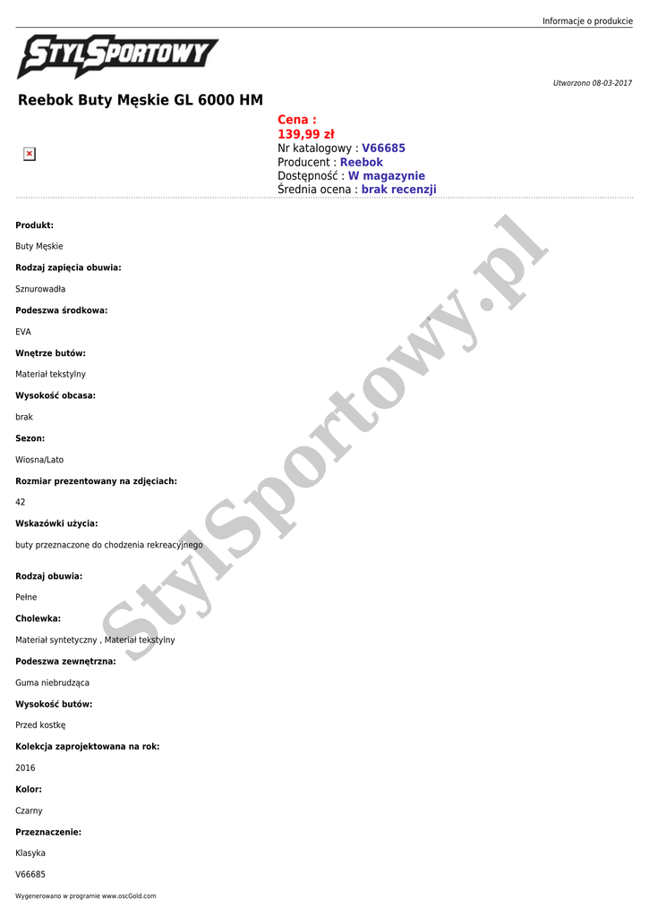 Informacje o produkcie Utworzono 08-03-2017 Reebok Buty Męskie GL 6000 HM Cena : 139,99 zł Nr katalogowy : V66685 Producent : Reebok Dostępność : W magazynie Średnia ocena : brak recenzji Produkt: pl Buty Męskie Rodzaj zapięcia obuwia: y. Sznurowadła Podeszwa środkowa: Wnętrze butów: Materiał tekstylny Wysokość obcasa: brak Sezon: Wiosna/Lato 42 Wskazówki użycia: lS p Rozmiar prezentowany na zdjęciach: buty przeznaczone do chodzenia rekreacyjnego Pełne Cholewka: St y Rodzaj obuwia: or to w EVA Materiał syntetyczny , Materiał tekstylny Podeszwa zewnętrzna: Guma niebrudząca Wysokość butów: Przed kostkę Kolekcja zaprojektowana na rok: 2016 Kolor: Czarny Przeznaczenie: Klasyka V66685 Wygenerowano w programie www.oscGold.com Dostępne opcje Reebok Buty Męskie GL 6000 HM St y lS p or to w y. pl Rozmiar: 43, 44.5, 42, 41, 40.5, 47, 45.5, 45, 44, 42.5.