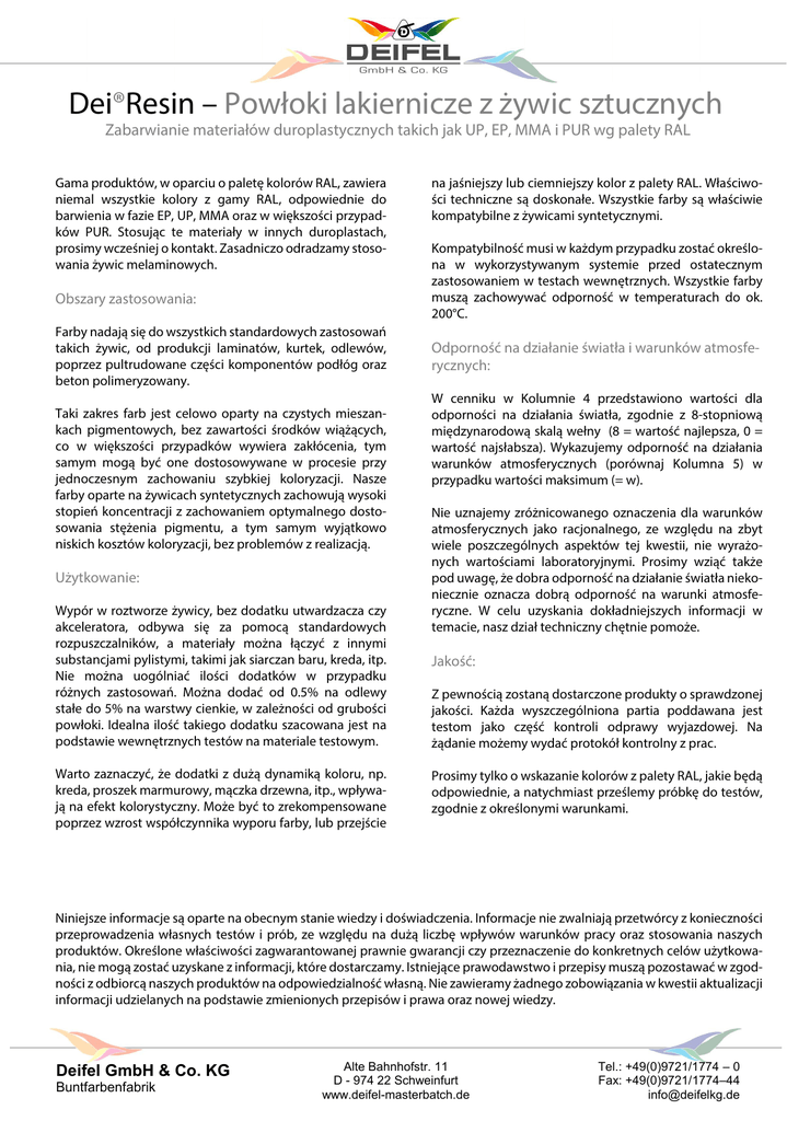 Dei®Resin – Powłoki lakiernicze z żywic sztucznych Zabarwianie materiałów duroplastycznych takich jak UP, EP, MMA i PUR wg palety RAL Gama produktów, w oparciu o paletę kolorów RAL, zawiera niemal wszystkie kolory z gamy RAL, odpowiednie do barwienia w fazie EP, UP, MMA oraz w większości przypadków PUR. Stosując te materiały w innych duroplastach, prosimy wcześniej o kontakt. Zasadniczo odradzamy stosowania żywic melaminowych. Obszary zastosowania: Farby nadają się do wszystkich standardowych zastosowań takich żywic, od produkcji laminatów, kurtek, odlewów, poprzez pultrudowane części komponentów podłóg oraz beton polimeryzowany. Taki zakres farb jest celowo oparty na czystych mieszankach pigmentowych, bez zawartości środków wiążących, co w większości przypadków wywiera zakłócenia, tym samym mogą być one dostosowywane w procesie przy jednoczesnym zachowaniu szybkiej koloryzacji. Nasze farby oparte na żywicach syntetycznych zachowują wysoki stopień koncentracji z zachowaniem optymalnego dostosowania stężenia pigmentu, a tym samym wyjątkowo niskich kosztów koloryzacji, bez problemów z realizacją. Użytkowanie: Wypór w roztworze żywicy, bez dodatku utwardzacza czy akceleratora, odbywa się za pomocą standardowych rozpuszczalników, a materiały można łączyć z innymi substancjami pylistymi, takimi jak siarczan baru, kreda, itp. Nie można uogólniać ilości dodatków w przypadku różnych zastosowań. Można dodać od 0.5% na odlewy stałe do 5% na warstwy cienkie, w zależności od grubości powłoki. Idealna ilość takiego dodatku szacowana jest na podstawie wewnętrznych testów na materiale testowym. Warto zaznaczyć, że dodatki z dużą dynamiką koloru, np. kreda, proszek marmurowy, mączka drzewna, itp., wpływają na efekt kolorystyczny. Może być to zrekompensowane poprzez wzrost współczynnika wyporu farby, lub przejście na jaśniejszy lub ciemniejszy kolor z palety RAL. Właściwości techniczne są doskonałe. Wszystkie farby są właściwie kompatybilne z żywicami syntetycznymi. Kompatybilność musi w każdym przypadku zostać określona w wykorzystywanym systemie przed ostatecznym zastosowaniem w testach wewnętrznych. Wszystkie farby muszą zachowywać odporność w temperaturach do ok. 200°C. Odporność na działanie światła i warunków atmosferycznych: W cenniku w Kolumnie 4 przedstawiono wartości dla odporności na działania światła, zgodnie z 8-stopniową międzynarodową skalą wełny (8 = wartość najlepsza, 0 = wartość najsłabsza). Wykazujemy odporność na działania warunków atmosferycznych (porównaj Kolumna 5) w przypadku wartości maksimum (= w). Nie uznajemy zróżnicowanego oznaczenia dla warunków atmosferycznych jako racjonalnego, ze względu na zbyt wiele poszczególnych aspektów tej kwestii, nie wyrażonych wartościami laboratoryjnymi. Prosimy wziąć także pod uwagę, że dobra odporność na działanie światła niekoniecznie oznacza dobrą odporność na warunki atmosferyczne. W celu uzyskania dokładniejszych informacji w temacie, nasz dział techniczny chętnie pomoże. Jakość: Z pewnością zostaną dostarczone produkty o sprawdzonej jakości. Każda wyszczególniona partia poddawana jest testom jako część kontroli odprawy wyjazdowej. Na żądanie możemy wydać protokół kontrolny z prac. Prosimy tylko o wskazanie kolorów z palety RAL, jakie będą odpowiednie, a natychmiast prześlemy próbkę do testów, zgodnie z określonymi warunkami. Niniejsze informacje są oparte na obecnym stanie wiedzy i doświadczenia. Informacje nie zwalniają przetwórcy z konieczności przeprowadzenia własnych testów i prób, ze względu na dużą liczbę wpływów warunków pracy oraz stosowania naszych produktów. Określone właściwości zagwarantowanej prawnie gwarancji czy przeznaczenie do konkretnych celów użytkowania, nie mogą zostać uzyskane z informacji, które dostarczamy. Istniejące prawodawstwo i przepisy muszą pozostawać w zgodności z odbiorcą naszych produktów na odpowiedzialność własną. Nie zawieramy żadnego zobowiązania w kwestii aktualizacji informacji udzielanych na podstawie zmienionych przepisów i prawa oraz nowej wiedzy. Deifel GmbH & Co. KG Buntfarbenfabrik Alte Bahnhofstr. 11 D - 974 22 Schweinfurt www.deifel-masterbatch.de Tel.: +49(0)9721/1774 – 0 Fax: +49(0)9721/1774–44 [email protected]