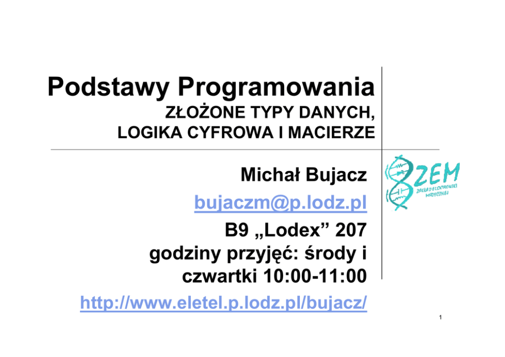 Podstawy Programowania ZŁOŻONE TYPY DANYCH, LOGIKA CYFROWA I MACIERZE Michał Bujacz [email protected] B9 „Lodex” 207 godziny przyjęć: środy i czwartki 10:00-11:00 http://www.eletel.p.lodz.pl/bujacz/ 1 Pytania z ostatniego wykładu: o o o o o o Instrukcja (Instruction) Zmienna (Variable), nazwa (Identifier) Słowo kluczowe (Keyword) Wyrażenie (Expression) Operator (Operator) Komentarz (Comment) 2 Pytania z ostatniego wykładu: o Integer / short / long • o Floating point / double • o o co to „two’s complement” ? co to mantysa i wykładnik? Char Boolean Pytania z ostatniego wykładu: o o o Jaka jest największa liczba całkowita jaką możemy zapisać na 2 bajtach? Ze znakiem? Bez znaku? Zapisz liczbę FF34 binarnie i dziesiętnie Ile spacji powinno oddzielać każdy poziom kodu w Pythonie? Logika cyfrowa Operatory cyfrowe x << y x&y przesuń bity o y w lewo po prawej wchodzą zera y to samo co mnożenie przez 2 przesuń bity o y w prawo po lewej wchodzą zera y to samo co dzielenie przez 2 AND x|y OR ~x negacja bitowa liczbowo to -x - 1 XOR x >> y x^y Maskowanie bitowe o Rejestr R R7 ? o o o R6 ? R5 ? R4 ? R3 ? R2 ? Jak sprawdzić co siedzi w R4 ? Jak przestawić R4 na 1? Jak przestawić R4 na 0? R1 ? R0 ? Maskowanie – odczyt bitu o Jak sprawdzić co siedzi w R4 ? R7 ? R6 ? R5 ? R4 ? R3 ? R2 ? R1 ? R0 ? AND 0 0 0 1 0 0 0 0 = 0 0 0 ? 0 0 0 0 10011101 AND 00001000 = 00001000 10010101 00001000 00000000 Maskowanie – ustawianie bitu Jak przestawić R4 na 1? OR = R7 ? R6 ? R5 ? R4 ? R3 ? R2 ? R1 ? R0 ? 0 0 0 1 0 0 0 0 ? ? ? 1 ? ? ? ? 10011101 OR 00001000 = 10011101 10010101 00001000 10011101 Maskowanie – zerowanie bitu Jak przestawić R4 na 0? R7 ? R6 ? R5 ? R4 ? R3 ? R2 ? R1 ? R0 ? AND 1 1 1 0 1 1 1 1 = ? ? ? 0 ? ? ? ? 10011101 AND 11110111 = 10010101 10010101 11110111 10010101 Konwersja little-big endian Jak wykonać operację x y dla 4 bajtowych liczb? x = 4F 52 17 01 y = 01 17 52 4F y1 = x >> 24 y2 = x & 00FF0000 y2 = y2 >> 8 y3 = x & 0000FF00 y3 = y3 << 8 y4 = x << 24 y = y1 | y2 | y3 | y4 # # # # # # # 00 00 00 00 00 01 01 00 52 00 00 17 00 17 00 00 52 17 00 00 52 4F 00 00 00 00 00 4F Złożone typy danych Jedna zmienna może odnosić się do zbioru danych jednego lub kilku różnych typów o Tablice/Sekwencje (list, str, buffer, np.matrix) o Zbiory/słowniki (set,dict) o Struktury/Rekordy o Klasy/obiekty 12 Tablice/Sekwencje o o o o o zmienne indeksowane, uporządkowane indeksy zaczynają się od 0 (wyjątki – Matlab, Mathematica, Fortran, zaczynają od 1) indeks podawany w kwadratowych klamrach zazwyczaj jeden typ danych jedno lub wielowymiarowe Tablice w Pytonie o o o o o Dość nietypowe w porównaniu z większością języków (np. Java czy C) mogą trzymać dowolne i różne typy danych (heterogenous) mogą dynamicznie zmieniać rozmiar i typ danych (mutable) indeksowane od 0 można używać ujemnych indeksów Tworzenie tablic/list o lista = [1, 3.14, ‘a’, ‘b’, ‘c’] o lista [1, 3.14, ‘a’, ‘b’, ‘c’] o lista[0] 1 o lista[-1] ‘c’ Tworzenie tablic (2) o lista2 = [0]*5 #tworzy tablicę o 5 elementach równych 0 SIZE = 1024 bufor = [0]*SIZE Metody do użycia na tablicach <lista>.append(x) dodaj wartość x do końca listy (wydłuża tablicę o 1) <lista>.sort() sortuj listę (parametr decyduje o kolejności) <lista>.reverse() odwraca kolejność elementów w liście <lista>.index(x) zwraca indeks kiedy wartość x pojawia się pierwszy raz <lista>.insert(i, x) wstawia wartość x pod indeks i (wydłuża tablicę o 1) <lista>.count(x) liczy ile razy wartość x pojawia się w liście <lista>.remove(x) usuwa pierwszy element równy x (skraca tablicę o 1) <lista>.pop(i) usuwa element o indeksie i, zwraca jego wartość (skraca tablicę o 1) Operatory na listach <lista> <lista> + * <lista> <liczba> <lista>[i] len(<lista>) <lista>[:] for <zmienna> in <lista>: <x> in <lista> scalenie (concatenation) powielenie wartość pod indeksem i długość listy cięcie (slicing) – zwraca nową listę od (włacznie) do pętla „po liście” sprawdza czy wartość jest w sekwencji (zwraca prawdę/fałsz) Używanie listy jako stosu o o o > Stos to popularna struktura programistyczna typu „Last-in, first-out” Odkładamy na stos - powiększamy listę o element Zdejmujemy ze stosu -> skracamy listę stos = [10] > stos.append(20) # push > stos [10, 20] > stos.pop() #kasuje i zwraca ostatni element 20 Zbiory, słowniki Jak sekwencje, tylko nie indeksowane liczbowo Zbiory (set) nie zawierają powtarzających się elementów Słowniki (dict) zawierają pary klucz:wartość Zbiory, przykład >>> koszyk = ['apple', 'orange', 'apple', 'pear', 'orange', 'banana'] #lista owocow >>> owoce = set(basket) #zbior owocow >>> owoce set(['orange', 'pear', 'apple', 'banana']) >>> 'orange' in owoce #czy cos jest w zbiorze? True >>> ‘pineapple' in owoce False Operacje na zbiorach >>> a = set('abracadabra') >>> b = set('alacazam') >>> a # litery w a set(['a', 'r', 'b', 'c', 'd']) >>> a - b set(['r', 'd', 'b']) # litery w a, ale nie w b >>> a | b # litery w a lub w b set(['a', 'c', 'r', 'd', 'b', 'm', 'z', 'l']) >>> a & b set(['a', 'c']) # litery w a i w b >>> a ^ b # (a | b) – (a & b) set(['r', 'd', 'b', 'm', 'z', 'l']) Przykład słownika >>> tel = {'jack': 4098, 'sape': 4139} >>> tel['guido'] = 4127 >>> tel {'sape': 4139, 'guido': 4127, 'jack': 4098} >>> tel['jack'] 4098 >>> del tel['sape'] >>> tel['irv'] = 4127 >>> tel {'guido': 4127, 'irv': 4127, 'jack': 4098} >>> list(tel.keys()) ['irv', 'guido', 'jack'] >>> sorted(tel.keys()) ['guido', 'irv', 'jack'] >>> 'guido' in tel True >>> 'jack' not in tel False Łańcuchy (string) o w prezentacji Marka Programing exercises PROGRAMMING EXERCISE 25