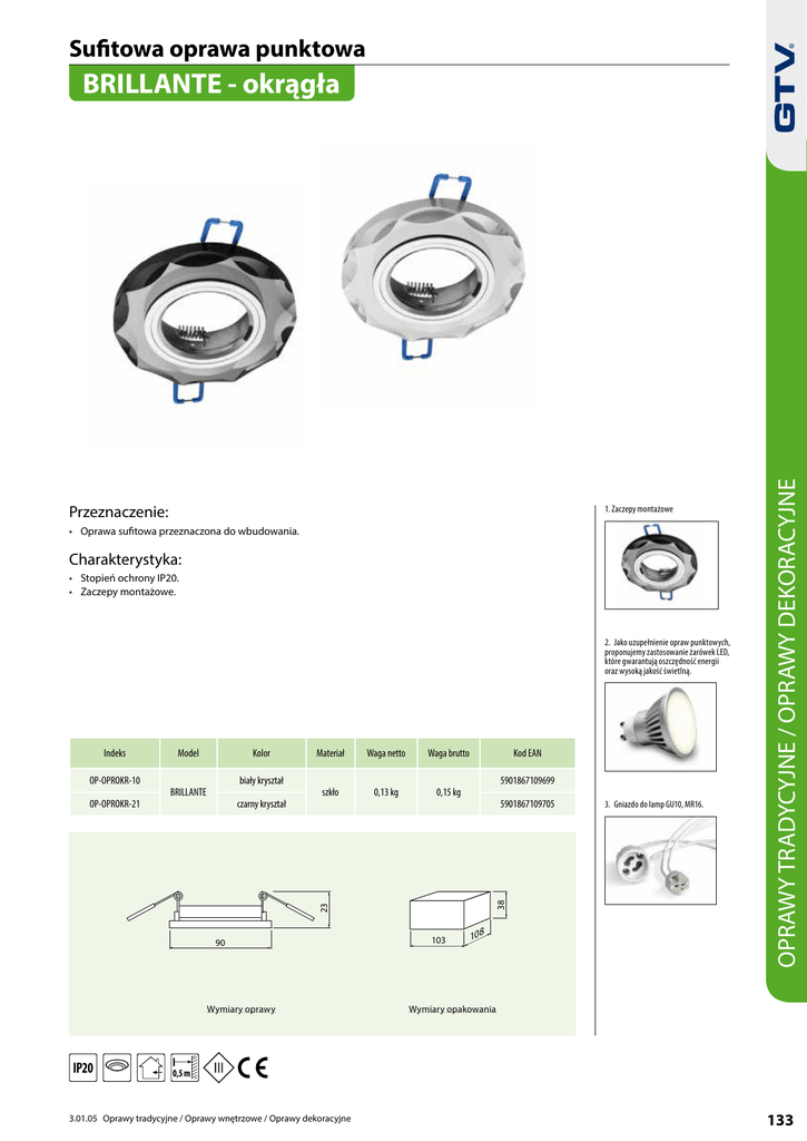 Sufitowa oprawa punktowa Przeznaczenie: 1. Zaczepy montażowe • Oprawa sufitowa przeznaczona do wbudowania. Charakterystyka: • Stopień ochrony IP20. • Zaczepy montażowe. 2. Jako uzupełnienie opraw punktowych, proponujemy zastosowanie żarówek LED, k tóre gwarantują oszczędność energii oraz wysoką jakość świetlną. OP-OPROKR-10 Kolor biały kryształ BRILLANTE czarny kryształ Materiał Waga netto Waga brutto szkło 0,13 kg 0,15 kg Kod EAN 5901867109699 5901867109705 23 OP-OPROKR-21 Model 38 Indeks 90 Wymiary oprawy IP20 103 108 3. Gniazdo do lamp GU10, MR16. OPRAWY TRADYCYJNE / OPRAWY DEKORACYJNE BRILLANTE - okrągła Wymiary opakowania 0,5 m 3.01.05 Oprawy tradycyjne / Oprawy wnętrzowe / Oprawy dekoracyjne 133