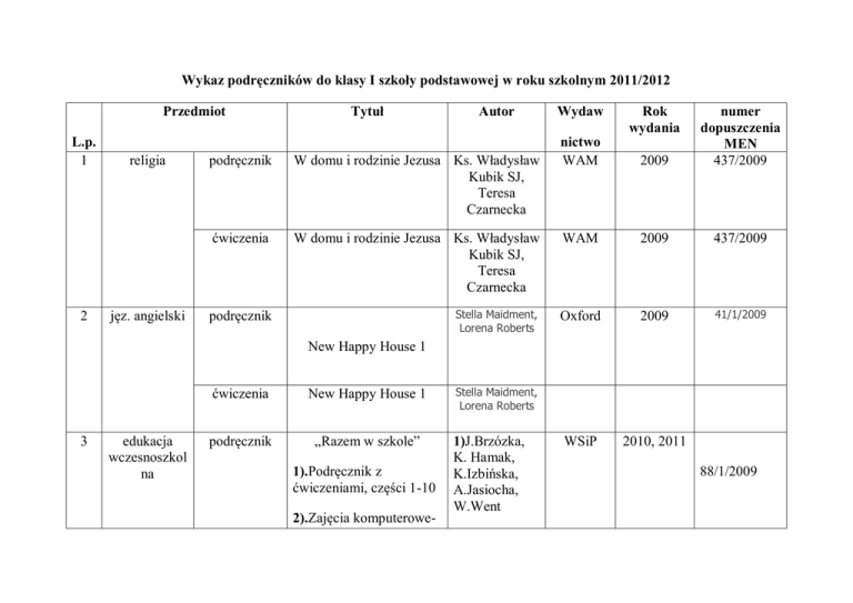 Wykaz podręczników do klasy I szkoły podstawowej w roku szkolnym 2011/2012 Przedmiot L.p. 1 2 religia jęz. angielski Tytuł Autor Wydaw Rok wydania nictwo WAM 2009 numer dopuszczenia MEN 437/2009 podręcznik W domu i rodzinie Jezusa Ks. Władysław Kubik SJ, Teresa Czarnecka ćwiczenia W domu i rodzinie Jezusa Ks. Władysław Kubik SJ, Teresa Czarnecka WAM 2009 437/2009 podręcznik Stella Maidment, Lorena Roberts Oxford 2009 41/1/2009 WSiP 2010, 2011 New Happy House 1 3 edukacja wczesnoszkol na ćwiczenia New Happy House 1 podręcznik „Razem w szkole” 1).Podręcznik z ćwiczeniami, części 1-10 2).Zajęcia komputerowe- Stella Maidment, Lorena Roberts 1)J.Brzózka, K. Hamak, K.Izbińska, A.Jasiocha, W.Went 88/1/2009 ćwiczenia podręcznik z ćwiczeniami 2)D.Kręcisz, i CD-ROM B.Lewandows ka, M.WalczakSarao” 1). zeszyt, części 1-10 1)J.Brzózka, K. Hamak, 2). Wyprawka K.Izbińska, A.Jasiocha, 3). Bawię się i uczę w W.Went klasie 1-CD-ROM 137/1/2009 88/1/2009 Wykaz podręczników do klasy II szkoły podstawowej w roku szkolnym 2011/2012 Tytuł Przedmiot L.p. 1 religia Podręcznik Bliscy Sercu Jezusa ćwiczenia Bliscy Sercu Jezusa Autor Wydaw nictwo Ks. Władysław WAM Kubik SJ, Teresa Czarnecka Ks. Władysław WAM Kubik SJ, Teresa Czarnecka Rok wydania 2010 numer dopuszczenia MEN 874/2010 2010 874/2010 2 3 jęz. angielski edukacja wczesnoszkol na podręcznik New Happy House 2 Stella Maidment, Lorena Roberts ćwiczenia New Happy House 2 Stella Maidment, Lorena Roberts podręcznik „Wesoła szkoła” 1.Podręcznik Część 1,2,3,4,5 2.Zajecia komputerowe Podręcznik z ćwiczeniami ćwiczenia 1.Karty pracy Część 1, 2,3,4,5 2.Matematyka Część 1,2,3,4,5 Hanna Dobrowolska, Anna Konieczna Oxford WSiP 2009 2009 41/2/2009 18/3/2009 Danuta Kręcisz Hanna Dobrowolska, Anna konieczna, Krystyna Wasilewska Jadwiga Hanisz WSiP WSiP 2010 18/3/2009 136/2/2010 2009 WSiP 18/3/2009 2009 Wykaz podręczników do klasy III szkoły podstawowej w roku szkolnym 2011/2012 Tytuł Przedmiot L.p 1 religia podręcznik ćwiczenia 2 jęz. angielski podręcznik ćwiczenia 3 edukacja wczesnoszkolna podręcznik Autor Jezusowa Wspólnota Serc Ks. Władysław Kubik SJ, Teresa Czarnecka Jezusowa Wspólnota Serc Ks. Władysław Kubik SJ, Teresa Czarnecka Stella New Happy House 3 New Happy House 3 Maidment, Lorena Roberts Stella Maidment, Lorena Roberts Gra w kolory Podręcznik cz. 1,2, Matematyka cz. 1,2,3,4 Katarzyna Grodzka Wydawnictw o Rok wydania WAM 2004 numer dopuszczenia MEN 875/2004 WAM 2004 875/2004 Oxford 2009 41/3/2009 Juka 2009 87/3/2011 Śpiewnik ćwiczenia Gra w kolory Ćwiczenia humanistyczne cz. 1,2,3,4 Wyprawka dla ucznia CD-ROM kl. 3 - płyta informatyczna Katarzyna Grodzka Juka 2009 87/3/2011