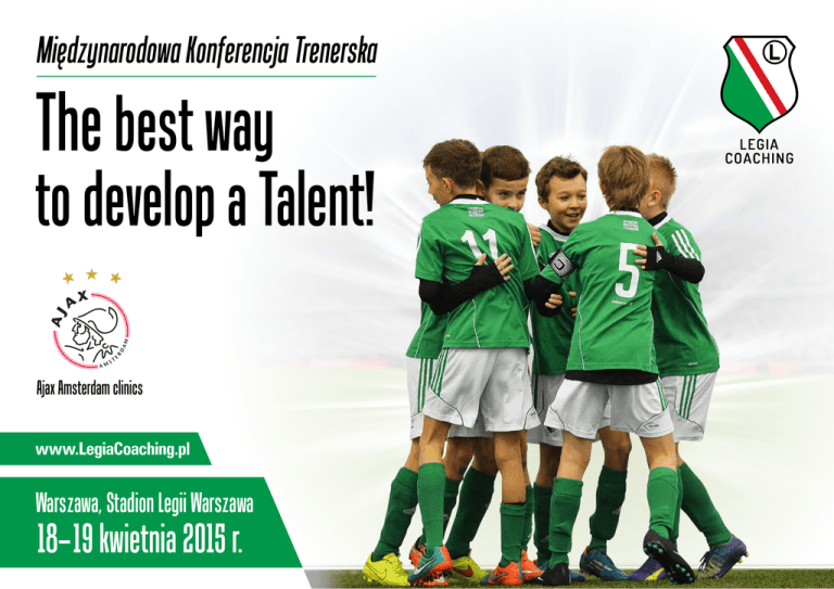 Międzynarodowa Konferencja Trenerska The best way to develop a Talent! Ajax Amsterdam clinics www.LegiaCoaching.pl Warszawa, Stadion Legii Warszawa 18–19 kwietnia 2015 r. W programie Konferencji m. in.: • Prezentacje szkoleniowe: - Jak Ajax wychowuje profesjonalnych piłkarzy. - Ruch w piłce nożnej w ramach programu Szybkość i Koordynacja. - Akademia techniki. - Jak wybieramy młodych piłkarzy? Scouting / wyszukiwanie talentów. • Zajęcia praktyczne na boisku Legii Warszawa. W cenie Konferencji m. in.: • Materiały szkoleniowe. • Oficjalne certyfikaty ukończenia szkolenia. • Bilet na mecz T-Mobile Ekstraklasy z udziałem Legii Warszawa rozgrywany na Stadionie przy ul. Łazienkowskiej 3. • T łumaczenie symultaniczne z języka angielskiego na język polski. • Lunch. • Poczęstunki w trakcie trwania konferencji. Trenerzy prowadzący: EDDIE JOHAN VAN SCHAICK – Ajax Amsterdam Youth Academy Consultant JOHANNES CORNELIS SPLINTER – Ajax Amsterdam Youth Academy Coach Zapisz się już teraz i skorzystaj z promocji: 490 zł,- Liczba miejsc jest ograniczona, decyduje kolejność zgłoszeń. ZAPISZ SIĘ Po więcej informacji zapraszamy na stronę www.LegiaCoaching.pl. Jesteśmy do dyspozycji także pod [email protected] oraz numerem telefonu 22 318 20 17 (linia czynna w dni powszednie od 10:00 do 17:00).