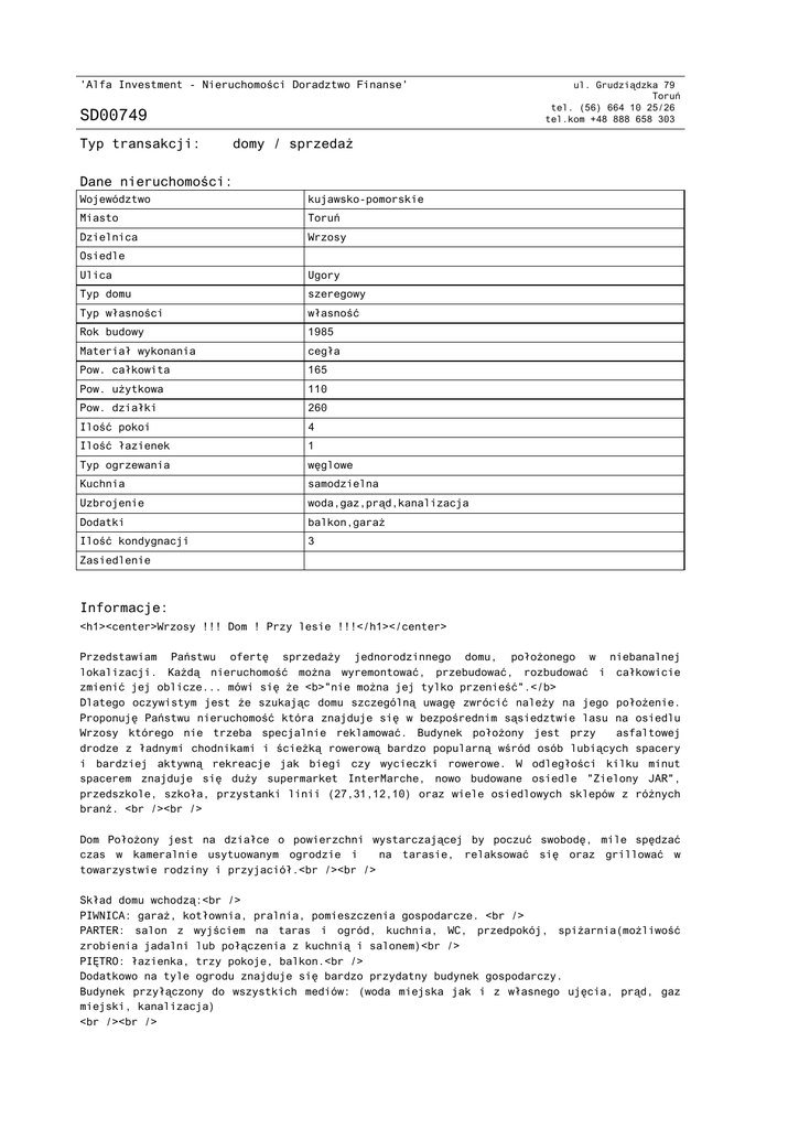 'Alfa Investment - Nieruchomości Doradztwo Finanse' SD00749 Typ transakcji: ul. Grudziądzka 79 Toruń tel. (56) 664 10 25/26 tel.kom +48 888 658 303 domy / sprzedaż Dane nieruchomości: Województwo kujawsko-pomorskie Miasto Toruń Dzielnica Wrzosy Osiedle Ulica Ugory Typ domu szeregowy Typ własności własność Rok budowy 1985 Materiał wykonania cegła Pow. całkowita 165 Pow. użytkowa 110 Pow. działki 260 Ilość pokoi 4 Ilość łazienek 1 Typ ogrzewania węglowe Kuchnia samodzielna Uzbrojenie woda,gaz,prąd,kanalizacja Dodatki balkon,garaż Ilość kondygnacji 3 Zasiedlenie Informacje: <h1><center>Wrzosy !!! Dom ! Przy lesie !!!</h1></center> Przedstawiam Państwu ofertę sprzedaży jednorodzinnego domu, położonego w niebanalnej lokalizacji. Każdą nieruchomość można wyremontować, przebudować, rozbudować i całkowicie zmienić jej oblicze... mówi się że <b>"nie można jej tylko przenieść".</b> Dlatego oczywistym jest że szukając domu szczególną uwagę zwrócić należy na jego położenie. Proponuję Państwu nieruchomość która znajduje się w bezpośrednim sąsiedztwie lasu na osiedlu Wrzosy którego nie trzeba specjalnie reklamować. Budynek położony jest przy asfaltowej drodze z ładnymi chodnikami i ścieżką rowerową bardzo popularną wśród osób lubiących spacery i bardziej aktywną rekreacje jak biegi czy wycieczki rowerowe. W odległości kilku minut spacerem znajduje się duży supermarket InterMarche, nowo budowane osiedle "Zielony JAR", przedszkole, szkoła, przystanki linii (27,31,12,10) oraz wiele osiedlowych sklepów z różnych branż. <br /><br /> Dom Położony jest na działce o powierzchni wystarczającej by poczuć swobodę, mile spędzać czas w kameralnie usytuowanym ogrodzie i na tarasie, relaksować się oraz grillować w towarzystwie rodziny i przyjaciół.<br /><br /> Skład domu wchodzą:<br /> PIWNICA: garaż, kotłownia, pralnia, pomieszczenia gospodarcze. <br /> PARTER: salon z wyjściem na taras i ogród, kuchnia, WC, przedpokój, spiżarnia(możliwość zrobienia jadalni lub połączenia z kuchnią i salonem)<br /> PIĘTRO: łazienka, trzy pokoje, balkon.<br /> Dodatkowo na tyle ogrodu znajduje się bardzo przydatny budynek gospodarczy. Budynek przyłączony do wszystkich mediów: (woda miejska jak i z własnego ujęcia, prąd, gaz miejski, kanalizacja) <br /><br /> Nieruchomość wymaga remontu jednak przy odpowiednio skalkulowanej cenie i możliwościach aranżacyjnych jakie posiada na pewno stanowi okazję dla tych którzy mają wyobraźnie i chcą mieszkać w domu, który będzie dokładnie taki jaki sobie Państwo wymarzyliście.<br /><br /> Cena do negocjacji !!! <br /><br /> Serdecznie zapraszam na prezentację nieruchomości, z przyjemnością odpowiem Państwu na wszelkie pytania oraz udzielę dodatkowych informacji. <br /><br /> <b> Marek Paradowski, tel.885-902-462, [email protected] </b><br /><br />Pośrednik odpowiedzialny zawodowo: Paweł Dawidowicz licencja pośrednika w obrocie nieruchomościami 7432 Andrzej Pamin licencja pośrednika w obrocie nieruchomościami 1145. UWAGA!!! BEZPŁATNIE POMAGAMY W UZYSKANIU KREDYTU NA ZAKUP NIERUCHOMOŚCI. WSPÓŁPRACUJEMY Z WIELOMA BANKAMI.Treść niniejszego ogłoszenia nie stanowi oferty handlowej w rozumieniu przepisów Kodeksu Cywilnego. Więcej ofert na www.alfa-investment.pl ZAPRASZAMY! Cena: 465 000 PLN Dokument wygenerowany ze strony www.alfa-investment.pl Strona 2