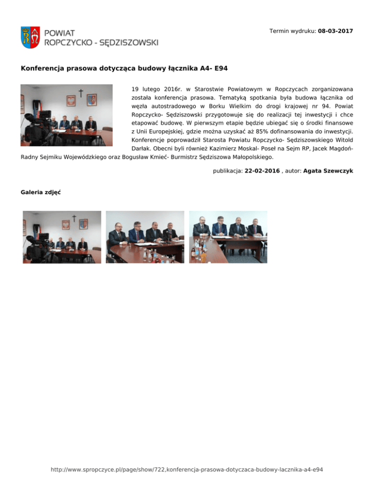 Termin wydruku: 08-03-2017 Konferencja prasowa dotycząca budowy łącznika A4- E94 19 lutego 2016r. w Starostwie Powiatowym w Ropczycach zorganizowana została konferencja prasowa. Tematyką spotkania była budowa łącznika od węzła autostradowego w Borku Wielkim do drogi krajowej nr 94. Powiat Ropczycko- Sędziszowski przygotowuje się do realizacji tej inwestycji i chce etapować budowę. W pierwszym etapie będzie ubiegać się o środki finansowe z Unii Europejskiej, gdzie można uzyskać aż 85% dofinansowania do inwestycji. Konferencje poprowadził Starosta Powiatu Ropczycko- Sędziszowskiego Witold Darłak. Obecni byli również Kazimierz Moskal- Poseł na Sejm RP, Jacek MagdońRadny Sejmiku Wojewódzkiego oraz Bogusław Kmieć- Burmistrz Sędziszowa Małopolskiego. publikacja: 22-02-2016 , autor: Agata Szewczyk Galeria zdjęć http://www.spropczyce.pl/page/show/722,konferencja-prasowa-dotyczaca-budowy-lacznika-a4-e94