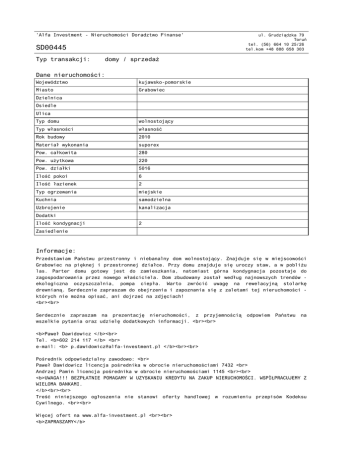 'Alfa Investment - Nieruchomości Doradztwo Finanse' SD00445 Typ transakcji: ul. Grudziądzka 79 Toruń tel. (56) 664 10 25/26 tel.kom +48 888 658 303 domy / sprzedaż Dane nieruchomości: Województwo kujawsko-pomorskie Miasto Grabowiec Dzielnica Osiedle Ulica Typ domu wolnostojący Typ własności własność Rok budowy 2010 Materiał wykonania suporex Pow. całkowita 280 Pow. użytkowa 220 Pow. działki 5016 Ilość pokoi 6 Ilość łazienek 2 Typ ogrzewania miejskie Kuchnia samodzielna Uzbrojenie kanalizacja Dodatki Ilość kondygnacji 2 Zasiedlenie Informacje: Przedstawiam Państwu przestronny i niebanalny dom wolnostojący. Znajduje się w miejscowości Grabowiec na pięknej i przestronnej działce. Przy domu znajduje się uroczy staw, a w pobliżu las. Parter domu gotowy jest do zamieszkania, natomiast górna kondygnacja pozostaje do zagospodarowania przez nowego właściciela. Dom zbudowany został według najnowszych trendów ekologiczna oczyszczalnia, pompa ciepła. Warto zwrócić uwagę na rewelacyjną stolarkę drewnianą. Serdecznie zapraszam do obejrzenia i zapoznania się z zaletami tej nieruchomości których nie można opisać, ani dojrzeć na zdjęciach! <br><br> Serdecznie zapraszam na prezentację nieruchomości, z przyjemnością wszelkie pytania oraz udzielę dodatkowych informacji. <br><br> odpowiem Państwu na <b>Paweł Dawidowicz </b><br> Tel. <b>602 214 117 </b> <br> e-mail: <b> [email protected] </b><br><br> Pośrednik odpowiedzialny zawodowo: <br> Paweł Dawidowicz licencja pośrednika w obrocie nieruchomościami 7432 <br> Andrzej Pamin licencja pośrednika w obrocie nieruchomościami 1145 <br><br> <b>UWAGA!!! BEZPŁATNIE POMAGAMY W UZYSKANIU KREDYTU NA ZAKUP NIERUCHOMOŚCI. WSPÓŁPRACUJEMY Z WIELOMA BANKAMI. </b><br><br> Treść niniejszego ogłoszenia nie stanowi oferty handlowej w rozumieniu przepisów Kodeksu Cywilnego. <br><br> Więcej ofert na www.alfa-investment.pl <br><br> <b>ZAPRASZAMY</b> Cena: 550 000 PLN Dokument wygenerowany ze strony www.alfa-investment.pl Strona 2
