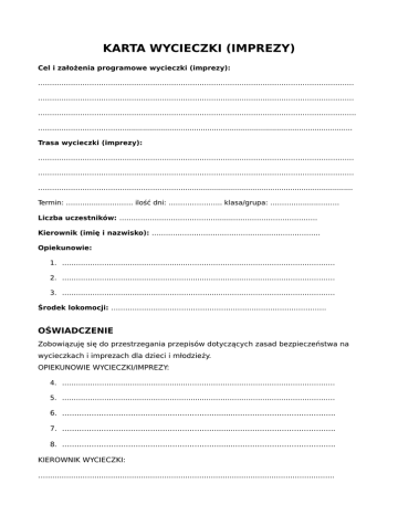 KARTA WYCIECZKI (IMPREZY) Cel i założenia programowe wycieczki (imprezy): ……………………………………………………………………………………………………………………… ……………………………………………………………………………………………………………………… ………………………………………………………………………………………………………………………. ………………………………….................................................................................................... Trasa wycieczki (imprezy): ……………………………………………………………………………………………………………………… ……………………………………………………………………………………………………………………… ………………………………………………………........................................................................... Termin: ………......………….. ilość dni: ………………….. klasa/grupa: ………….........……… Liczba uczestników: …………………………………….......……………………………… Kierownik (imię i nazwisko): ……………………………………………………………… Opiekunowie: 1. ………………………………………........………………………………………………………. 2. ………………………………………………........………………………………………………. 3. ………………………………………………………........………………………………………. Środek lokomocji: ……………………………………………………………………………….. OŚWIADCZENIE Zobowiązuję się do przestrzegania przepisów dotyczących zasad bezpieczeństwa na wycieczkach i imprezach dla dzieci i młodzieży. OPIEKUNOWIE WYCIECZKI/IMPREZY: 4. ………………………………………........………………………………………………………. 5. ………………………………………………........………………………………………………. 6. ………………………………………………………........………………………………….. 7. ………………………………………………………........………………………………….. 8. ………………………………………………………........………………………………….. KIEROWNIK WYCIECZKI: …............................................................................................................................ HARMONOGRAM WYCIECZKI (IMPREZY) MIEJSCOWOŚĆ ………………………………………………….. KM ……………………. TERMIN ………………………………………………. GRUPA …………………………… Godzina Program Zatwierdzam (pieczęć i podpis dyrektora)