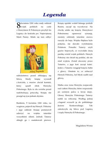 Legenda 8 kwietnia 1241 roku mały oddział Książę opolski wokół którego jeździli wojsk czele Rusini, zaczął się wycofywać. Na z Henrykiem II Pobożnym przybył do chwilę udało się księciu Henrykowi Legnicy do kościoła pw. Najświętszej Pobożnemu Marii Panny. Miało się tam odbyć niestety oddziały tatarskie znowu polskich na opanować sytuację, ruszyły do boju. Wojsko Bajdara było potężne, Polakom. nie dawało Ponadto wytchnienia Tatarzy użyli gazów bojowych, co wywołało dużą panikę wśród wojsk polskich. Henryk Pobożny nie chciał się poddać, ale nie miał wyjścia. Został otoczony przez Tatarów, a jego koń zaczął kuleć. Jeden z Tatarów ściągnął księciu hełm z głowy. Ostatnie to, co zobaczył nabożeństwo bitwą. przed Kiedy zbliżającą książę się wyszedł Henryk Pobożny, był błysk szabli nad głową. z kościoła, z murów zleciał kamień, Henryka Matka oraz żona Henryka rozpaczały Pobożnego. Była to zła wróżba przed nad ciałem Henryka, które rozpoznały nadchodzącą potyczką. Książę nie po szóstym palcu u lewej stopy. przejął się tym jednak zbytnio. Głowę Henryka Pobożnego Tatarzy który upadł obok nabili na włócznię. Według jednej Rankiem, 9 kwietnia 1241 roku, na z legend wrzucili ją do pobliskiego wzgórzu, pojawił się Henryk Pobożny Jeziora i jego oddział. Książę postanowił zakończyła się bitwa pod Legnicą uderzyć i rządy Henryka II Pobożnego. na wojska tatarskie Koskowickiego. Tak wszystkimi siłami. Jednak Tatarzy ubiegli go i zaatakowali pierwsi. Magdalena Wrona