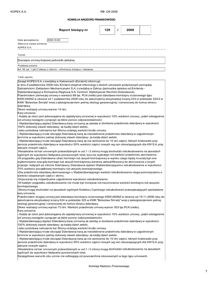 KOPEX S.A. RB 129 2008 KOMISJA NADZORU FINANSOWEGO Raport bieżący nr Data sporządzenia: 129 / 2008 2008-10-09 Skróc ona nazwa emitenta KOPEX S.A. Temat Znaczące umowy krajowe jednostki zależnej Podstawa prawna Art. 56 ust. 1 pkt 2 Ustawy o oferc ie - informac je bieżąc e i okresowe Treść raportu: Zarząd KOPEX S.A. z siedzibą w Katowicach (Emitent) informuje: w dniu 9 października 2008 roku Emitent otrzymał informację o dwóch umowach podpisanych pomiędzy Zabrzańskimi Zakładami Mechanicznymi S.A. z siedzibą w Zabrzu (jednostka zależna od Emitenta Wydzierżawiający) a Kompanią Węglową S.A. Centrum Wydobywcze Wschód (Dzierżawca). Przedmiotem pierwszej umowy o wartości 88 tys. PLN (netto) jest dzierżawa kombajnu ścianowego typu KSW-460NZ w okresie od 1 października 2008 roku do zakończenia eksploatacji ściany 433 w pokładzie 324/3 w KWK "Bolesław Śmiały" wraz z zabezpieczeniem pełnej obsługi gwarancyjnej i serwisowej do końca okresu dzierżawy. Okres realizacji umowy wynosi 15 dni. Kary umowne: - Każda ze stron jest zobowiązana do zapłaty kary umownej w wysokości 10% wartości umowy , jeżeli odstąpienie od umowy nastąpiło z przyczyn za które ponosi odpowiedzialność; - Wydzierżawiający zapłaci Dzierżawcy karę umowną za zwłokę w dostawie przedmiotu dzierżawy w wysokości 100% dobowej stawki dzierżawy za każdy dzień zwłoki, -Jako podstawę naliczania kar Strony ustalają wartość brutto umowy - Wydzierżawiający może obciążyć Dzierżawcę karą za nieodebranie przedmiotu dzierżawy w uzgodnionym terminie w wysokości pełnej dobowej stawki dzierżawy za każdy dzień zwłoki, - Wydzierżawiający może obciążyć Dzierżawcę karą za nie zwrócenie do 10 dni części, których brakowało przy zwrocie przedmiotu dzierżawy w wysokości 50% wartości części nowych wg cen obowiązujących dla KW S.A. przy zakupie nowych części. -Niezależnie od kar umownych przewidzianych w ust.1 i 2 strony mogą dochodzić odszkodowania na zasadach ogólnych do wysokości faktycznie poniesionych strat, lecz nie wyższego niż wartość przedmiotu zamówienia. -W przypadku gdy Dzierżawca utraci kombajn lub zespół kombajnowy w wyniku czego będą musiały być one wyzłomowane oraz gdy kombajn lub zespół kombajnowy zostanie zakwalifikowany do złomowania z innych przyczyn, leżących po stronie Dzierżawcy, Dzierżawca zapłaci Wydzierżawiającemu odszkodowanie w wysokości 75% wartości początkowej kombajnu lub zespołu kombajnowego. -Dla przedmiotu dzierżawy złomowanego u Wydzierżawiającego wartość odszkodowania ulega pomniejszeniu o wartość odzyskanych części i złomu. -Dopuszcza się indywidualne uzgodnienia wysokości odszkodowania. -W każdym przypadku odszkodowanie nie może być mniejsze niż nieumorzona wartość kombajnu lub zespołu kombajnowego. -Strony mogą dochodzić na zasadach ogólnych Kodeksu Cywilnego odszkodowań przewyższających zastrzeżone kary umowne. Przedmiotem drugiej umowy jest dzierżawa kombajnu ścianowego KSW-460NZ w okresie od 19.11.2008 roku do zakończenia eksploatacji ściany 524 w pokładzie 325 w KWK "Bolesław Śmiały" wraz z zabezpieczeniem pełnej obsługi gwarancyjnej i serwisowej do końca okresu dzierżawy. Okres realizacji umowy wynosi 73 dni. Wartość przedmiotu umowy wynosi 303 tys.PLN (netto). Kary umowne: - Każda ze stron jest zobowiązana do zapłaty kary umownej w wysokości 10% wartości umowy , jeżeli odstąpienie od umowy nastąpiło z przyczyn za które ponosi odpowiedzialność; - Wydzierżawiający zapłaci Dzierżawcy karę umowną za zwłokę w dostawie przedmiotu dzierżawy w wysokości 100% dobowej stawki dzierżawy za każdy dzień zwłoki, -Jako podstawę naliczania kar Strony ustalają wartość brutto umowy - Wydzierżawiający może obciążyć Dzierżawcę karą za nieodebranie przedmiotu dzierżawy w uzgodnionym terminie w wysokości pełnej dobowej stawki dzierżawy za każdy dzień zwłoki, - Wydzierżawiający może obciążyć Dzierżawcę karą za nie zwrócenie do 10 dni części, których brakowało przy zwrocie przedmiotu dzierżawy w wysokości 50% wartości części nowych wg cen obowiązujących dla KW S.A. przy zakupie nowych części. -Niezależnie od kar umownych przewidzianych w ust.1 i 2 strony mogą dochodzić odszkodowania na zasadach ogólnych do wysokości faktycznie poniesionych strat. Szczegółowe warunki obu umów nie odbiegają od powszechnie stosowanych w tego typu umowach. Komisja Nadzoru Finansowego 1 KOPEX S.A. RB 129 2008 W okresie ostatnich 12 miesięcy jednostki zależne Emitenta podpisały umowy z tym kontrahentem i jego jednostkami zależnymi o łącznej wartości 129.033 tys. PLN (wraz z aktualnymi). O ostatniej umowie z tym kontrahentem Emitent informował w raporcie bieżącym RB 126/2008 w dniu 03.10.2008 roku. Umową o największej wartości, spośród zawartych w okresie ostatnich 12 miesięcy, jest umowa z dnia 13.03.2008 roku pomiędzy konsorcjum firm PBSz Zakład Usług Górniczych Sp. z o.o. z siedzibą w Bytomiu (jednostka pośrednio zależna od Emitenta) (Lider) i VACAT Sp. z o.o. z siedzibą w Rybniku (Konsorcjant), której wartość wynosi 19.893 tys. PLN netto. Jako kryterium znaczącej umowy przyjęto wartość kapitałów własnych Emitenta na koniec II kwartału 2008 roku wynoszących 1.206.061 tys. PLN. KOPEX Spółka Akc yjna (pełna nazwa emitenta) KOPEX S.A. Elektromaszynowy (ele) (skróc ona nazwa emitenta) 40-172 (sektor wg. klasyfikac ji GPW w W-wie) Katowic e (kod poc ztowy) (miejsc owość ) ul. Grabowa 1 (ulic a) (numer) (032) 6047000 (032) 6047100 (telefon) (fax) [email protected] om.pl kopex.c om.pl (e-mail) (www) 634-012-68-49 271981166 (NIP) (REGON) PODPISY OSÓB REPREZENTUJĄCYCH SPÓŁKĘ Data Imię i Nazwisko Stanowisko/Funkc ja 2008-10-09 Joanna Parzyc h Wic eprezes Zarządu 2008-10-09 Joanna Węgrzyn Prokurent Podpis Komisja Nadzoru Finansowego 2
