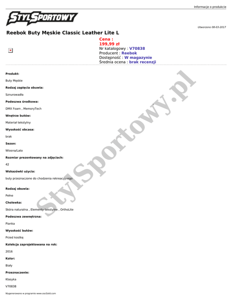 Informacje o produkcie Utworzono 08-03-2017 Reebok Buty Męskie Classic Leather Lite L Cena : 199,99 zł Nr katalogowy : V70838 Producent : Reebok Dostępność : W magazynie Średnia ocena : brak recenzji Produkt: pl Buty Męskie Rodzaj zapięcia obuwia: y. Sznurowadła Podeszwa środkowa: Wnętrze butów: Materiał tekstylny Wysokość obcasa: brak Sezon: Wiosna/Lato 42 Wskazówki użycia: lS p Rozmiar prezentowany na zdjęciach: buty przeznaczone do chodzenia rekreacyjnego Pełne Cholewka: St y Rodzaj obuwia: or to w DMX Foam , MemoryTech Skóra naturalna , Elementy tekstylne , OrthoLite Podeszwa zewnętrzna: Pianka Wysokość butów: Przed kostkę Kolekcja zaprojektowana na rok: 2016 Kolor: Biały Przeznaczenie: Klasyka V70838 Wygenerowano w programie www.oscGold.com Dostępne opcje Reebok Buty Męskie Classic Leather Lite L St y lS p or to w y. pl Rozmiar: 40.5, 45.5, 45, 44.5, 44, 43, 42.5, 42, 41, 47.
