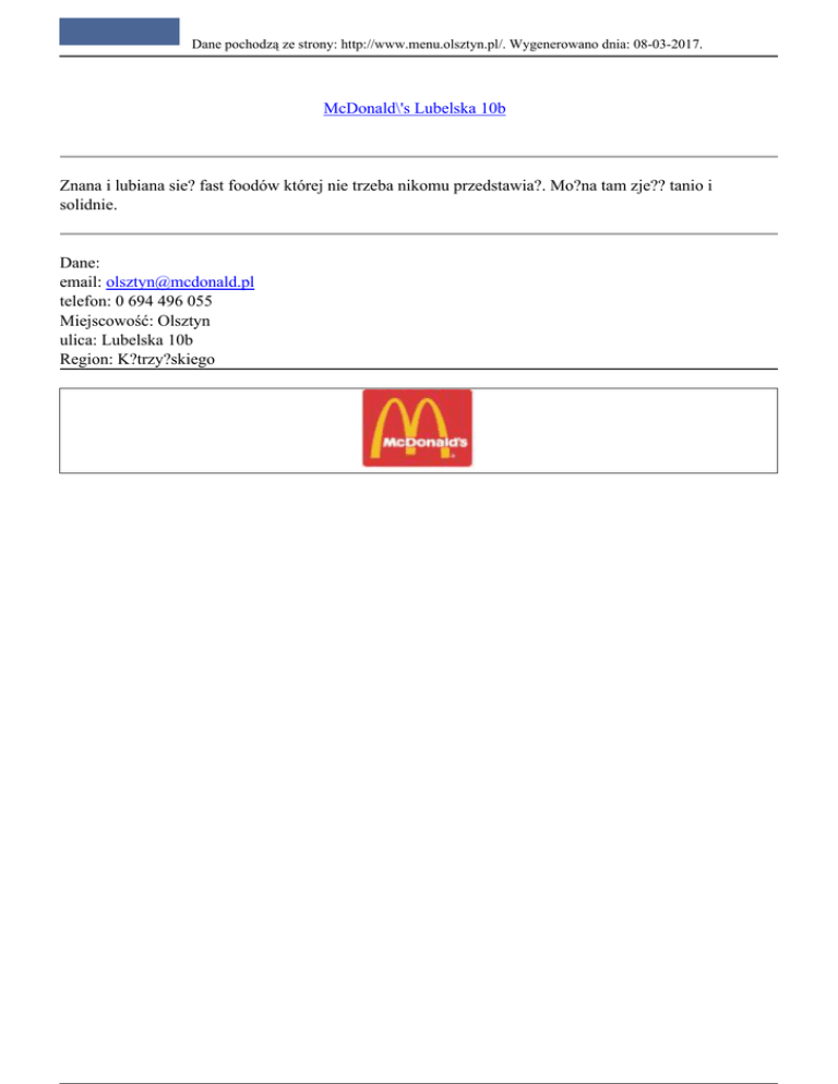 Dane pochodzą ze strony: http://www.menu.olsztyn.pl/. Wygenerowano dnia: 08-03-2017. McDonald\'s Lubelska 10b Znana i lubiana sie? fast foodów której nie trzeba nikomu przedstawia?. Mo?na tam zje?? tanio i solidnie. Dane: email: [email protected] telefon: 0 694 496 055 Miejscowość: Olsztyn ulica: Lubelska 10b Region: K?trzy?skiego