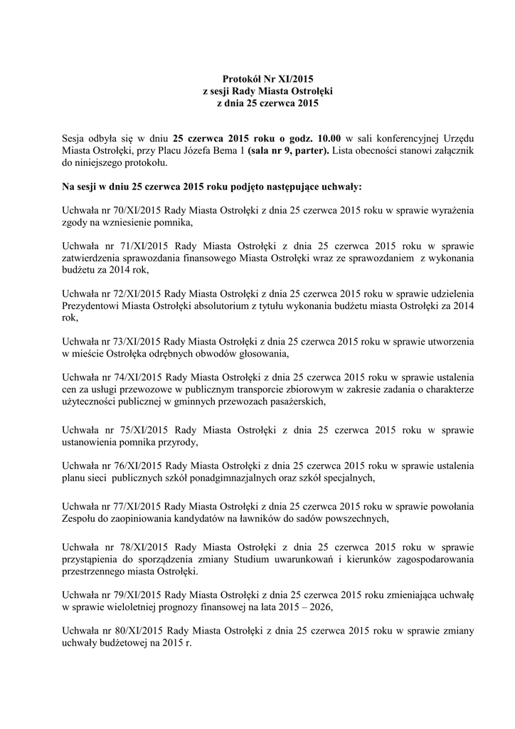 Protokół Nr XI/2015 z sesji Rady Miasta Ostrołęki z dnia 25 czerwca 2015 Sesja odbyła się w dniu 25 czerwca 2015 roku o godz. 10.00 w sali konferencyjnej Urzędu Miasta Ostrołęki, przy Placu Józefa Bema 1 (sala nr 9, parter). Lista obecności stanowi załącznik do niniejszego protokołu. Na sesji w dniu 25 czerwca 2015 roku podjęto następujące uchwały: Uchwała nr 70/XI/2015 Rady Miasta Ostrołęki z dnia 25 czerwca 2015 roku w sprawie wyrażenia zgody na wzniesienie pomnika, Uchwała nr 71/XI/2015 Rady Miasta Ostrołęki z dnia 25 czerwca 2015 roku w sprawie zatwierdzenia sprawozdania finansowego Miasta Ostrołęki wraz ze sprawozdaniem z wykonania budżetu za 2014 rok, Uchwała nr 72/XI/2015 Rady Miasta Ostrołęki z dnia 25 czerwca 2015 roku w sprawie udzielenia Prezydentowi Miasta Ostrołęki absolutorium z tytułu wykonania budżetu miasta Ostrołęki za 2014 rok, Uchwała nr 73/XI/2015 Rady Miasta Ostrołęki z dnia 25 czerwca 2015 roku w sprawie utworzenia w mieście Ostrołęka odrębnych obwodów głosowania, Uchwała nr 74/XI/2015 Rady Miasta Ostrołęki z dnia 25 czerwca 2015 roku w sprawie ustalenia cen za usługi przewozowe w publicznym transporcie zbiorowym w zakresie zadania o charakterze użyteczności publicznej w gminnych przewozach pasażerskich, Uchwała nr 75/XI/2015 Rady Miasta Ostrołęki z dnia 25 czerwca 2015 roku w sprawie ustanowienia pomnika przyrody, Uchwała nr 76/XI/2015 Rady Miasta Ostrołęki z dnia 25 czerwca 2015 roku w sprawie ustalenia planu sieci publicznych szkół ponadgimnazjalnych oraz szkół specjalnych, Uchwała nr 77/XI/2015 Rady Miasta Ostrołęki z dnia 25 czerwca 2015 roku w sprawie powołania Zespołu do zaopiniowania kandydatów na ławników do sadów powszechnych, Uchwała nr 78/XI/2015 Rady Miasta Ostrołęki z dnia 25 czerwca 2015 roku w sprawie przystąpienia do sporządzenia zmiany Studium uwarunkowań i kierunków zagospodarowania przestrzennego miasta Ostrołęki. Uchwała nr 79/XI/2015 Rady Miasta Ostrołęki z dnia 25 czerwca 2015 roku zmieniająca uchwałę w sprawie wieloletniej prognozy finansowej na lata 2015 – 2026, Uchwała nr 80/XI/2015 Rady Miasta Ostrołęki z dnia 25 czerwca 2015 roku w sprawie zmiany uchwały budżetowej na 2015 r. 1. Otwarcie sesji, stwierdzenie prawomocności obrad. Przewodniczący Rady Miasta Jerzy Grabowski - otworzył XI sesję Rady Miasta Ostrołęki. Przywitał radnych, Prezydenta Miasta Ostrołęki Janusza Kotowskiego, Wiceprezydentów i przybyłych gości: pana Aleksandra Zawalicha - przewodniczącego Rady Oddziału w Ostrołęce NSZZ Solidarność; pana Józefa Gutowskiego – posła na Sejm RP I kadencji; pana Tadeusza Godlewskiego – również posła na Sejm RP I kadencji, pierwszego przewodniczącego Rady Oddziału w Ostrołęce NSZZ Solidarność; pana Edwarda Sucheckiego – członka Rolniczej Solidarności, Pan Edward prowadził zebranie założycielskie Rolniczej Solidarności oraz młodzież z ostrołęckich szkół – laureatów IV Miejskiego Konkursu Historycznego „Walka o wolną Polskę”. Poprosił wszystkich o powstanie i uczczenie minutą ciszy a potem krótką modlitwą pamięć zmarłego 16 czerwca 2015 roku członka Rady Osiedla Sienkiewicza śp. Mirosława Skrzecza, Prosił o zabranie głosu pana Ryszarda Żukowskiego przewodniczącego Komisji Kultury, Dziedzictwa Narodowego i Promocji, organizatora IV Miejskiego Konkursu Historycznego „Walka o wolną Polskę”. Radny Ryszard Żukowski – powiedział „… Miejski Konkurs Historyczny „Walka o wolną Polskę” pod patronatem prezydenta miasta Janusza Kotowskiego to już IV edycja. W tym roku uczniowie mieli za zadanie opanować zagadnienia z okresu bitwy z bolszewikami w 1920 roku oraz czasy PRLu lata 70 i 80. Udział wzięli uczniowie ze szkół podstawowych, gimnazjalnych i ponadgimnazjalnych. Ze szkół podstawowych to SP1, SP3, SP4, SP5, SP6. Z gimnazjum to Gimnazjum nr 2, 4, 5 i Gimnazjum Klasyczne. Ze szkół ponadgimnazjalnych I Liceum, II Liceum, II Społeczne Liceum, Liceum Klasyczne, ZSZ 1. ZSZ 2 i ZSZ 4. Najwyższy poziom reprezentowali uczniowie ze szkół podstawowych i szkół ponadgimnazjalnych”. Nagrody uczniom wręczyli prezydent miasta Janusz Kotowski oraz przewodniczący rady Jerzy Grabowski. Nagrodzeni Szkoły Podstawowe: I miejsce uczeń klasy V Szkoły Podstawowej nr 3 im. Adama Mickiewicza Kamil Łuba. II miejsce uczeń klasy V Szkoły Podstawowej nr 1 im. Stanisława Jachowicza Jan Gadzała. III miejsce uczeń klasy VI Szkoły Podstawowej nr 1 im. Stanisława Jachowicza Dominik Opęchowski.. Wyróżnienie przypadło Katarzynie Szewczyk uczennicy Szkoły Podstawowej nr 4. Nagrodzeni Gimnazja: II miejsce uczeń klasy II Gimnazjum nr 2. Kacper Prusaczyk. III miejsce uczeń klasy III Gimnazjum Klasycznego Paweł Gadomski. Nagrodzeni szkoły ponadgimnazjalne: I miejsce uczeń klasy II I LO Krzysztof Szabłowski II miejsce uczeń klasy I Liceum Klasycznego Krzysztof Szabłowski. III miejsce uczeń klasy II I LO Dominik Szpakowski. Wyróżnienie przypadło Natalii Lenda uczennica klasy II II Liceum Ogólnokształcącego. 2. Wybór sekretarza. Przewodniczący Rady Miasta Jerzy Grabowski - zaproponował na sekretarza obrad zgodnie z listą alfabetyczną radną Irenę Nosek. Radny wyraził zgodę. Głosowanie Za – 18 Przeciw – 0 Wstrzymało się - 0 Sekretarzem obrad została wybrana radna Irena Nosek. 3. Przedstawienie porządku obrad oraz jego zmiany. Przewodniczący Rady Miasta Jerzy Grabowski – powiedział „Przypominam, że na 7 dni przed sesją wpłynął od Prezydenta Miasta projekt uchwały w sprawie wyrażenia zgody na wzniesienie pomnika. Z uwagi na obecność gości zaproszonych proponuję wprowadzenie tego punktu, jako pkt. 4a. Wspomniany projekt uchwały otrzymaliście Państwo do skrzynek podawczych. Ponadto na wniosek prezydenta miasta zgłaszam wniosek o wprowadzenie do porządku obrad projektu uchwały w sprawie utworzenia w mieście Ostrołęka odrębnych