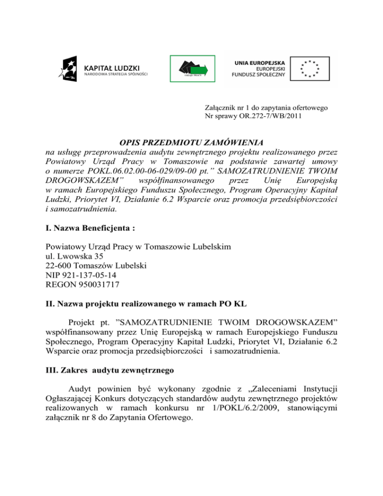 Załącznik nr 1 do zapytania ofertowego Nr sprawy OR.272-7/WB/2011 OPIS PRZEDMIOTU ZAMÓWIENIA na usługę przeprowadzenia audytu zewnętrznego projektu realizowanego przez Powiatowy Urząd Pracy w Tomaszowie na podstawie zawartej umowy o numerze POKL.06.02.00-06-029/09-00 pt.” SAMOZATRUDNIENIE TWOIM DROGOWSKAZEM” współfinansowanego przez Unię Europejską w ramach Europejskiego Funduszu Społecznego, Program Operacyjny Kapitał Ludzki, Priorytet VI, Działanie 6.2 Wsparcie oraz promocja przedsiębiorczości i samozatrudnienia. I. Nazwa Beneficjenta : Powiatowy Urząd Pracy w Tomaszowie Lubelskim ul. Lwowska 35 22-600 Tomaszów Lubelski NIP 921-137-05-14 REGON 950031717 II. Nazwa projektu realizowanego w ramach PO KL Projekt pt. ”SAMOZATRUDNIENIE TWOIM DROGOWSKAZEM” współfinansowany przez Unię Europejską w ramach Europejskiego Funduszu Społecznego, Program Operacyjny Kapitał Ludzki, Priorytet VI, Działanie 6.2 Wsparcie oraz promocja przedsiębiorczości i samozatrudnienia. III. Zakres audytu zewnętrznego Audyt powinien być wykonany zgodnie z „Zaleceniami Instytucji Ogłaszającej Konkurs dotyczących standardów audytu zewnętrznego projektów realizowanych w ramach konkursu nr 1/POKL/6.2/2009, stanowiącymi załącznik nr 8 do Zapytania Ofertowego. Zakres ogólny audytu : Audytor sprawdza, czy działania, na które przedstawiono wydatki rzeczywiście zostały zrealizowane, czy wnioski o płatność są zgodne z wymaganiami zawartymi w umowie/wniosku o dofinansowanie, czy są poparte odpowiednimi dokumentami finansowymi. Zakres szczegółowy audytu : Audytor dokonuje oceny dokumentów finansowych i rzeczowych w odniesieniu do działań zrealizowanych przez Beneficjenta. Ocenie audytora podlega zgodność realizacji projektu z jego założeniami określonymi w umowie o dofinansowanie projektu, a w szczególności: 1. Weryfikacja kwalifikowalności poniesionych wydatków i sposobu ich dokumentowania, obejmuje m. in.: - weryfikację na podstawie reprezentatywnej próby (minimum 40%) oryginałów dokumentów księgowych dokumentujących wydatki poniesione w ramach projektu. Dobór próby powinien być oparty na metodach statystycznych. - zgodność prowadzenia rachunkowości z przepisami ustawy z dnia 29 września 1994 r. o rachunkowości (Dz. U. z 2002 r. nr 76, poz 694, z późn. zm.), w części dotyczącej audytowanego projektu, - sprawdzenie, czy prowadzona jest wyodrębniona ewidencja wydatków dla projektu zgodnie z zasadami określonymi dla programu operacyjnego w Systemie Realizacji Programu Operacyjnego Kapitał Ludzki 2007-2013, - sprawdzenie, czy w ramach projektu nie finansuje się zwykłej działalności jednostki realizującej projekt, a jedynie koszty związane z realizacją projektu w ramach PO KL, - sprawdzenie statusu podatkowego beneficjenta. 2. Dokumentacja dotycząca rekrutacji uczestników projektu (sprawdzenie kwalifikowalności przynajmniej 40% uczestników w ramach danego projektu poprzez odniesienie się do zapisów zawartych m.in. w Szczegółowym Opisie Priorytetów Programu Operacyjnego Kapitał Ludzki 2007-2013, Wytycznych w zakresie kwalifikowania wydatków w ramach PO KL, dokumentacji konkursowej w ramach której realizowany jest projekt). 3. Sposób pozyskiwania i przechowywania oraz przetwarzania danych o uczestnikach projektu (w ramach Podsystemu Monitorowania EFS) zgodnie z Ustawą z dnia 29 sierpnia 1997 r. o Ochronie Danych Osobowych. 4. Zgodność danych przekazywanych we wniosku/wnioskach o płatność w części dotyczącej postępu rzeczowego oraz postępu finansowego z dokumentacją, dotyczącą realizacji projektu. 5. Ocena poprawności udzielania zamówień publicznych (o ile dotyczy), obejmująca w szczególności sprawdzenie, czy beneficjent prawidłowo stosuje Ustawę Prawo Zamówień Publicznych, w tym: - czy spełnione zostały przesłanki zastosowania trybu udzielenia zamówienia (gdy zamawiający wybrał tryb inny niż przetarg nieograniczony i ograniczony), - czy ustalenie wartości zamówienia było prawidłowe, - czy beneficjent posiada kompletny protokół postępowania o udzielenie zamówienia publicznego, - czy SIWZ jest kompletny tj. zawiera wszystkie elementy zawarte w art. 36 ustawy, - czy ogłoszenia o postępowaniach prowadzonych przez zamawiających przekazywane są do publikacji zgodnie z przepisami Ustawy, - czy umowa podpisana z wykonawcą została przygotowana zgodnie z warunkami określonymi w SIWZ, - czy beneficjent udzielający zamówienia w ramach projektu dokonał wyboru wykonawcy z zachowaniem zasady uczciwej konkurencji i równego traktowania. W przypadku beneficjentów, którzy nie są zobligowani do stosowania Ustawy Prawo Zamówień Publicznych audyt powinien obejmować także prawidłowość zakupu dostaw i usług pod kątem racjonalności wydatków oraz stosowanie zasady konkurencyjności opisanej w umowie o dofinansowanie projektu (o ile dotyczy). 6. Ocena prawidłowości stosowania zasad pomocy publicznej (o ile dotyczy), zawartych w przepisach krajowych i wspólnotowych dotyczących pomocy publicznej oraz weryfikacja warunków wykluczających wystąpienie pomocy publicznej podczas realizacji projektu (dotyczy wniosków o dofinansowanie nie uwzględniających pomocy publicznej). 7. Sposób realizacji działań promocyjnych. 8. Sposób prowadzenia i archiwizacji dokumentacji projektu. 9. Zgodność z właściwymi politykami i zasadami wspólnotowymi, w szczególności z: polityką równych szans (w tym m. in. równość płci) i koncepcją zrównoważonego rozwoju. 10. Sprawdzenie, czy beneficjent wdrożył zalecenia po przeprowadzonych kontrolach oraz usunął uchybienia, jeśli takie zostały wykryte. Dokumenty z przeprowadzonego audytu powinny zostać oznaczone obowiązującymi logotypami Programu Operacyjnego Kapitał Ludzki i Unii Europejskiej wraz z towarzyszącą im informacją o współfinansowaniu, zgodnie ze wzorem zamieszonym w Wytycznych dotyczących oznaczania projektów w ram