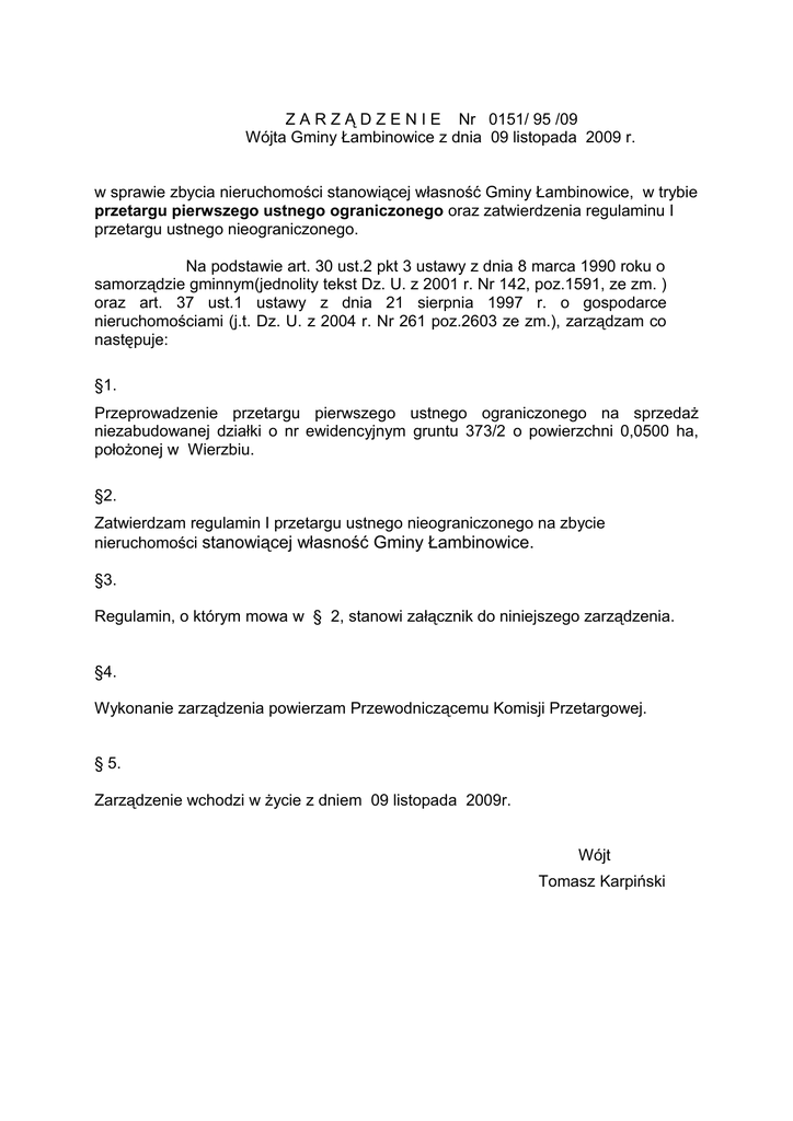 Z A R Z Ą D Z E N I E Nr 0151/ 95 /09 Wójta Gminy Łambinowice z dnia 09 listopada 2009 r. w sprawie zbycia nieruchomości stanowiącej własność Gminy Łambinowice, w trybie przetargu pierwszego ustnego ograniczonego oraz zatwierdzenia regulaminu I przetargu ustnego nieograniczonego. Na podstawie art. 30 ust.2 pkt 3 ustawy z dnia 8 marca 1990 roku o samorządzie gminnym(jednolity tekst Dz. U. z 2001 r. Nr 142, poz.1591, ze zm. ) oraz art. 37 ust.1 ustawy z dnia 21 sierpnia 1997 r. o gospodarce nieruchomościami (j.t. Dz. U. z 2004 r. Nr 261 poz.2603 ze zm.), zarządzam co następuje: §1. Przeprowadzenie przetargu pierwszego ustnego ograniczonego na sprzedaż niezabudowanej działki o nr ewidencyjnym gruntu 373/2 o powierzchni 0,0500 ha, położonej w Wierzbiu. §2. Zatwierdzam regulamin I przetargu ustnego nieograniczonego na zbycie nieruchomości stanowiącej własność Gminy Łambinowice. §3. Regulamin, o którym mowa w § 2, stanowi załącznik do niniejszego zarządzenia. §4. Wykonanie zarządzenia powierzam Przewodniczącemu Komisji Przetargowej. § 5. Zarządzenie wchodzi w życie z dniem 09 listopada 2009r. Wójt Tomasz Karpiński Załącznik do Zarządzenia Wójta Gminy z dn. 09 listopada 2009 r. Nr 0151/ 95 /09 REGULAMIN PRZETARGU Pierwszego ustnego ograniczonego, organizowanego w dniu 10 grudnia 2009 r., na sprzedaż niezabudowanej działki o nr ewidencyjnym gruntu 373/2 o powierzchni 0,0500 ha, położonej w Wierzbiu. I. Przedmiot przetargu: 1. Niezabudowana działka gruntu o nr 373/2 o powierzchni 0,0500 ha, km. 2, położona w środkowej części wsi, w otoczeniu nieruchomości zabudowanych budynkami mieszkalnymi i gospodarczymi. Działka nie ma dostępu do drogi publicznej. Ma kształt zbliżony do prostokąta, jej granice wyznaczają od północnego zachodu niezabudowane działki gruntu, a od pozostałych stron nieruchomości zabudowane budynkami mieszkalnymi jednorodzinnymi i zabudowaniami gospodarczymi. Działka ma nawierzchnię trawiastą ( kl Ł-III) i jest wykorzystywana jako ogród przydomowy. Teren na którym położona jest nieruchomość , wyposażony jest w sieć elektryczną i wodociągową . Dla miejsca położenia działki brak jest miejscowego planu zagospodarowania przestrzennego. W studium uwarunkowań i kierunków zagospodarowania przestrzennego Gminy Łambinowice położona na terenach zurbanizowanych niezabudowanych z przeznaczeniem pod budownictwo mieszkaniowe jednorodzinne. Nieruchomość jest składnikiem mienia Gminy Łambinowice, dla której w Sądzie Rejonowym w Nysie prowadzona jest KW nr 41142. Nieruchomość wolna od obciążeń. Cena wywoławcza za nieruchomość wynosi - 3.600,00- zł, wysokość wadium 360,00 - zł. Do ceny osiągniętej w przetargu zostanie doliczony 22% podatek VAT. 2. Uzasadnienie formy wyboru przetargu ograniczonego: działka gruntu nie posiada dostępu do drogi publicznej, położona jest w otoczeniu działek o nr nr ewidencyjnych gruntu : 374, 373/3, 376 , które mają zapewniony dostęp komunikacyjny do dróg. II. Miejsce, termin i warunki przetargu 1. Przetarg na w/w nieruchomość odbędzie się w Urzędzie Gminy w Łambinowicach, przy ul. Gen. Zawadzkiego 29, w sali narad –I piętro pok. nr 16 w dniu 10 grudnia 2009 r., o godz. 9,00. 2. Prawo do udziału w przetargu mają osoby fizyczne lub prawne, które : a) są właścicielami działek gruntu położonych w Wierzbiu o nr nr ewidencyjnych: 374, 373/3, 376 i w terminie do dnia 01 grudnia 2009 r. i zgłoszą na piśmie uczestnictwo w przetargu. Lista osób zakwalifikowanych do uczestnictwa w przetargu zostanie wywieszona na tablicy ogłoszeń w siedzibie Urzędu Gminy w Łambinowicach dniu 04 grudnia 2009 r. b) w terminie do dnia 06 grudnia 2009 r. wpłaciły wadium w gotówce lub obligacjach Skarbu Państwa w kasie Urzędu Gminy w Łambinowicach ul. Gen. Zawadzkiego 29 / do godz. 14-tej/ lub na konto gminy w BS Prudnik Filia Łambinowice nr 89890510109001001254130001. Przedstawiciele uczestników przetargu winni być wyposażeni w pełnomocnictwa. 3. Wadium wniesione w pieniądzu przez uczestnika przetargu, który przetarg wygrał, zalicza się na poczet ceny nabycia nieruchomości. Wadium wniesione w obligacjach przez uczestnika przetargu, który przetarg wygrał, podlega zwrotowi niezwłocznie po wpłaceniu kwoty równej cenie nabycia nieruchomości. Pozostałym uczestnikom przetargu wadium zostaje zwrócone bezpośrednio po odwołaniu lub zamknięciu przetargu, jednak nie później niż przed upływem trzech dni od dnia odwołania lub zamknięcia przetargu. - 2 4. Uczestnicy przetargu składają pisemne oświadczenia, iż zapoznali się z przedmiotem sprzedaży , nie wnoszą żadnych zastrzeżeń i kupują nieruchomość w stanie istniejącym 5. Dowód wpłaty wadium podlega przedłożeniu komisji przetargowej przed otwarciem przetargu. 6.Wadium przepada na rzecz sprzedawcy w razie uchylania się nabywcy od zawarcia umowy przenoszącej własność nieruchomości. 7.Ustalony w przetargu nabywca zobowiązany jest do dokonania wpłaty ceny nabycia nie później niż na dzień przed zawarciem umowy notarialnej przenoszącej własność oraz pokrycia wszelkich opłat związanych ze sporządzeniem umowy przenoszącej własność. III Przeprowadzenie przetargu. 1.przetarg jest przeprowadzany przez komisję przetargową w składzie: a) Jerzy Rosiński Przewodniczący b) Krystyna Krzyżanowska członek c) Wojciech Maślej członek d) Grażyna Wojtyczko członek 2. Prowadzący otwiera przetarg, przekazując uczestnikom informację o przedmiocie i warunkach przetargu, oraz podaje do wiadomości imiona i nazwiska lub nazwy bądź firmy osób, które wpłaciły wadium i zostały dopuszczone do przetargu. 3. Prowadzący przetarg informuje uczestników, że po trzecim wywołaniu najwyższej zaoferowanej ceny dalsze postąpienia nie zostaną przyjęte. 4. Uczestnicy decydują o wysokości postąpienia, które nie mogą być niższe niż 1% ceny wywoławczej 5.Uczestn