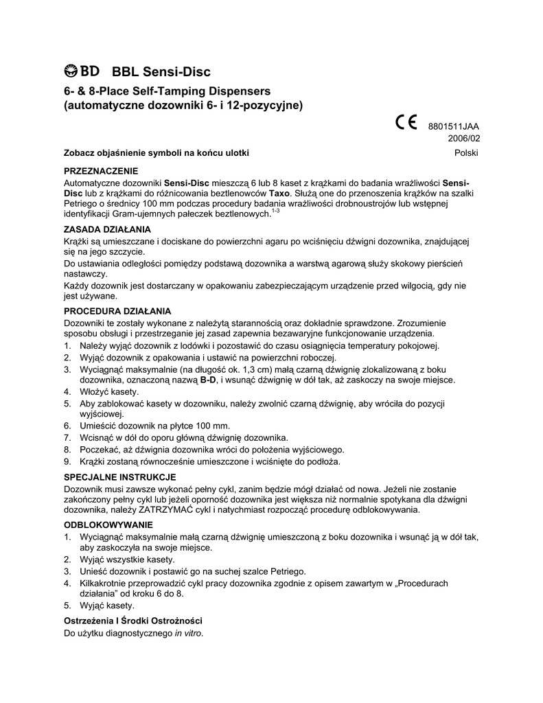 ! BBL Sensi-Disc 6- & 8-Place Self-Tamping Dispensers (automatyczne dozowniki 6- i 12-pozycyjne) " Zobacz objaśnienie symboli na końcu ulotki 8801511JAA 2006/02 Polski PRZEZNACZENIE Automatyczne dozowniki Sensi-Disc mieszczą 6 lub 8 kaset z krążkami do badania wrażliwości SensiDisc lub z krążkami do różnicowania beztlenowców Taxo. Służą one do przenoszenia krążków na szalki Petriego o średnicy 100 mm podczas procedury badania wrażliwości drobnoustrojów lub wstępnej identyfikacji Gram-ujemnych pałeczek beztlenowych.1-3 ZASADA DZIAŁANIA Krążki są umieszczane i dociskane do powierzchni agaru po wciśnięciu dźwigni dozownika, znajdującej się na jego szczycie. Do ustawiania odległości pomiędzy podstawą dozownika a warstwą agarową służy skokowy pierścień nastawczy. Każdy dozownik jest dostarczany w opakowaniu zabezpieczającym urządzenie przed wilgocią, gdy nie jest używane. PROCEDURA DZIAŁANIA Dozowniki te zostały wykonane z należytą starannością oraz dokładnie sprawdzone. Zrozumienie sposobu obsługi i przestrzeganie jej zasad zapewnia bezawaryjne funkcjonowanie urządzenia. 1. Należy wyjąć dozownik z lodówki i pozostawić do czasu osiągnięcia temperatury pokojowej. 2. Wyjąć dozownik z opakowania i ustawić na powierzchni roboczej. 3. Wyciągnąć maksymalnie (na długość ok. 1,3 cm) małą czarną dźwignię zlokalizowaną z boku dozownika, oznaczoną nazwą B-D, i wsunąć dźwignię w dół tak, aż zaskoczy na swoje miejsce. 4. Włożyć kasety. 5. Aby zablokować kasety w dozowniku, należy zwolnić czarną dźwignię, aby wróciła do pozycji wyjściowej. 6. Umieścić dozownik na płytce 100 mm. 7. Wcisnąć w dół do oporu główną dźwignię dozownika. 8. Poczekać, aż dźwignia dozownika wróci do położenia wyjściowego. 9. Krążki zostaną równocześnie umieszczone i wciśnięte do podłoża. SPECJALNE INSTRUKCJE Dozownik musi zawsze wykonać pełny cykl, zanim będzie mógł działać od nowa. Jeżeli nie zostanie zakończony pełny cykl lub jeżeli oporność dozownika jest większa niż normalnie spotykana dla dźwigni dozownika, należy ZATRZYMAĆ cykl i natychmiast rozpocząć procedurę odblokowywania. ODBLOKOWYWANIE 1. Wyciągnąć maksymalnie małą czarną dźwignię umieszczoną z boku dozownika i wsunąć ją w dół tak, aby zaskoczyła na swoje miejsce. 2. Wyjąć wszystkie kasety. 3. Unieść dozownik i postawić go na suchej szalce Petriego. 4. Kilkakrotnie przeprowadzić cykl pracy dozownika zgodnie z opisem zawartym w „Procedurach działania” od kroku 6 do 8. 5. Wyjąć kasety. Ostrzeżenia I Środki Ostrożności Do użytku diagnostycznego in vitro. Podczas wykonywania wszystkich procedur należy przestrzegać aseptycznej techniki pracy i obowiązujących środków ostrożności dotyczących zagrożenia mikrobiologicznego. KASETY Ostatni krążek w każdej kasecie jest oznaczony literą „X”. Za krążkiem z oznaczeniem „X” w każdej kasecie znajduje się plastikowa wkładka, która zabezpiecza przed używaniem dozownika z pustą kasetą. Po zauważeniu krążków oznaczonych literą „X” należy natychmiast wymienić wszystkie kasety. Przy wkładaniu kaset do dozownika należy się upewnić, że pierwszy krążek jest wyśrodkowany na końcu kasety. OCZYSZCZANIE I ODKAŻANIE Przy każdej wymianie kaset lub w razie zanieczyszczenia docisku wskutek zetknięcia z posianą powierzchnią agarową niezbędne jest oczyszczenie i odkażenie docisku/docisków zgodnie z następującymi zasadami: 1. Wyjąć wszystkie kasety z dozownika. 2. Wlać do pustej 100-milimetrowej szalki Petriego 20–25 mL 3% roztworu lizolu. 3. Wlać do pustej 100-milimetrowej szalki Petriego 20–25 mL 85% roztworu alkoholu izopropylowego. 4. Wlać w dwie puste 100-milimetrowe szalki Petriego 20–25 mL sterylnej, oczyszczonej wody. 5 Umieścić dozownik nad szalką z roztworem lizolu. 6. Opuścić dźwignię dozownika w celu zwolnienia docisków. Przytrzymać opuszczoną dźwignię przez 30 sekund. 7. Powtórzyć czynności 5 i 6 dla roztworu alkoholu izopropylowego. 8. Powtórzyć czynności 5 i 6 dla każdej szalki z oczyszczoną wodą. Pozwoli to na całkowite usunięcie środków czyszczących. W tym momencie dociski będą oczyszczone i odkażone. Wszelkie pozostałości alkoholu i wody na dociskach wyparują. Jeśli urządzenie ma być odstawione do magazynu lub jeśli badanie nie zostało zakończone, należy osuszyć dociski, zwalniając je kilkakrotnie (całkowicie wciskając dźwignię) po umieszczeniu urządzenia na wyjałowionym ręczniku, gaziku, waciku lub na innym jałowym chłonnym materiale. Można również wysuszyć dociski, pozostawiając je na wolnym powietrzu, lecz wymaga to więcej czasu w zależności od temperatury i wilgotności względnej otoczenia. ZASADY UŻYTKOWANIA I PRZECHOWYWANIA DOZOWNIKA I JEGO OPAKOWANIA 1. W razie potrzeby dozownik i opakowanie można umyć wodą, alkoholem izopropylowym lub 3% roztworem Lizolu. Nie używać alkalicznych środków czyszczących, rozpuszczalników organicznych ani środków do szorowania. Po umyciu zawsze dokładnie wysuszyć urządzenie na powietrzu przed włożeniem kaset. 2. Unikać używania bardzo ochłodzonego lub bardzo gorącego dozownika. Zawsze przed użyciem odczekać, aż osiągnie on temperaturę pokojową. Po zakończeniu pracy załadowany dozownik jak najszybciej włożyć z powrotem do lodówki. Nie przechowywać w zamrażarce. 3. Zaleca się umieszczenie pojemnika z środkiem chłonącym wilgoć, pakowanego wraz z każdym dozownikiem, w podstawie dozownika w celu utrzymania niskiej wilgotności. Środek chłonący wilgoć należy regenerować, gdy żel krzemionkowy, widoczny przez okienko kontrolne u góry zasobnika, zabarwia się na różowo. W celu regeneracji należy ogrzewać pojemnik w wentylowanym piecu w temperaturze 149°C przez około 3 h lub do przywrócenia ciemnoniebieskiego koloru środka chłonącego wilgoć. Po 