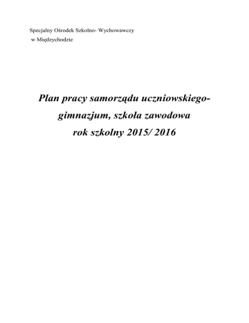 Specjalny Ośrodek Szkolno- Wychowawczy w Międzychodzie Plan pracy samorządu uczniowskiegogimnazjum, szkoła zawodowa rok szkolny 2015/ 2016 Cele pracy samorządu: - współorganizowanie uroczystości szkolnych oraz obchodów państwowych zawartych w terminarzu imprez szkolnych na dany rok szkolny - dbanie o dobre imię i honor szkoły, kultywowanie i wzbogacanie jej tradycji oraz tradycji miasta i regionu - kształtowanie patriotycznych postaw uczniów oraz pogłębianie zainteresowań z zakresu różnych dziedzin wiedzy i kultury - dbanie o dobrą współpracę między uczniami i nauczycielami oraz dyrekcją szkoły w ramach realizacji celów wychowawczych - kształtowanie umiejętności działania w zespole - organizowanie czasu wolnego od zajęć (np. dyskoteki, konkursy) - udział w akcjach charytatywnych - przestrzeganie terminowego, punktualnego i dokładnego wywiązywania się uczniów z obowiązków szkolnych (m.in. w zakresie frekwencji, spóźnień, terminowego wykonywania prac) Harmonogram działań: Zadania Wybory do samorządu uczniowskiego Zapoznanie uczniów z dokumentacją szkolną Stałe informowanie nauczycieli i uczniów o życiu szkoły oraz o pracy i akcjach SU Rocznica wybuchu II wojny światowej Biegi przełajowe i pieczenie ziemniaków Sprzątanie świata Formy realizacji - wybory przedstawicieli do samorządu klasowego przez poszczególne klasy - zebranie samorządu i wybór zarządu, czyli przewodniczącego, zastępcy oraz skarbnika - spotkanie z dyrektorem - omówienie dokumentów: Programu Profilaktyki, Programu Wychowawczego, Statutu Szkoły, kalendarza roku szkolnego - przedstawienie planu pracy SU na rok szkolny 2015/2016 - prowadzenie gabloty SU i dbanie o jej estetykę - wywieszanie aktualnych informacji o pracy samorządu oraz gazetka tematyczna - zamieszczanie na stronie internetowej Ośrodka zadań na poszczególne miesiące, aktualności oraz sprawozdań i fotografii z działalności SU - złożenie kwiatów przy pomniku - przygotowanie zawodów sportowych - pieczenie ziemniaków i kiełbasek - wymarsz uczniów gimnazjum do lasu Odpowiedzialni Opiekunowie SU Termin Wrzesień Wychowawcy klas Wrzesień Opiekunowie samorządu Cały rok szkolny Sekcja reprezentacyjna J. Frąckowiak, R. Heliasz, M. Pawłowski R. Dura, T. Molik Wrzesień Październik Wrzesień Grzybobranie Zagospodarowanie Dnia Chłopca Obchody Dnia Edukacji Narodowej - zbiórka śmieci - spotkanie integracyjne uczniów z upośledzeniem w stopniu umiarkowanym i znacznym klas gimnazjalnych i klasy przysposabiającej do pracy - przygotowanie plakatu z życzeniami dla wszystkich chłopców naszej szkoły - zorganizowanie szkolnej poczty przekazującej życzenia od dziewcząt dla chłopców - przygotowanie uroczystego apelu - przygotowanie dekoracji i laurek Olimpiada matematyczna „Matematyka na wesoło” Udział w akcji „Porządkowanie grobów” Święto Narodowe11 listopada - przygotowanie konkursu matematycznego dla uczniów Ośrodka oraz uczniów zaproszonych z innych szkół - porządkowanie grobów opuszczonych, zaniedbanych Światowy Dzień Rzucania Palenia Andrzejki - zorganizowanie spotkania o charakterze profilaktycznym - zorganizowanie dyskoteki - przygotowanie plakatu, biletów, wróżb i zabaw - aktualizacja gabloty - konkurs szkolny dotyczący wiedzy z zakresu biologii i matematyki - zorganizowanie konkursu szkolnego - zorganizowanie spotkania o charakterze edukacyjnym Quiz matematycznoprzyrodniczy Mistrz tabliczki mnożenia Światowy Dzień AIDS Boże Narodzenie w naszej szkole Tradycja kolędowania Tenis stołowy, unihokej - zorganizowanie szkolnego konkursu „Gimnazjada” - kiermasz rogali - aktualizacja gabloty - konkurs plastyczny- kartka bożonarodzeniowa - wspólne kolędowanie wszystkich klas w stołówce w trakcie wigilii szkolnej - rozwijanie rywalizacji sportowej J. Gieremek, D. Wiśniewska Wrzesień J. Gieremek Wrzesień M. Matuszak, J. Kunze, samorząd M. Duszyńska, A. Adamczak, S. Świątek Październik A. Adamczak, wychowawcy klas W. Filipiak, I. Sekuterska, J. Kunze, T. Molik, M. Matuszak, wychowawcy klas A. Adamczak, S. Świątek Opiekunowie SU Październik Listopad Listopad Listopad Listopad A. Krzyżańska M. Duszyńska M. Duszyńska Grudzień T. Molik, J. Kunze, M. Duszyńska Opiekunowie samorządu Grudzień M. Matuszak Grudzień R. Heliasz, J. Frąckowiak, Luty Grudzień Grudzień Konkurs wiedzy o - rozwijanie zainteresowań nt. krajach krajów niemieckojęzycznych niemieckojęzycznych - sprawdzenie wiedzy z j. niemieckiego uczniów gimnazjum i szkoły zawodowej Walentynki - przygotowanie poczty walentynkowej - dyskoteka Zagospodarowanie - apel okolicznościowy Dnia Kobiet Powitanie Wiosny - wiosenne podchody, palenie Marzanny - konkurs plastyczny „Wiosna” Corrida ortograficzna - konkurs ortograficzny Konkurs kulinarny - przygotowanie zdrowego posiłku Wielkanoc Dzień Ziemi - apel tematyczny - konkurs na kartkę wielkanocną - konkurs wiedzy ekologicznej Omnibus - międzyklasowy konkurs wiedzy Święto czekolady - przygotowanie i sprzedaż czekolady oraz produktów czekoladowych - spalanie kalorii- spacer, bieg lub rower - konkurs z łamigłówkami i zadaniami dot. logicznego myślenia Dzień logicznego myślenia Dzień otwartyFestyn Rodzinny - zorganizowanie wycieczki do miasta związanego z tematyką spotkania integracyjnego - wyjazd do teatru - uroczysty apel - spotkanie o charakterze profilaktyki antynikotynowej - zorganizowanie dnia zabaw i konkursów Pożegnanie klasy III - uroczysty apel Integracja przez zabawę Obchody Dnia Matki i Ojca Dzień bez papierosa M. Pawłowski S. Świątek, J. Tomala Luty opiekunowie SU Luty P. Jankowski, R. Heliasz, J. Frąckowiak, M. Pawłowski, R. Dura, M. Matuszak, T. Molik R. Dura, T. Molik, J. Kunze W. Filipiak, I. Sekuterska S. Świątek, J. Tomala J. Tomala, M. Matuszak M. Duszyńska, M. Kawka, A. Krzyżańska M. Duszyńska, R. Dura, T. Molik Opiekunowie samorządu Marzec A. Adamczak, M. Duszyńska, 