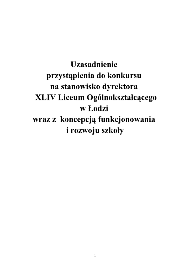 Uzasadnienie przystąpienia do konkursu na stanowisko dyrektora XLIV Liceum Ogólnokształcącego w Łodzi wraz z koncepcją funkcjonowania i rozwoju szkoły 1 I. UZASADNIENIE PRZYSTĄPIENIA DO KONKURSU NA STANOWISKO DYREKTORA Nazywam się Janusz Sapiński. Jestem nauczycielem historii z 25 letnim stażem pracy pedagogicznej, pracującym obecnie na stanowisku dyrektora w XLIV Liceum Ogólnokształcącym w Łodzi. Przez wszystkie lata swojej pracy w szkole zdobywałem wiedzę i umiejętności przydatne do skutecznej pracy z uczniami, z ich rodzicami oraz do właściwej współpracy z nauczycielami. Ukończyłem liczne formy doskonalenia zawodowego w zakresie dydaktyki i metodyki przedmiotu, rozwiązywania problemów wychowawczych, zapobiegania agresji, prawidłowej komunikacji interpersonalnej oraz organizacji i zarządzania oświatą. W czasie mojej 4-letniej pracy na stanowisku dyrektora szkoły zwiększyłem ilość klas terapeutycznych, dając możliwość właściwego kształcenia młodzieży z wszelkiego rodzaju dysfunkcjami utrudniającymi naukę w klasycznym systemie edukacji. Oprócz młodzieży ze wszystkich dzielnic miasta mamy również uczniów spoza niego. Nasza szkoła kojarzona jest z tym, co najlepsze w tego typu placówce – bezpieczeństwem, przyjazną i rodzinną atmosferą, rzetelnym, solidnym nauczaniem. XLIV LO określane do niedawna „liceum bezstresowym”, jest obecnie określane jako szkoła rodzinna, szkoła przyjazna uczniom. My nie walczyliśmy ze stereotypami, ale oswajaliśmy je, wydobywając z nich to, co najbardziej wartościowe, godne pielęgnowania i rozpowszechnienia. Od początku mojej pracy na stanowisku dyrektora szkoły starałem się je jak najlepiej poznać i jak najwięcej dowiedzieć się o obowiązującym w placówce systemie wartości, tradycjach, zwyczajach i uznawanych autorytetach. Zmiany w mentalności następują najwolniej, dlatego proces przemian, jakim podlegała przez 4 lata cała społeczność szkolna wspierana przez przyjaciół i sprzymierzeńców szkoły, którzy na to zjawisko bezpośrednio wpłynęli, uważam za mój i nasz największy sukces. Jedną z głównych umiejętności, którą przez te lata posiadłem, jest umiejętność słuchania, a właściwie wsłuchiwania się w potrzeby innych. Udało mi się zachęcić rodziców do wyrażania poglądów na tematy szkolne w szkole, podczas spotkań z dyrektorem i pedagogami, a nie poza nią. Zachęciłem również rodziców do podejmowania dyskusji w najtrudniejszych sprawach, by wspólnie znaleźć satysfakcjonujące sposoby ich rozwiązywania, zawsze jednak stawiając dobro dziecka na czele. Szkoła zapewniająca poczucie pełnego bezpieczeństwa fizycznego i psychicznego to podstawowe oczekiwanie ze strony każdego rodzica powierzającego swoje dziecko tej 2 instytucji. Staramy się tworzyć taką właśnie instytucję z troską i poczuciem ogromnej odpowiedzialności, jaka na nas spoczywa. Czuję się usatysfakcjonowany faktem, że potrafię umiejętnie realizować wszystkie zadania oświatowe zarówno dydaktyczne, jak i wychowawcze. Najistotniejszym moim zdaniem elementem, który chciałbym wprowadzić w szkole jest wszechstronnie rozumiana ,,jakość”. Z jakością nierozerwalnie łączy się pojęcie ,,klient’. Dlatego wszystkie moje działania będą skierowane na całościowy rozwój osobowy uczniów i profesjonalny rozwój nauczycieli, na tworzenie właściwego klimatu sprzyjającego rozwojowi szkoły, którą tworzą. Szkoła musi być ,,organizacją uczącą się”, organizacją, która stale poszukuje sposobów odnowy poprzez nieustanny proces zespołowej refleksji, oceny dokonań, tworzenia wizji, zasad postępowania i struktur oraz doskonalenia pracowników z myślą o dobru klientów – uczniów i rodziców. Proces organizacyjnego kształcenia się w ,,uczącej się szkole” powinien następować na trzech płaszczyznach: szkoły jako określonej całości, zespołu nauczycieli oraz klasy (zespołu uczniów). Pragnę stworzyć szkołę, która jest miejscem uczenia się i doskonalenia wszystkich, ponieważ wyniki pracy uczniów są rezultatem całościowego oddziaływania szkoły na młodego człowieka. Konfucjusz pisał: Kto zna cel, może podjąć decyzję Kto podejmie decyzję, odnajdzie spokój Kto odnajdzie spokój, poczuje się bezpiecznie Kto poczuje się bezpiecznie, może pomyśleć Kto myśli, może ulepszać. Reasumując, podstawowym elementem procesu doskonalenia szkoły, który będzie przyświecał mi w dalszej pracy, jest rozwój wszystkich pracowników w dwóch najistotniejszych aspektach: • rozwój zawodowy nauczycieli w zakresie wiedzy, umiejętności, wartości oraz działań pedagogicznych odnoszących się do ich pracy z uczniami, • mój nieustanny rozwój w kierunku skutecznego zarządzania szkołą na miarę XXI wieku. 3 II. KONCEPCJA FUNKCJONOWANIA I ROZWOJU SZKOŁY Podjęta przeze mnie decyzja dotycząca udziału w konkursie na stanowisko dyrektora XLIV Liceum Ogólnokształcącego w Łodzi wynika z przeświadczenia, że moja dotychczasowa wiedza o funkcjonowaniu szkoły, znajomość środowiska lokalnego oraz pomysły na rozwiązanie wielu trapiących ją problemów pozwolą mi na sprawne i innowacyjne kierowanie placówką. Autorytet wśród rodziców i uczniów, zmysł organizacyjny oraz własna kreatywność, to atuty, które pozwolą mi podjąć starania, aby wszystkie podmioty w szkole tworzyły poprawnie funkcjonujący system, który przyczyni się do powodzenia całości i osiągnięcia sukcesu. Ukończenie wielu form doskonalenia, w tym studiów podyplomowych z zakresu organizacji i zarządzania oświatą oraz doświadczenie pozwolą mi na prawidłowe spojrzenie na rolę dyrektora i skuteczne, dalsze zarządzanie placówką. Tworząc koncepcję pracy i rozwoju szkoły nie mogę oddzielić tego, co już zostało osiągnięte od tego, co zamierzam dalej zrobić. Pragnę kontynuować zaplanowane dotychczasowe działan