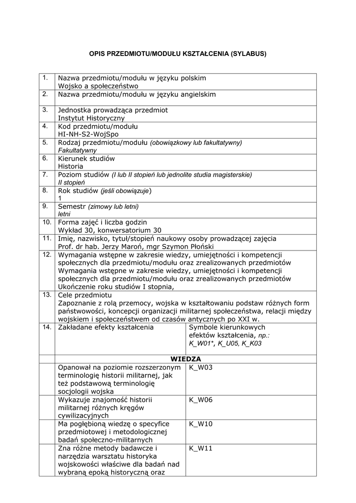 OPIS PRZEDMIOTU/MODUŁU KSZTAŁCENIA (SYLABUS) 1. 2. 3. 4. 5. 6. 7. 8. 9. 10. 11. 12. 13. 14. Nazwa przedmiotu/modułu w języku polskim Wojsko a społeczeństwo Nazwa przedmiotu/modułu w języku angielskim Jednostka prowadząca przedmiot Instytut Historyczny Kod przedmiotu/modułu HI-NH-S2-WojSpo Rodzaj przedmiotu/modułu (obowiązkowy lub fakultatywny) Fakultatywny Kierunek studiów Historia Poziom studiów (I lub II stopień lub jednolite studia magisterskie) II stopień Rok studiów (jeśli obowiązuje) 1 Semestr (zimowy lub letni) letni Forma zajęć i liczba godzin Wykład 30, konwersatorium 30 Imię, nazwisko, tytuł/stopień naukowy osoby prowadzącej zajęcia Prof. dr hab. Jerzy Maroń, mgr Szymon Płoński Wymagania wstępne w zakresie wiedzy, umiejętności i kompetencji społecznych dla przedmiotu/modułu oraz zrealizowanych przedmiotów Wymagania wstępne w zakresie wiedzy, umiejętności i kompetencji społecznych dla przedmiotu/modułu oraz zrealizowanych przedmiotów Ukończenie roku studiów I stopnia, Cele przedmiotu Zapoznanie z rolą przemocy, wojska w kształtowaniu podstaw różnych form państwowości, koncepcji organizacji militarnej społeczeństwa, relacji między wojskiem i społeczeństwem od czasów antycznych po XXI w. Zakładane efekty kształcenia Symbole kierunkowych efektów kształcenia, np.: K_W01*, K_U05, K_K03 WIEDZA Opanował na poziomie rozszerzonym K_W03 terminologię historii militarnej, jak też podstawową terminologię socjologii wojska Wykazuje znajomość historii K_W06 militarnej różnych kręgów cywilizacyjnych Ma pogłębioną wiedzę o specyfice K_W10 przedmiotowej i metodologicznej badań społeczno-militarnych Zna różne metody badawcze i K_W11 narzędzia warsztatu historyka wojskowości właściwe dla badań nad wybraną epoką historyczną oraz socjologa i historyka gospodarczego Posiada pogłębioną wiedzę K_W12 pozwalającą na przeprowadzenie krytyki, analizy i interpretacji różnorodnych źródeł w badaniach historyczno-wojskowych i społecznych. Ma pogłębioną wiedzę o źródłach K_W13 informacji . Rozumie ich przydatność w badaniach historycznych. Definiuje miejsce historii militarnej K_W14 wśród nauk historycznych i socjologii Rozumie i objaśnia pozycję i znaczenie historii militarnej w obszarze nauk humanistycznych i społecznych Rozumie powiązania K_W15 interdyscyplinarne historii militarnej i nauk pokrewnych z innymi naukami i obszarami nauk. Rozumie zastosowania metod i narzędzi innych dyscyplin naukowych w pracy historyka wojskowości Rozumie, że badania i debata K_W17 historyczna są procesem stałym, który niesie ze sobą nieustanne zmiany i rozwój poglądów. Rozumie wpływ podłoża narodowego K_W18 i kulturowego na różne stanowiska reprezentowane w badaniach historyczno-wojskowych i społecznych UMIEJĘTNOŚCI Samodzielnie zdobywa i pogłębia K_U01 wiedzę oraz doskonali umiejętności badawcze w sposób uporządkowany i systematyczny, wykorzystując nowoczesne techniki pozyskiwania, klasyfikowania i analizowania informacji. Potrafi scharakteryzować i ocenić K_U02 wzajemne relacje różnych kierunków badań historycznych takich jak historia militarna, polityczna, gospodarcza i społeczna Analizuje, interpretuje i wykorzystuje K_U06 dla potrzeb własnych badań źródła pisane oraz historiografię Analizuje, interpretuje i prezentuje K_U10 zebrane informacje w przejrzystej, usystematyzowanej i przemyślanej formie Wykorzystując zdobyte kompetencje K_U13 i doświadczenia badawcze formułuje w sposób krytyczny i uzasadnia własne opinie dotyczące ważnych zagadnień militarnych i politycznych. Argumentuje i uzasadnia swoje K_U14 stanowisko w dyskusji naukowej, wykorzystując wiedzę i własne doświadczenia badawcze, jak też poglądy reprezentantów różnych nurtów historiograficznych. Komunikuje się w języku ojczystym z K_U17 zastosowaniem profesjonalnej terminologii właściwej dla nauk historycznych i politycznych Korzysta z tradycyjnych i K_U21 współczesnych środków dla zdobycia informacji KOMPETENCJE PERSONALNE I SPOŁECZNE Rozwija swoje zainteresowania K_K06 fachowe, społeczne i kulturalne Wykazuje niezależność i K_K08 samodzielność myśli, szanując jednocześnie prawo innych osób do wykazywania tych samych cech. Jest zdolny do okazywania K_K09 zrozumienia dla świata wartości i postaw ludzi w różnych okresach i kontekstach historycznych 15. Treści programowe Organizacja militarna społeczeństwa. Rola armii w społeczeństwie i państwie od czasów antycznych do dziś. Polityczna rola armii. Źródła i ich charakterystyka 16. Zalecana literatura (podręczniki) Goffman Erving, Instytucje totalne : o pacjentach szpitali psychiatrycznych i mieszkańcach innych instytucji totalnych, przekł. Olena Waśkiewicz, Jacek Łaszcz. Sopot, 2011. Maroń Jerzy, Wojna trzydziestoletnia na Śląsku Aspekty militarne, RacibórzWrocław 2008. - Wokół teorii rewolucji militarnej. Wybrane problemy, Wrocław 2011 (=AUWr Historia, 180) Odziemkowski Janusz, Armia i społeczeństwo II Rzeczypospolitej, Warszawa 1996. Tymowski Michał, Karabin i władza w Afryce XIX wieku. Państwa i armie Samoriego i Kenedugu oraz ich analogie europejskie, Warszawa 1985, Urbańczyk Przemysław, Władza i polityka we wczesnym średniowieczu, Wrocław 2000 (i wyd. nast.) Wiatr Jerzy J. Socjologia wojska, Warszawa 1982. Wojsko i społeczeństwo w Trzecim Świecie, wyb. Ryszard Stemplowski, Warszawa 1979. Żmudzki Paweł, Władca i wojownicy : narracje o wodzach, drużynie i wojnach w najdawniejszej historiografii Polski i Rusi, Wrocław 2009. 17. Forma zaliczenia poszczególnych komponentów przedmiotu/modułu, sposób sprawdzenia osiągnięcia zamierzonych efektów kształcenia: wykład: aktywność na zajęciach seminarium: laboratorium: konwersatorium: aktywność na zajęciach inne: egzamin końcowy po II semestrze 18. Język wykładowy Polski 19. Obciążenie pracą studenta Forma aktywności st