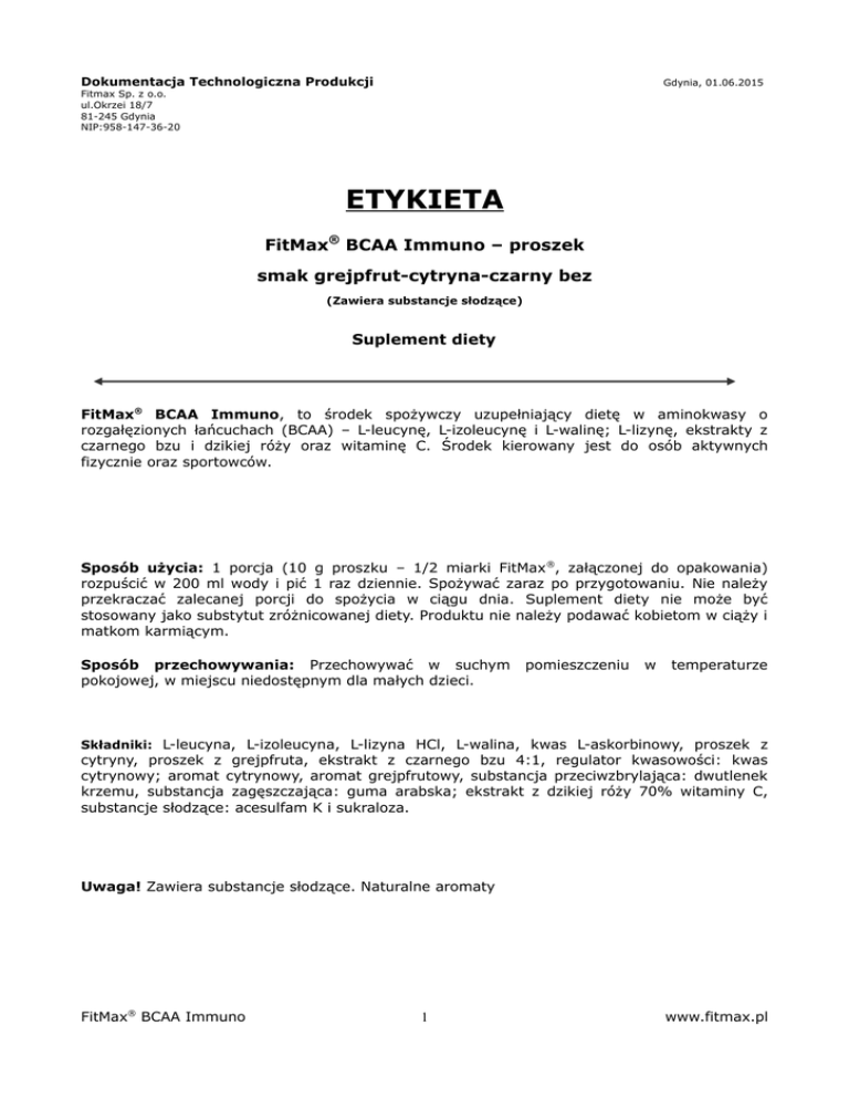 Dokumentacja Technologiczna Produkcji Gdynia, 01.06.2015 Fitmax Sp. z o.o. ul.Okrzei 18/7 81-245 Gdynia NIP:958-147-36-20 ETYKIETA FitMax® BCAA Immuno – proszek smak grejpfrut-cytryna-czarny bez (Zawiera substancje słodzące) Suplement diety FitMax® BCAA Immuno, to środek spożywczy uzupełniający dietę w aminokwasy o rozgałęzionych łańcuchach (BCAA) – L-leucynę, L-izoleucynę i L-walinę; L-lizynę, ekstrakty z czarnego bzu i dzikiej róży oraz witaminę C. Środek kierowany jest do osób aktywnych fizycznie oraz sportowców. Sposób użycia: 1 porcja (10 g proszku – 1/2 miarki FitMax ®, załączonej do opakowania) rozpuścić w 200 ml wody i pić 1 raz dziennie. Spożywać zaraz po przygotowaniu. Nie należy przekraczać zalecanej porcji do spożycia w ciągu dnia. Suplement diety nie może być stosowany jako substytut zróżnicowanej diety. Produktu nie należy podawać kobietom w ciąży i matkom karmiącym. Sposób przechowywania: Przechowywać w suchym pokojowej, w miejscu niedostępnym dla małych dzieci. pomieszczeniu w temperaturze Składniki: L-leucyna, L-izoleucyna, L-lizyna HCl, L-walina, kwas L-askorbinowy, proszek z cytryny, proszek z grejpfruta, ekstrakt z czarnego bzu 4:1, regulator kwasowości: kwas cytrynowy; aromat cytrynowy, aromat grejpfrutowy, substancja przeciwzbrylająca: dwutlenek krzemu, substancja zagęszczająca: guma arabska; ekstrakt z dzikiej róży 70% witaminy C, substancje słodzące: acesulfam K i sukraloza. Uwaga! Zawiera substancje słodzące. Naturalne aromaty FitMax® BCAA Immuno 1 www.fitmax.pl Dokumentacja Technologiczna Produkcji Gdynia, 01.06.2015 Fitmax Sp. z o.o. ul.Okrzei 18/7 81-245 Gdynia NIP:958-147-36-20 Tabela do etykiety FitMax® BCAA Immuno smak grejpfrut-cytryna-czarny bez SKŁADNIKI AKTYWNE w porcji (10 g) L-leucyna* L-izoleucyna* L-walina* L-lizyna HCl w tym L-lizyna 2500 1250 1250 1250 1000 Ekstrakt z czarnego bzu Ekstrakt z dzikiej róży Witamina C mg mg mg mg mg 200 mg 50 mg 1050 mg (1312,5% RWS**) * – aminokwasy rozgałęzione (BCAA) ** – dzienna referencyjna wartość spożycia dla osoby dorosłej Masa netto: 600 g Najlepiej spożyć przed: ......... (dd/mm/rr) Data minimalnej trwałości jest jednocześnie oznaczeniem partii produkcyjnej. Producent: Fitmax Sp. z o.o. ul. Okrzei 18/7 81-245 Gdynia, Polska tel./fax: +48 (58) 629 11 20 [email protected] www.fitmax.pl FitMax® BCAA Immuno Made in EU 2 www.fitmax.pl