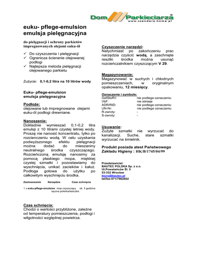 euku- pflege-emulsion emulsja pielęgnacyjna do pielęgnacji i ochrony parkietów impregnowanych olejami euku-öl Do czyszczenia i pielęgnacji Ogranicza ścieranie olejowanej podłogi Najlepsza metoda pielęgnacji olejowanego parkietu ZuŜycie: 0,1-0,2 litra na 10 litrów wody Euku- pflege-emulsion emulsja pielęgnacyjna PodłoŜe: olejowane lub impregnowane olejami euku-öl podłogi drewniane. Nanoszenie: Dokładnie wymieszać 0,1-0,2 litra emulsji z 10 litrami czystej letniej wody. Proszę nie nanosić koncentratu, tylko po rozcienczeniu wodą. W celu uzyskania podwyŜszonego efektu pielęgnacji dodać do mieszaniny moŜna neutralnego środka czyszczącego. Rozcieńczoną emulsję nanosimy za pomocą płaskiego mopa, miękkiej czystej szmatki i pozostawiamy do wyschnięcia, unikać zacieków i kałuŜ. po Podłoga gotowa do uŜytku całkowitym wyschnięciu środka. Zastosowanie Narzędzia Czas schnięcia 1 x euku-pflege-emulsion mop czyszczący ok. 1 godzina ręczna polerka/łasiczka Czas schnięcia: Chodzi o wartości przybliŜone, zaleŜne od temperatury pomieszczenia, podłogi i wilgotności względnej powietrza. Czyszczenie narzędzi: Natychmiast po zakończeniu prac narzędzia czyścić wodą, a zaschnięte resztki środka moŜna usunąć rozcieńczalnikiem czyszczącym V 29. Magazynowanie: Magazynować w suchych i chłodnych pomieszczeniach, w oryginalnym opakowaniu, 12 miesięcy. Oznaczenie i symbole: GefStoffV: nie podlega oznaczeniu VbF: nie istnieje ADR/RID: nie podlega oznaczeniu UN-Nr: nie podlega oznaczeniu R-zwroty: S-zwroty: - Usuwanie: ZuŜyte szmatki nie wyrzucać do kanalizacji. Suche, stare szmatki wyrzucać na śmietnik. Produkt posiada atest Państwowego Zakładu Higieny : HK/B/1745/04/99 Przedstawiciel: BAUTEC POLSKA Sp. z o.o. Ul.Powstańców Śl. 5 53-332 Wrocław [email protected] tel/fax:071/7962602