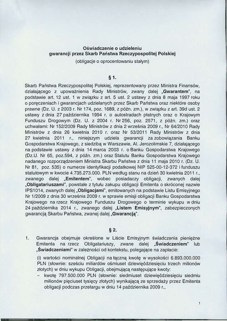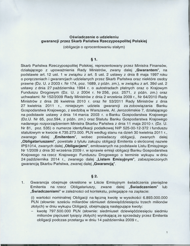 Oświadczenie o udzieleniu gwarancji przez Skarb Państwa Rzeczypospolitej Polskiej (obligacje o oprocentowaniu stałym) §1. Skarb Państwa Rzeczypospolitej Polskiej, reprezentowany przez Ministra Finansów, działającego z upoważnienia Rady Ministrów, zwany dalej „Gwarantem", na podstawie art. 12 ust. 1 w związku z art. 5 ust. 2 ustawy z dnia 8 maja 1997 roku o poręczeniach i gwarancjach udzielanych przez Skarb Państwa oraz niektóre osoby prawne (Dz. U. z 2003 r. Nr 174, poz. 1689, z późn. zm.), w związku z art. 39d ust. 2 ustawy z dnia 27 października 1994 r. o autostradach płatnych oraz o Krajowym Funduszu Drogowym (Dz. U. z 2004 r. Nr 256, poz. 2571, z późn. zm.) oraz uchwałami: Nr 152/2009 Rady Ministrów z dnia 2 września 2009 r., Nr 64/2010 Rady Ministrów z dnia 26 kwietnia 2010 r. oraz Nr 53/2011 Rady Ministrów z dnia 27 kwietnia 2011 r., niniejszym udziela gwarancji za zobowiązania Banku Gospodarstwa Krajowego, z siedzibą w Warszawie, Al. Jerozolimskie 7, działającego na podstawie ustawy z dnia 14 marca 2003 r. o Banku Gospodarstwa Krajowego (Dz.U. Nr 65, poz.594, z późn. zm.) oraz Statutu Banku Gospodarstwa Krajowego nadanego rozporządzeniem Ministra Skarbu Państwa z dnia 11 maja 2010 r. (Dz. U. Nr 81, poz. 535) o numerze identyfikacji podatkowej NIP 525-00-12-372 i funduszu statutowym w kwocie 4.735.273.000. PLN według stanu na dzień 30 kwietnia 2011 r., zwanego dalej „Emitentem", wobec posiadaczy obligacji, zwanych dalej „Obligatariuszami", powstałe z tytułu zakupu obligacji Emitenta o skróconej nazwie IPS1014, zwanych dalej „Obligacjami", emitowanych na podstawie Listu Emisyjnego Nr 1/2009 z dnia 30 września 2009 r. w sprawie emisji obligacji Banku Gospodarstwa Krajowego na rzecz Krajowego Funduszu Drogowego o terminie wykupu w dniu 24 października 2014 r., zwanego dalej „Listem Emisyjnym", zabezpieczonych gwarancją Skarbu Państwa, zwanej dalej „Gwarancją". §2. 1. Gwarancja obejmuje określone w Liście Emisyjnym świadczenia pieniężne Emitenta na rzecz Obligatariuszy, zwane dalej „Świadczeniem" lub „Świadczeniami" w zależności od kontekstu, polegające na zapłacie: (i) wartości nominalnej Obligacji na łączną kwotę w wysokości 6.893.000.000 PLN (słownie: sześciu miliardów ośmiuset dziewięćdziesięciu trzech milionów złotych) w dniu wykupu Obligacji, obejmującą następujące kwoty: - kwotę 797.500.000 PLN (słownie: siedmiuset dziewięćdziesięciu siedmiu milionów pięciuset tysięcy złotych) wynikającą ze sprzedaży przez Emitenta obligacji podczas przetargu w dniu 14 października 2009 r., 1 - - - - kwotę 1.500.000.000 PLN (słownie: jednego miliarda pięciuset milionów złotych) wynikającą ze sprzedaży przez Emitenta obligacji podczas przetargu w dniu 4 listopada 2009 r., kwotę 3.031.500.000 PLN (słownie: trzech miliardów trzydziestu jeden milionów pięciuset tysięcy złotych) wynikającą ze sprzedaży przez Emitenta obligacji podczas przetargu w dniu 9 czerwca 2010 r., kwotę 650.000.000 PLN (słownie: sześciuset pięćdziesięciu milionów złotych) wynikającą ze sprzedaży przez Emitenta obligacji podczas przetargu w dniu 25 maja 2011 r., kwotę 914.000.000 PLN (słownie: dziewięciuset czternastu milionów złotych) wynikającą ze sprzedaży przez Emitenta obligacji podczas przetargu w dniu 27 lipca 2011 r., (ii) kwoty należnej z Obligacji (wartość nominalna oraz odsetki od Obligacji) w dniu ich wcześniejszego wykupu, w przypadku wejścia w życie ustawy o likwidacji Emitenta, określonym w Liście Emisyjnym, oraz (iii) odsetek od Obligacji w terminach ich płatności, określonych w Liście Emisyjnym, - przy czym odpowiedzialność Gwaranta z tytułu Gwarancji jest ograniczona do wysokości 8.478.390.000 PLN (słownie: ośmiu miliardów czterystu siedemdziesięciu ośmiu milionów trzystu dziewięćdziesięciu tysięcy złotych), zwanej dalej „Kwotą Gwarancji". 2. Łączna kwota gwarancji wykonania zobowiązań wynikających z wyemitowania przez Bank Gospodarstwa Krajowego obligacji na rzecz Krajowego Funduszu Drogowego na podstawie wszystkich listów emisyjnych wydawanych przez Bank Gospodarstwa Krajowego, w terminie do 31 grudnia 2009 r. w związku z uchwałą Nr 152/2009 Rady Ministrów z dnia 2 września 2009 r., w terminie do dnia 31 grudnia 2010 r. w związku z uchwałą Nr 64/2010 Rady Ministrów z dnia 26 kwietnia 2010 r. oraz w terminie do dnia 31 grudnia 2011 r. w związku z uchwałą Nr 53/2011 Rady Ministrów z dnia 27 kwietnia 2011 r., obejmująca 100% kwoty zobowiązań wynikających z emisji obligacji, tj. 100% kwoty wykupu obligacji stanowiącej ich wartość nominalną w kwocie odpowiednio 7.250.000.000 PLN (słownie: siedmiu miliardów dwustu pięćdziesięciu milionów złotych), w kwocie 7.900.000.000 (słownie: siedmiu miliardów dziewięciuset milionów złotych), w kwocie 10.700.000.000 (słownie: dziesięciu miliardów siedmiuset milionów złotych) oraz 100% odsetek, nie może przewyższyć łącznej wartości 43.492.420.000 PLN (słownie: czterdziestu trzech miliardów czterystu dziewięćdziesięciu dwóch milionów czterystu dwudziestu tysięcy złotych). 3. Gwarant niniejszym nieodwołalnie, bezwarunkowo i na pierwsze żądanie, gwarantuje Obligatariuszom należytą i terminową płatność wymagalnych Świadczeń. 2 §3. 1. Gwarancja stanowi samodzielne zobowiązanie Gwaranta wobec Obligatariuszy, jako beneficjentów Gwarancji, do dokonania płatności Świadczeń w złotych polskich w przypadkach określonych w niniejszym Oświadczeniu. 2. Gwarant, z zastrzeżeniem wysokości odpowiedzialności Gwaranta, o której mowa w § 2 ust. 1, dokona w terminie płatności Świadczenia, zwanym dalej „Dniem Świadczenia", zapłaty kwoty równej kwocie należnego Świadczenia lub należnych Świadczeń określonych w § 2 ust. 1 (i) oraz (iii) na rachunek prowadzony przez Krajowy Depozyt Papierów Wartościowych, jeżeli do godziny 10.00 (słow