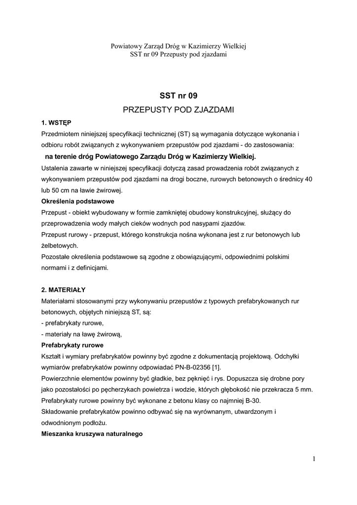 Powiatowy Zarząd Dróg w Kazimierzy Wielkiej SST nr 09 Przepusty pod zjazdami SST nr 09 PRZEPUSTY POD ZJAZDAMI 1. WSTĘP Przedmiotem niniejszej specyfikacji technicznej (ST) są wymagania dotyczące wykonania i odbioru robót związanych z wykonywaniem przepustów pod zjazdami - do zastosowania: na terenie dróg Powiatowego Zarządu Dróg w Kazimierzy Wielkiej. Ustalenia zawarte w niniejszej specyfikacji dotyczą zasad prowadzenia robót związanych z wykonywaniem przepustów pod zjazdami na drogi boczne, rurowych betonowych o średnicy 40 lub 50 cm na ławie żwirowej. Określenia podstawowe Przepust - obiekt wybudowany w formie zamkniętej obudowy konstrukcyjnej, służący do przeprowadzenia wody małych cieków wodnych pod nasypami zjazdów. Przepust rurowy - przepust, którego konstrukcja nośna wykonana jest z rur betonowych lub żelbetowych. Pozostałe określenia podstawowe są zgodne z obowiązującymi, odpowiednimi polskimi normami i z definicjami. 2. MATERIAŁY Materiałami stosowanymi przy wykonywaniu przepustów z typowych prefabrykowanych rur betonowych, objętych niniejszą ST, są: - prefabrykaty rurowe, - materiały na ławę żwirową, Prefabrykaty rurowe Kształt i wymiary prefabrykatów powinny być zgodne z dokumentacją projektową. Odchyłki wymiarów prefabrykatów powinny odpowiadać PN-B-02356 [1]. Powierzchnie elementów powinny być gładkie, bez pęknięć i rys. Dopuszcza się drobne pory jako pozostałości po pęcherzykach powietrza i wodzie, których głębokość nie przekracza 5 mm. Prefabrykaty rurowe powinny być wykonane z betonu klasy co najmniej B-30. Składowanie prefabrykatów powinno odbywać się na wyrównanym, utwardzonym i odwodnionym podłożu. Mieszanka kruszywa naturalnego 1 Powiatowy Zarząd Dróg w Kazimierzy Wielkiej SST nr 09 Przepusty pod zjazdami Mieszanka do wykonania ławy fundamentowej powinna spełniać wymagania PN-B-06712 [5]. 3. SPRZĘT Sprzęt do wykonania przepustów Wykonawca przystępujący do wykonania przepustów pod zjazdami powinien wykazać się możliwością korzystania z następującego sprzętu: - koparek, sprzętu do zagęszczania: ubijaki ręczne i mechaniczne, zagęszczarki płytowe. 4. TRANSPORT Transport materiałów do budowy przepustów pod zjazdami podano w ST nr 08 „Przepusty pod koroną drogi”. 5. WYKONANIE ROBÓT Roboty przygotowawcze Wykonawca zobowiązany jest do przygotowania terenu budowy w zakresie: - odwodnienia, - wytyczenia osi przepustu i krawędzi wykopu, - innych robót podanych w dokumentacji projektowej i ST. Wykop Sposób wykonywania robót ziemnych pod fundamenty ścianek czołowych i ławę fundamentową powinien być dostosowany do wielkości przepustu, głębokości wykopu, ukształtowania terenu i rodzaju gruntu. Wykop należy wykonywać w takim okresie, aby po ich zakończeniu można było przystąpić do wykonywania przepustu. Ława fundamentowa pod przepust Ława fundamentowa powinna być wykonana zgodnie z dokumentacją projektową i ST. Jeżeli dokumentacja projektowa nie stanowi inaczej to ława fundamentowa może być wykonana: - z kruszywa naturalnego stabilizowanego mechanicznie, zgodnie z wymaganiami SST nr 07 Dopuszczalne odchyłki dla ław fundamentowych przepustów wynoszą: - dla wymiarów w planie ± 5 cm, dla rzędnych wierzchu ławy ± 2 cm. Układanie prefabrykatów rurowych Układanie rur betonowych lub żelbetowych należy wykonać wg BN-74/9191-01 [18]. Styki rur należy wypełnić zaprawą cementową wg pkt 2 i uszczelnić materiałem wg pkt 2 zaakceptowanym przez Inżyniera. 2 Powiatowy Zarząd Dróg w Kazimierzy Wielkiej SST nr 09 Przepusty pod zjazdami Zasypka przepustów Zasypkę (mieszanka, piasek, grunt rodzimy) należy układać jednocześnie z obu stron przepustu, warstwami o jednakowej grubości z jednoczesnym zagęszczaniem. Wilgotność zasypki w czasie zagęszczania powinna odpowiadać wilgotności optymalnej wg normalnej próby Proctora, metodą I wg PN-B-04481 [2] z tolerancją -20%, +10%. Wskaźnik zagęszczenia poszczególnych warstw powinien być zgodny z dokumentacją projektową i ST. 6. KONTROLA JAKOŚCI ROBÓT Kontrolę jakości robót należy wykonać zgodnie z ST nr 08 „Przepusty pod koroną drogi” pkt 6. 7. OBMIAR ROBÓT Jednostka obmiarowa Jednostką obmiarową jest m (metr) wykonanego przepustu. 8. ODBIÓR ROBÓT Roboty uznaje się za wykonane zgodnie z dokumentacją projektową, ST i wymaganiami Inżyniera, jeżeli wszystkie pomiary i badania z zachowaniem tolerancji wg pkt 6 dały wyniki pozytywne. 9. PODSTAWA PŁATNOŚCI Cena wykonania 1 m przepustu obejmuje: - roboty pomiarowe i przygotowawcze, - dostarczenie materiałów, - wykonanie ław fundamentowych, - wykonanie deskowania i rozebranie, - montaż konstrukcji przepustu, - betonowanie konstrukcji fundamentu i ścianki czołowej, - wykonanie izolacji, - wykonanie zasypki i zagęszczenie, - uporządkowanie terenu, - przeprowadzenie pomiarów wymaganych w specyfikacji technicznej. 3 Powiatowy Zarząd Dróg w Kazimierzy Wielkiej SST nr 09 Przepusty pod zjazdami 10. PRZEPISY ZWIĄZANE NORMY 1. PN-B-02356 Tolerancja wymiarowa w budownictwie. Tolerancja wymiarowa elementów budowlanych z betonu 2. PN-B-04481 Grunty budowlane. Badania próbek i gruntu 3. PN-B-06251 Roboty betonowe i żelbetowe. Wymagania techniczne 4. PN-B-06253 Konstrukcje betonowe. Warunki wykonania i ochrony w środowisku agresywnych wód gruntowych 5. PN-B-06712 Kruszywo mineralne do betonu 6. PN-B-14501 Zaprawy budowlane zwykłe 7. PN-B-19701 Cement. Cement powszechnego użytku. Skład, wymagania i ocena zgodności 8. PN-B-24622 Roztwór asfaltowy do gruntowania 9. PN-B-32250 Materiały budowlane. Woda do betonów i zapraw 10. PN-C-96177 Lepik asfaltowy bez wypełniaczy stosowany na gorąco 11. PN-D-95017 Surowiec drzewny. Drewno tartaczne iglaste 12. PN-D-96000 Tarcica iglasta ogólnego przeznaczenia 13. PN-S-96012 Drogi samochodowe. Podbudowa i ulepszone podłoże z gruntu stabilizowanego cementem. 14. BN